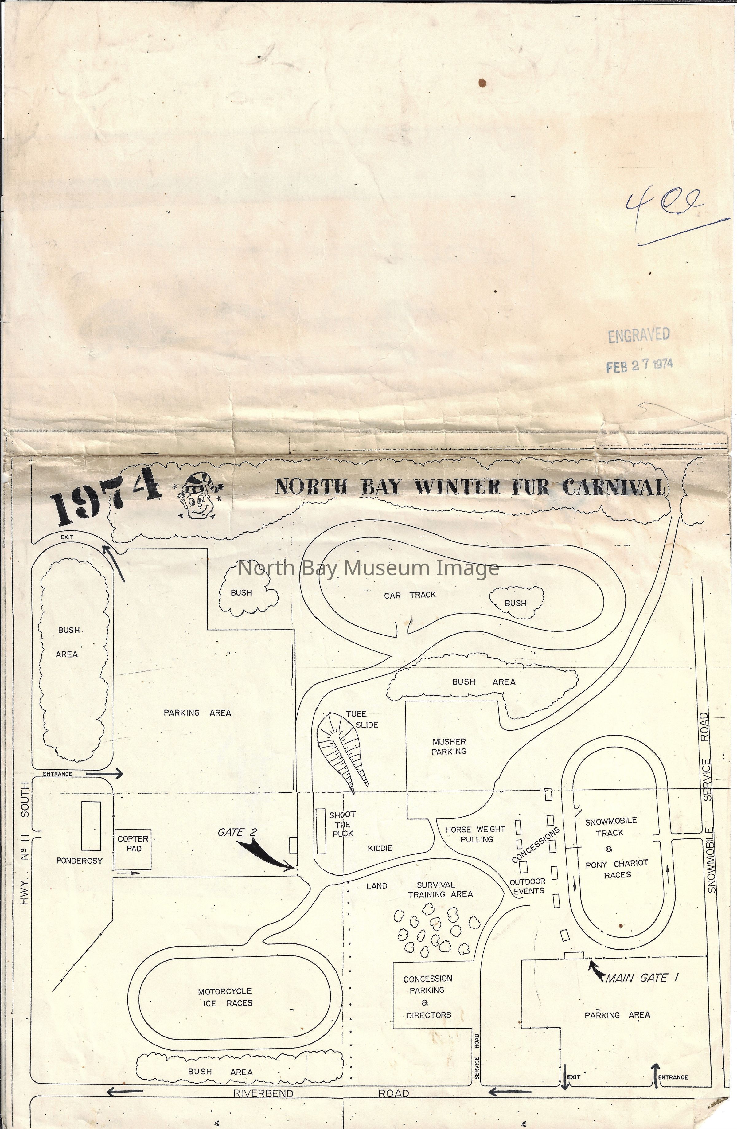 022.01.176e: 1974 Fur Carnival Map located North of Highway 11 South and East of Riverbend Road. Includes parking, car track, snowmobile track, musher parking, tube slide, kiddie land, pony races and motorcycle track.