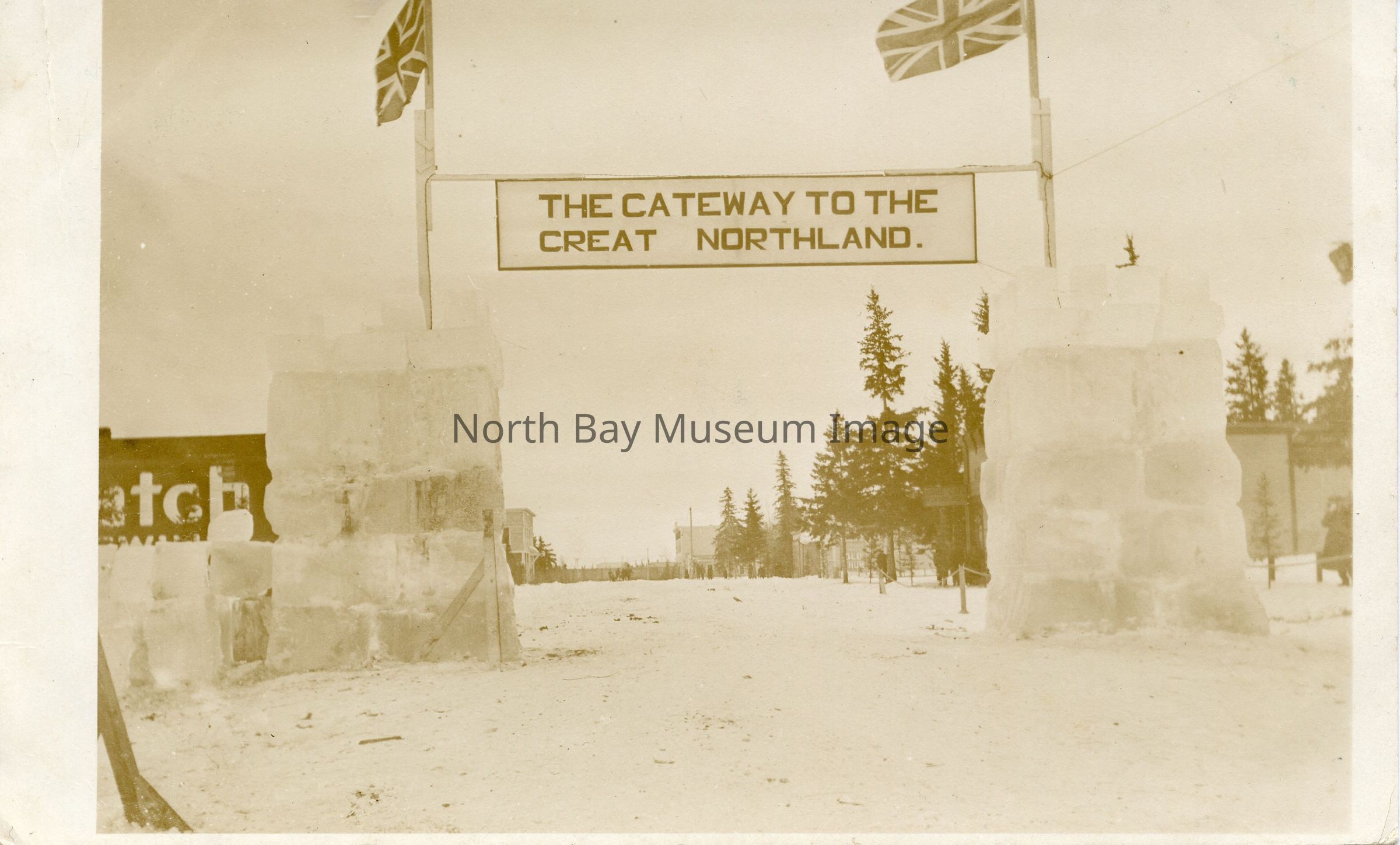Postcard with sepia image of two pillars made of ice blocks, spaced 15 feet apart to allow vehicles to pass under the sign that reads "The Gateway to the Great Northland". Unoin Jack flags fly from each of the pillars. According to museum volunteers, this photo was likely taken in Latchford (not North Bay).