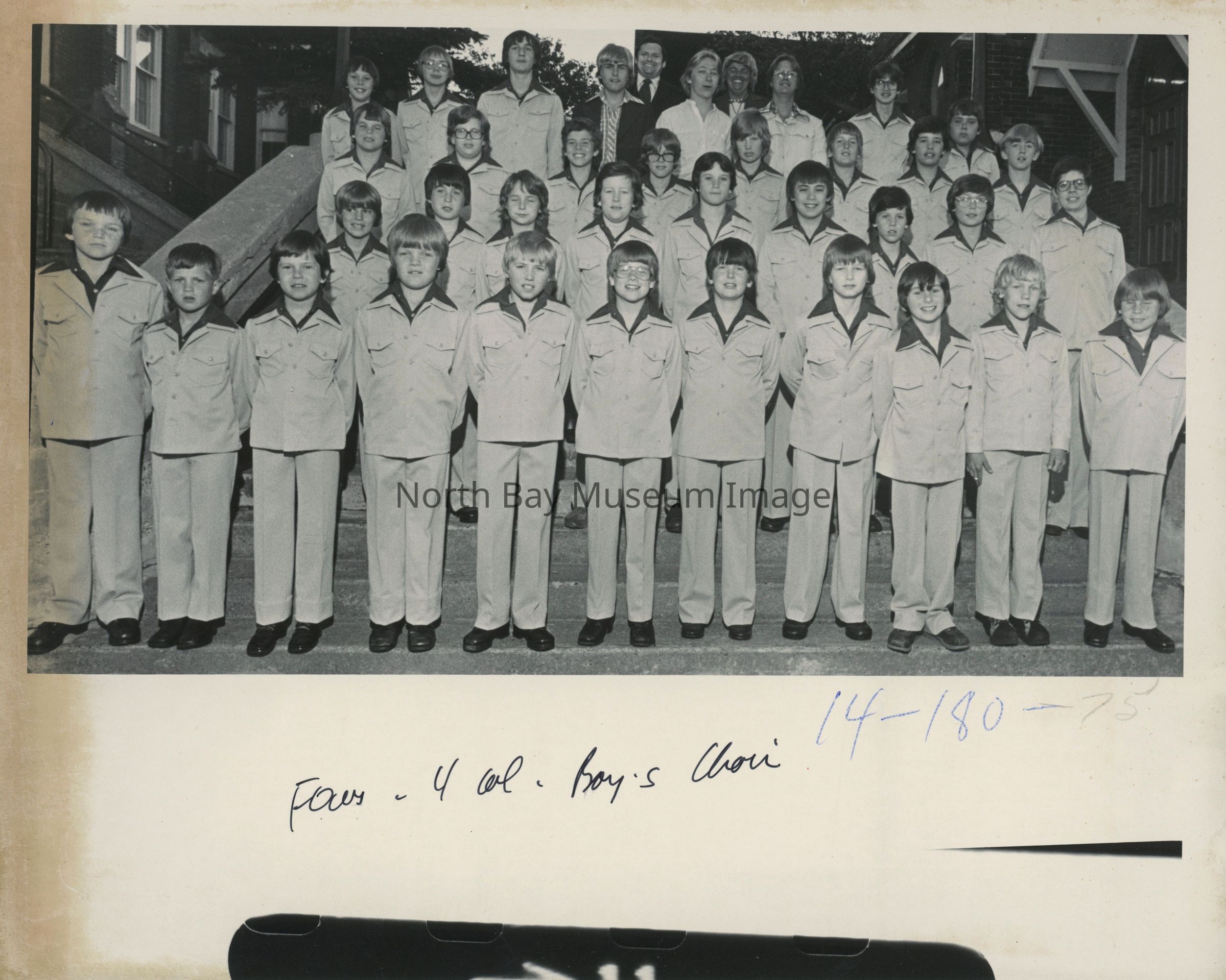 Photos of North Bay boys choir which was later renamed Interlink. 022.01.113i: Brown and white logo of boy singing.