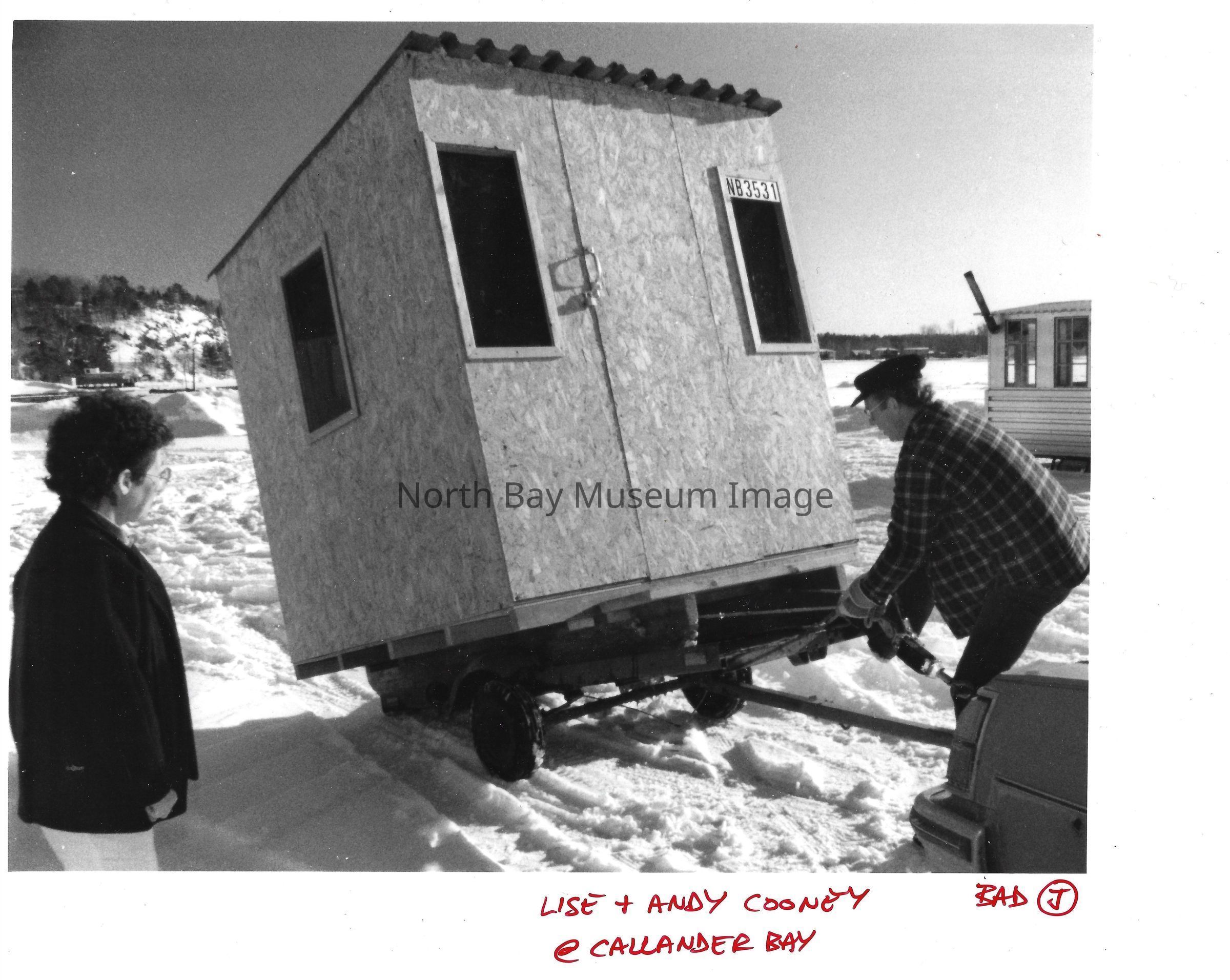 Lise and Andy Cooney tow their ice hut in the spring. See Nugget article "A Telltale sign of Spring." March 20th, 1989 pp. 1