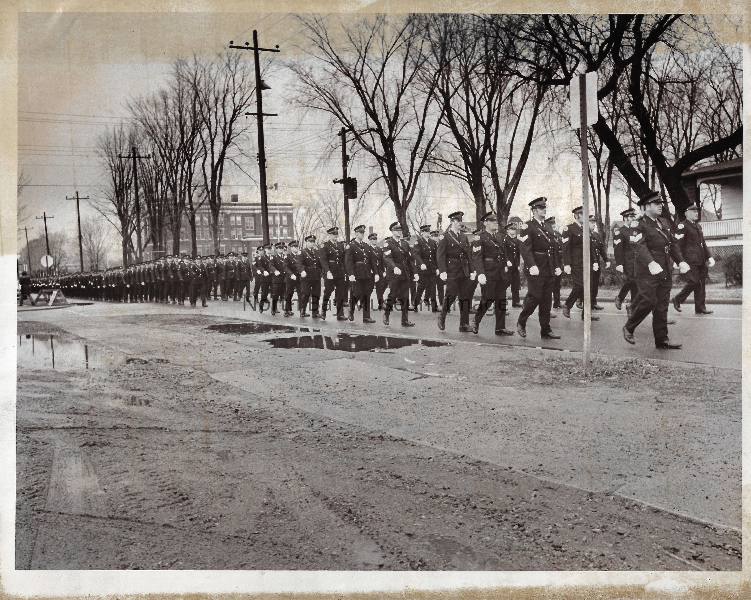 Uniformed Officers marching east on First ave. The teachers college and cenotaph are visible in the background.