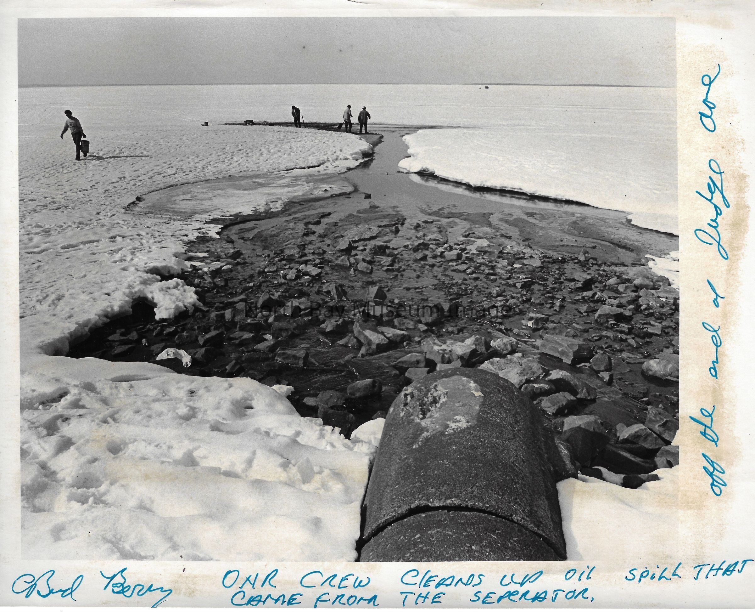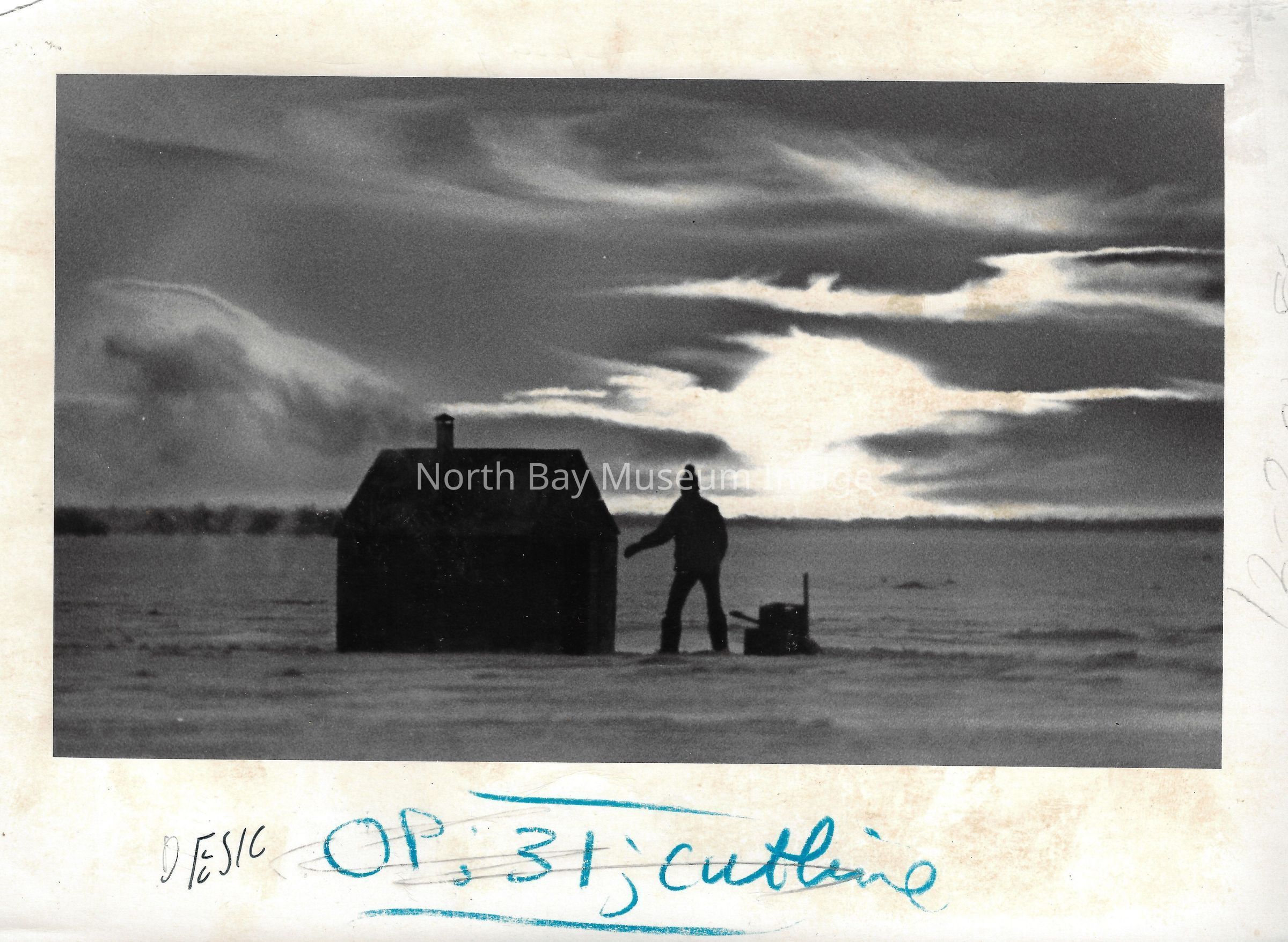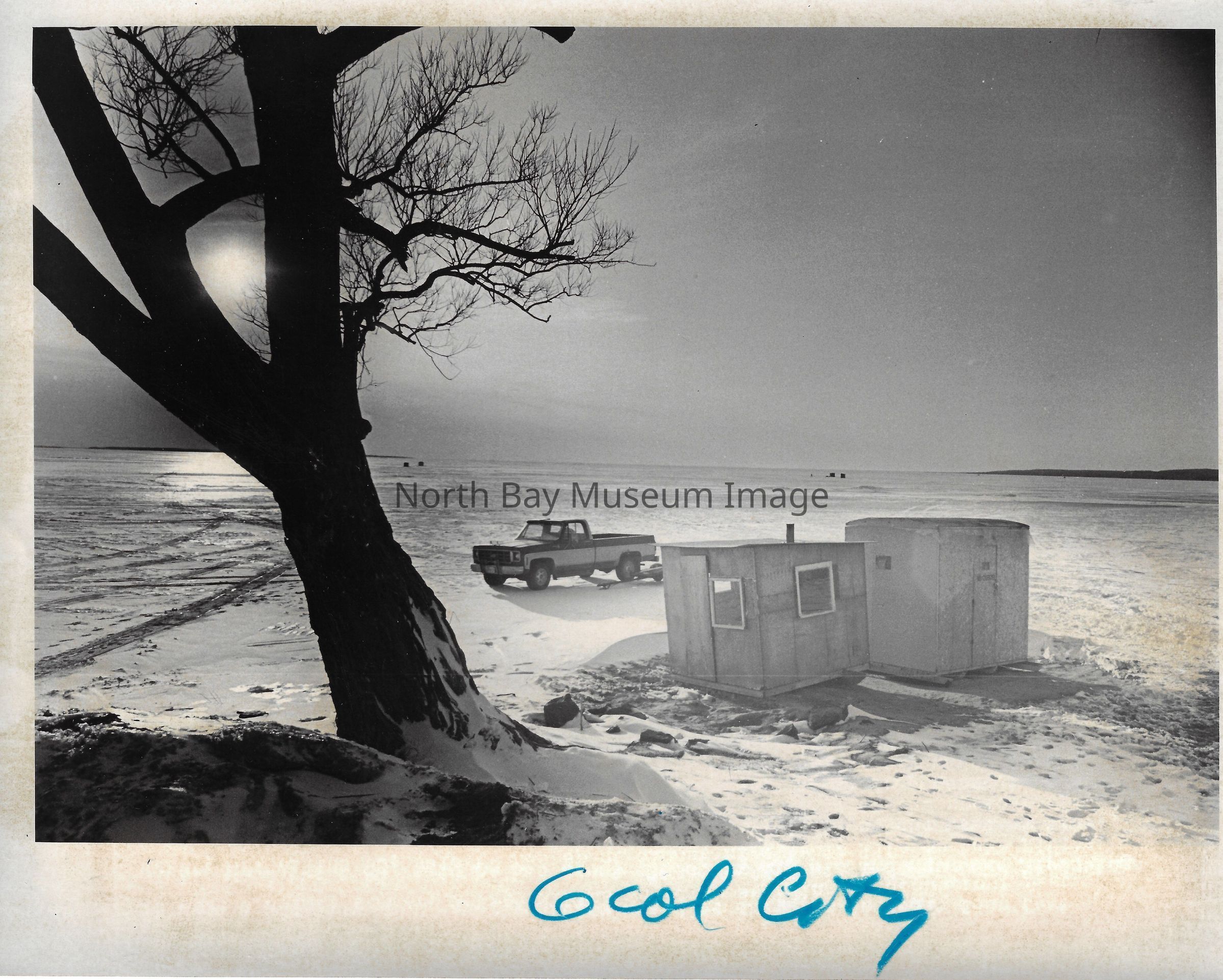 Photos of fishing huts on Lake Nipissing, an ice jam approaching government dock, and a plaque outlining its prehistoric geology.