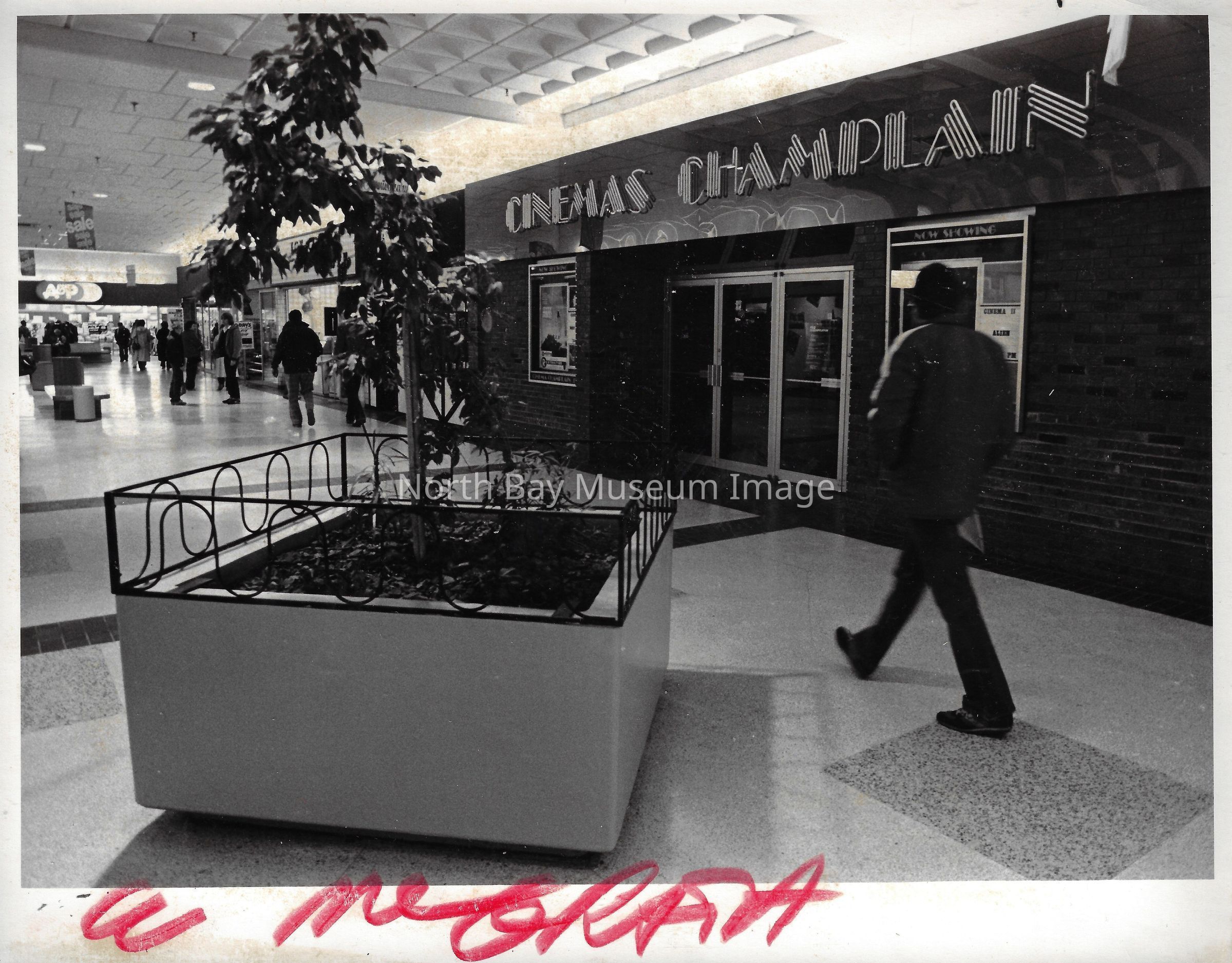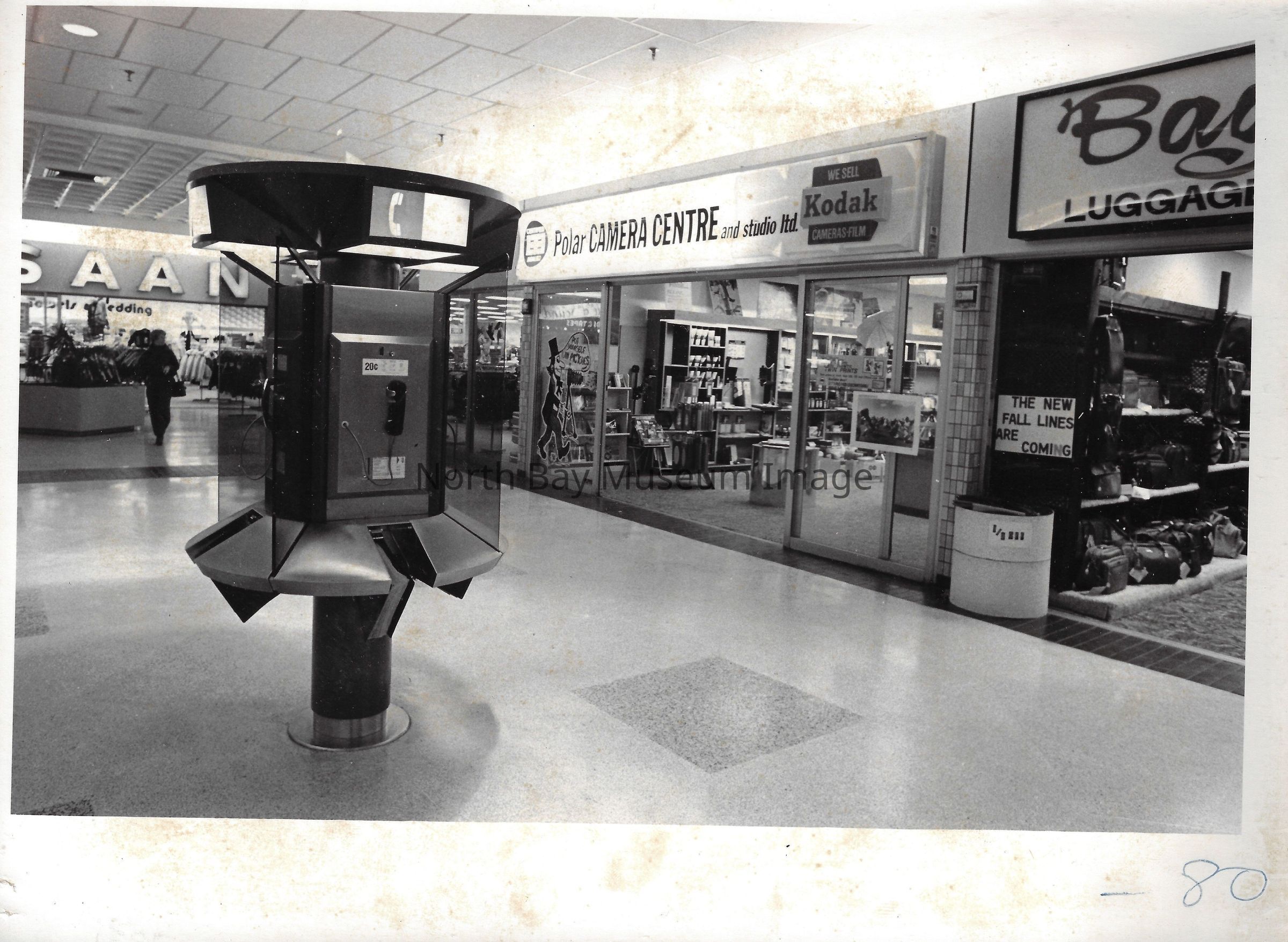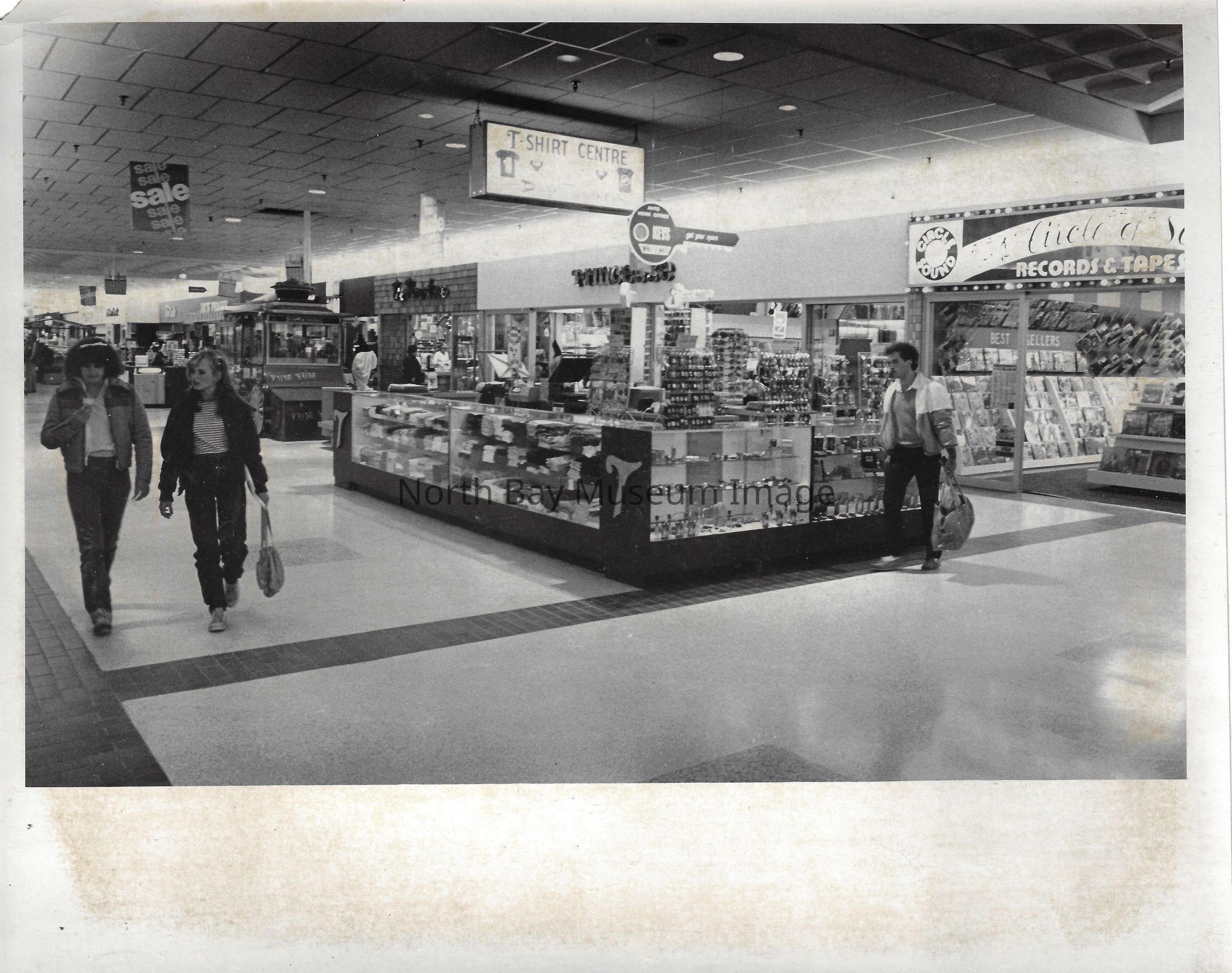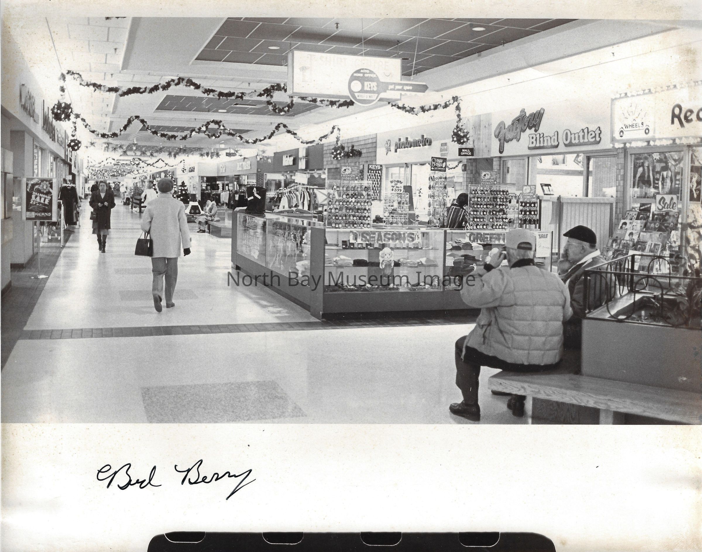 General photos of mall fountain and christmas decorations. Photos of stores in North Bay Mall including North Bay Lighting, Records on Wheels, Smart Set, Reitman's, Gallenkamp shoes, Woolco, Cinemas Champlain, Happy Hour, K Mart, Royal Bank, Polar Camera Centre, Samuel's Cafe, People's Jewellers, A&P, Dapper Don, Suzy Shier and C.J.'s Hobbies.Date(s) of Creation