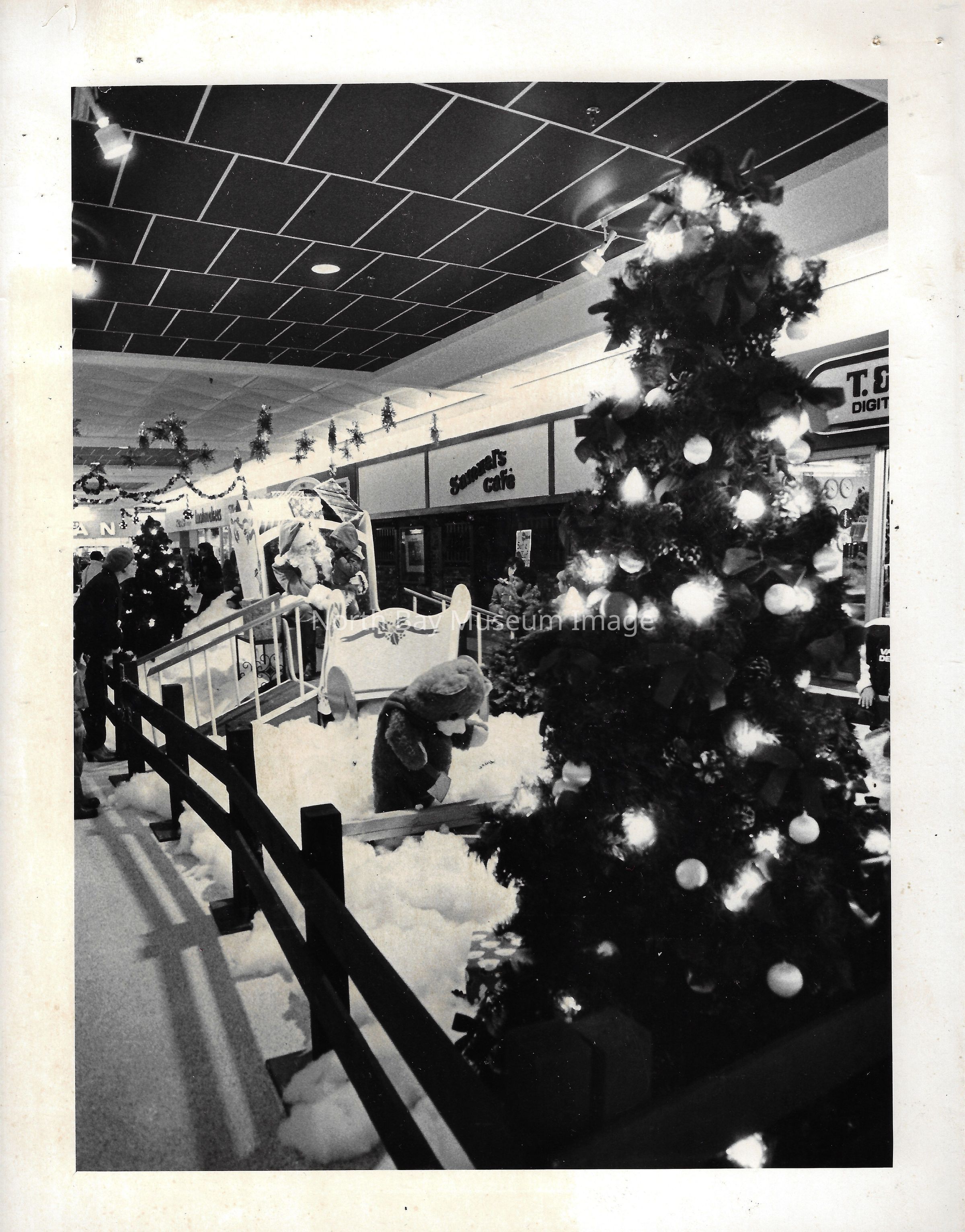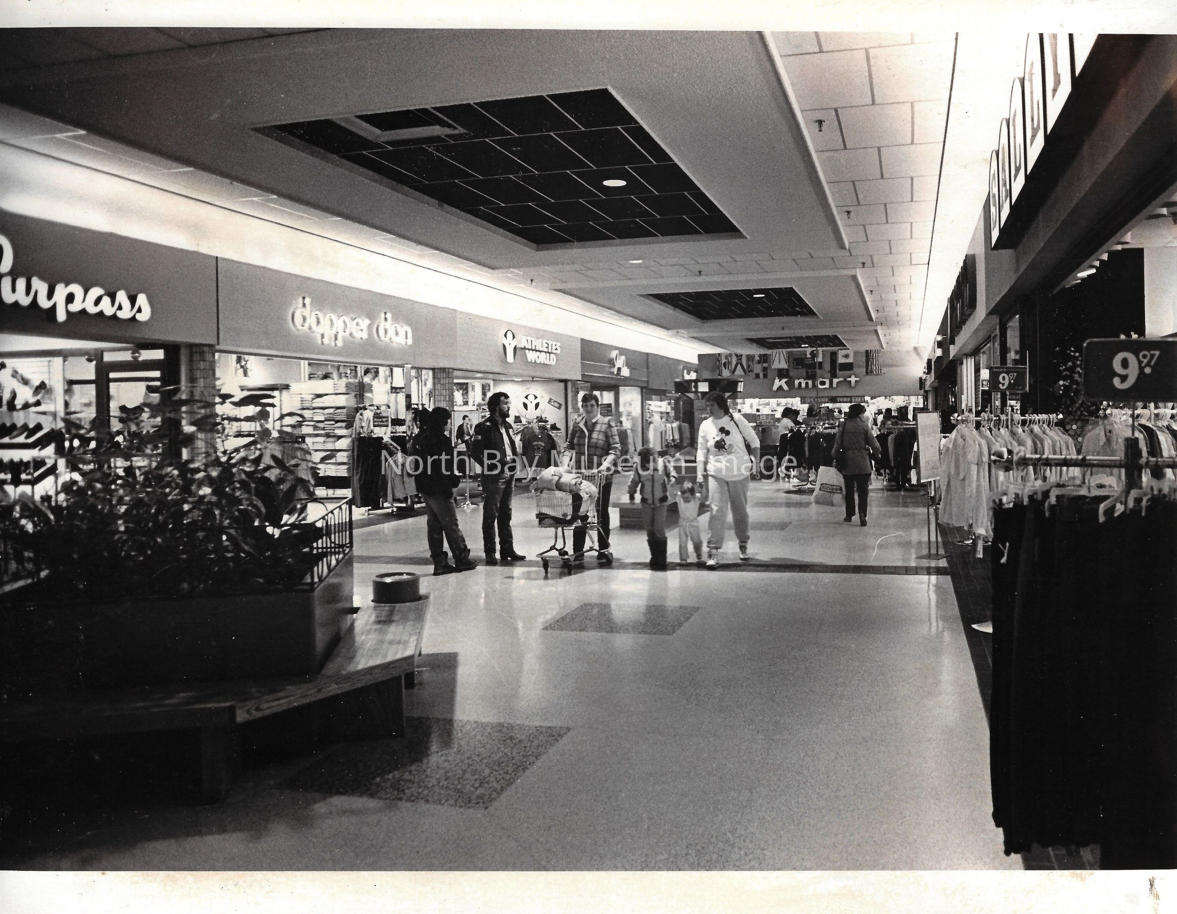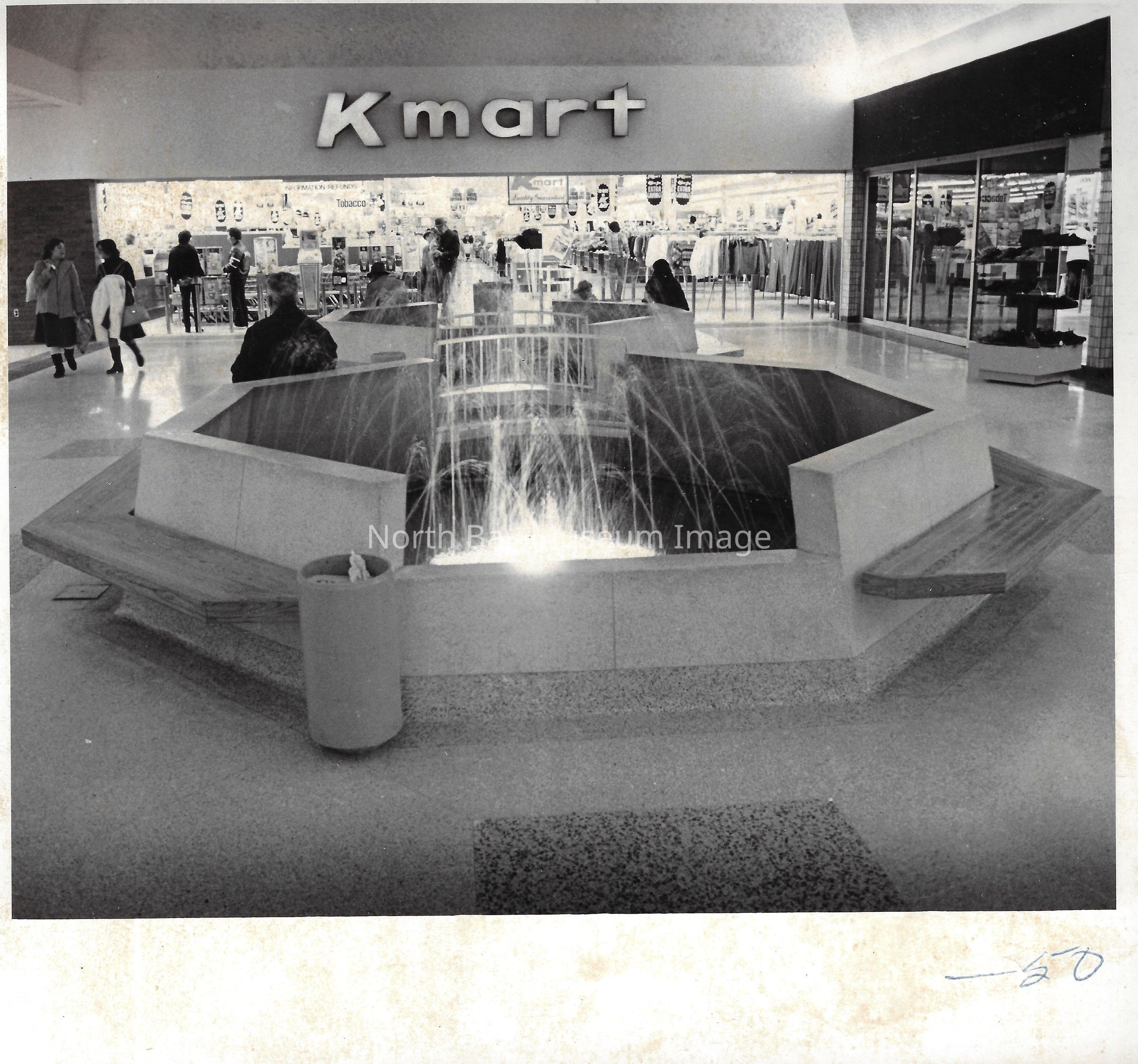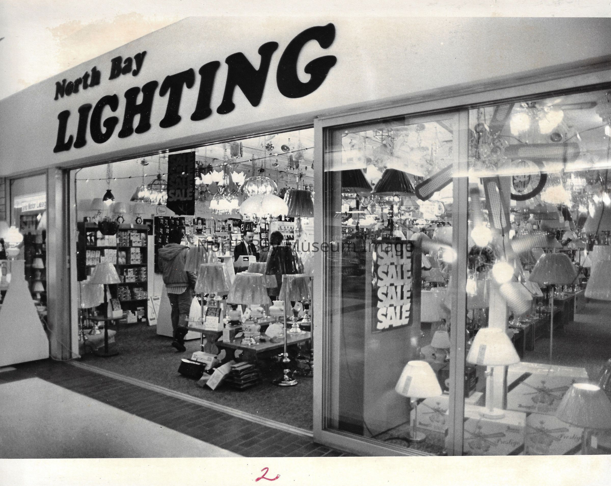 General photos of mall fountain and christmas decorations. Photos of stores in North Bay Mall including North Bay Lighting, Records on Wheels, Smart Set, Reitman's, Gallenkamp shoes, Woolco, Cinemas Champlain, Happy Hour, K Mart, Royal Bank, Polar Camera Centre, Samuel's Cafe, People's Jewellers, A&P, Dapper Don, Suzy Shier and C.J.'s Hobbies.Date(s) of Creation