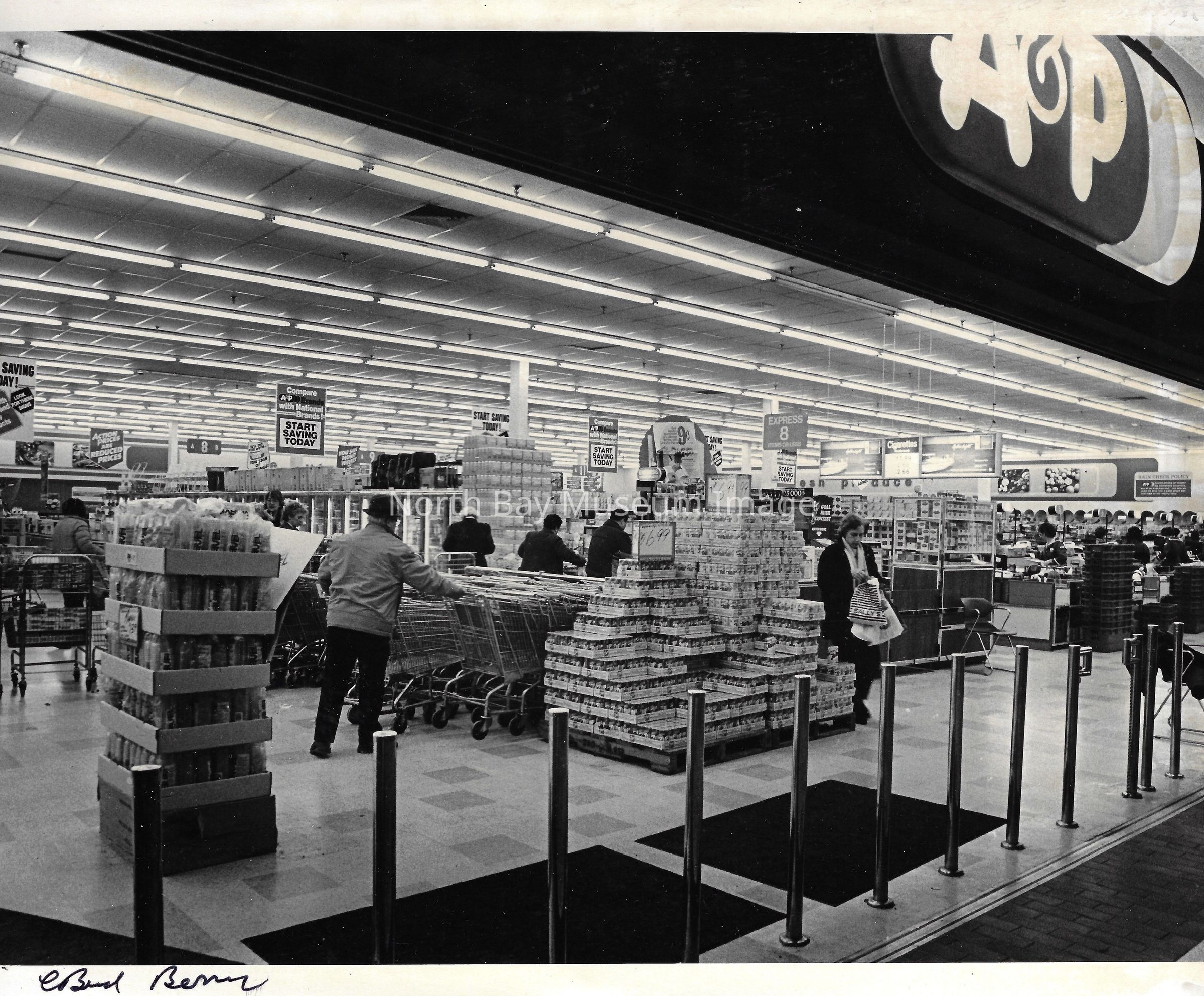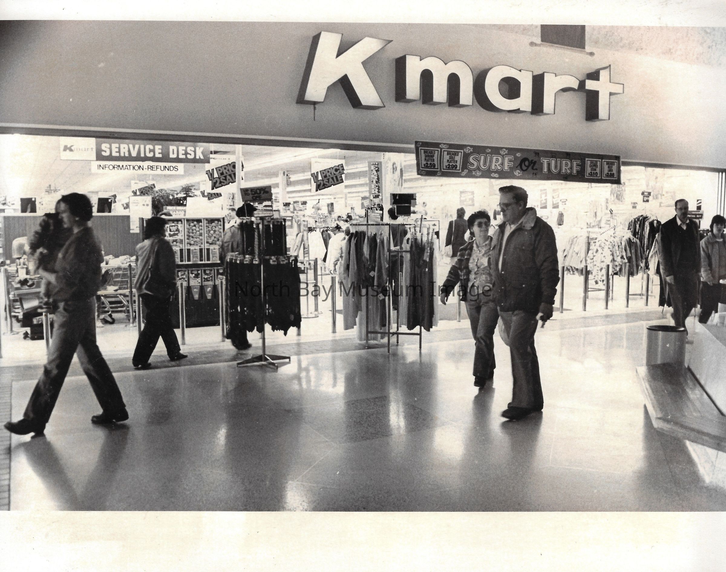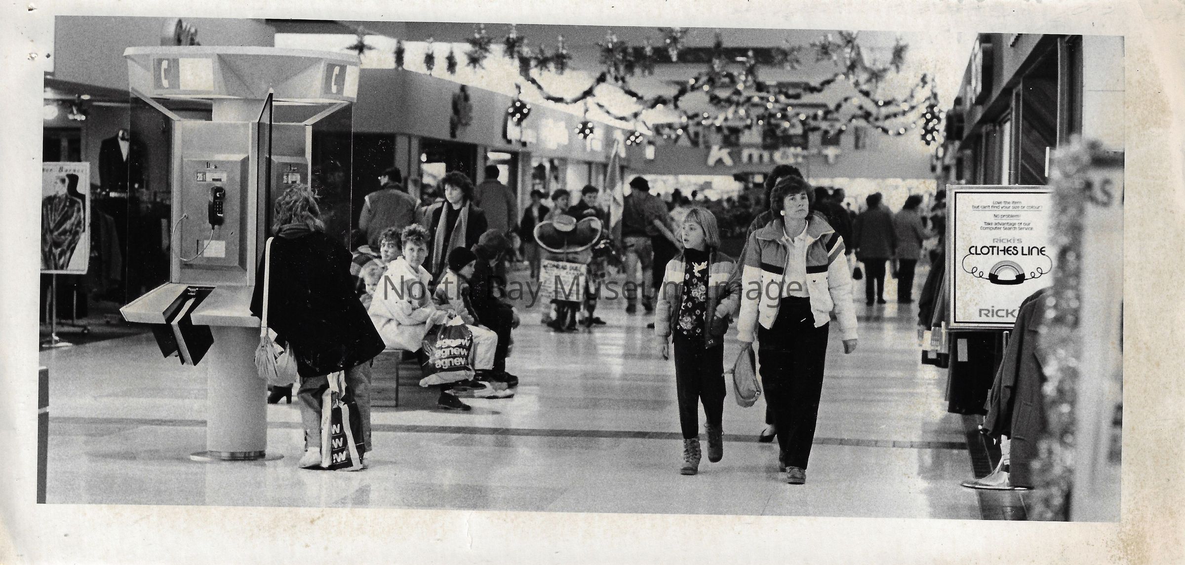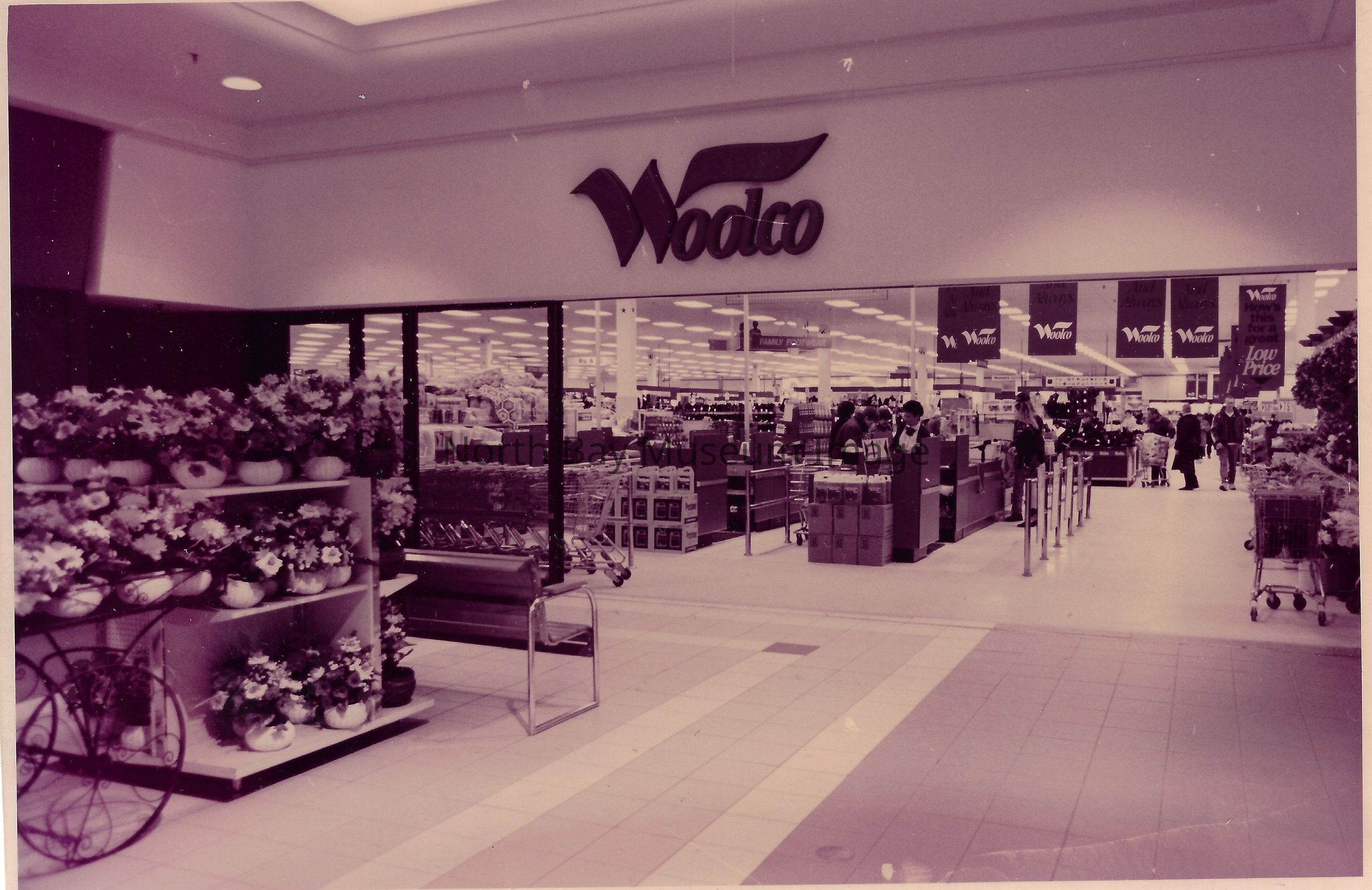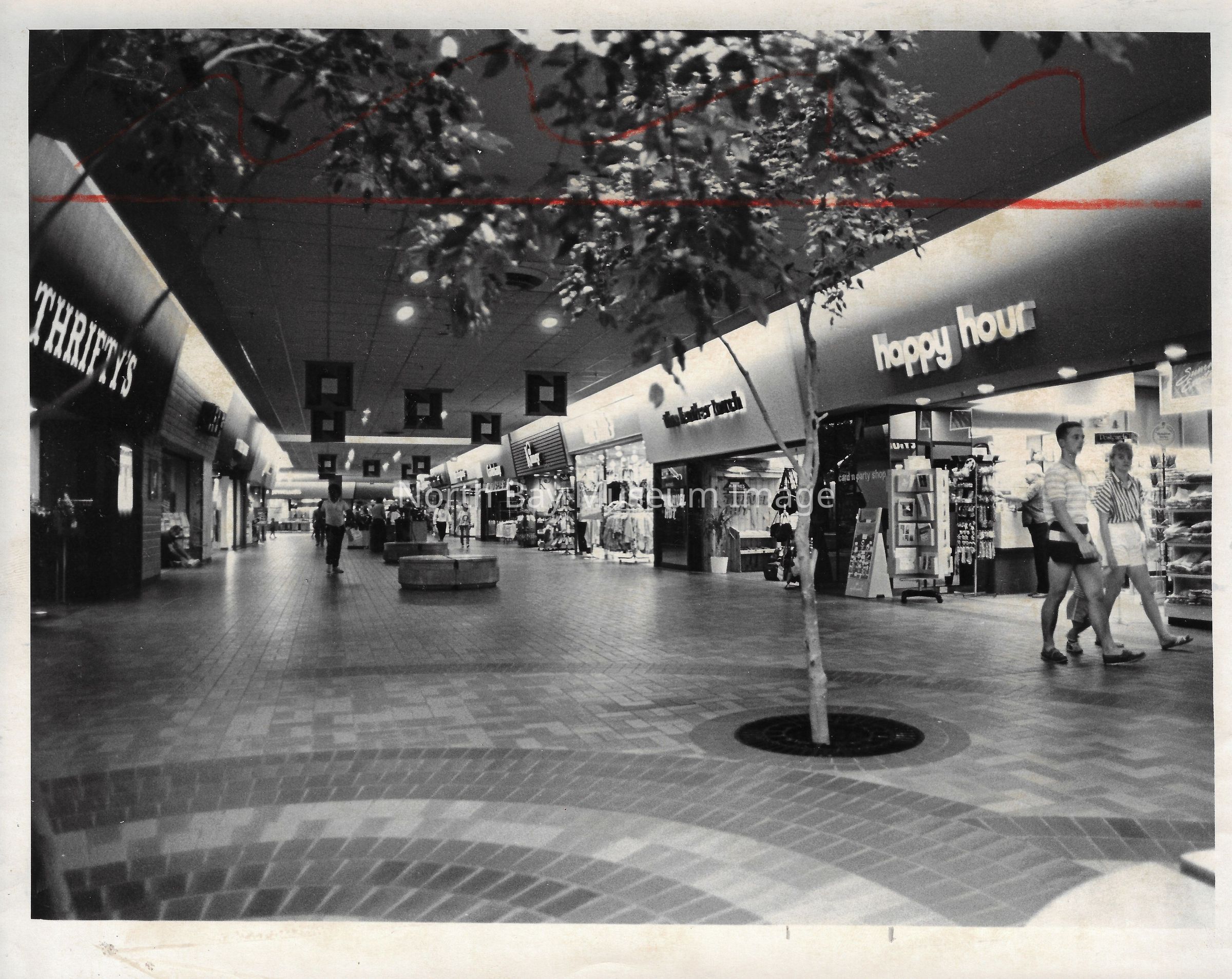 General photos of mall fountain and christmas decorations. Photos of stores in North Bay Mall including North Bay Lighting, Records on Wheels, Smart Set, Reitman's, Gallenkamp shoes, Woolco, Cinemas Champlain, Happy Hour, K Mart, Royal Bank, Polar Camera Centre, Samuel's Cafe, People's Jewellers, A&P, Dapper Don, Suzy Shier and C.J.'s Hobbies.Date(s) of Creation