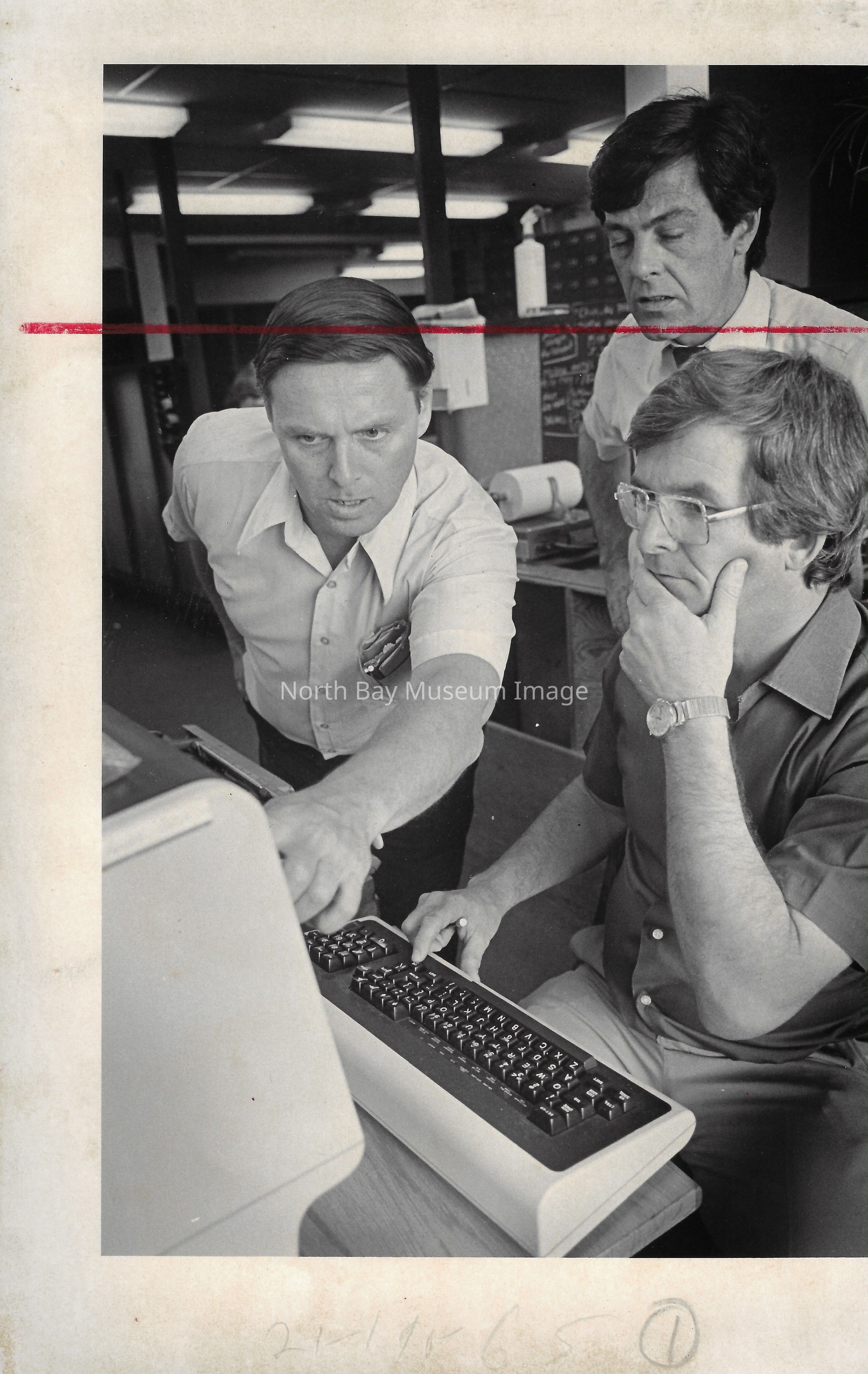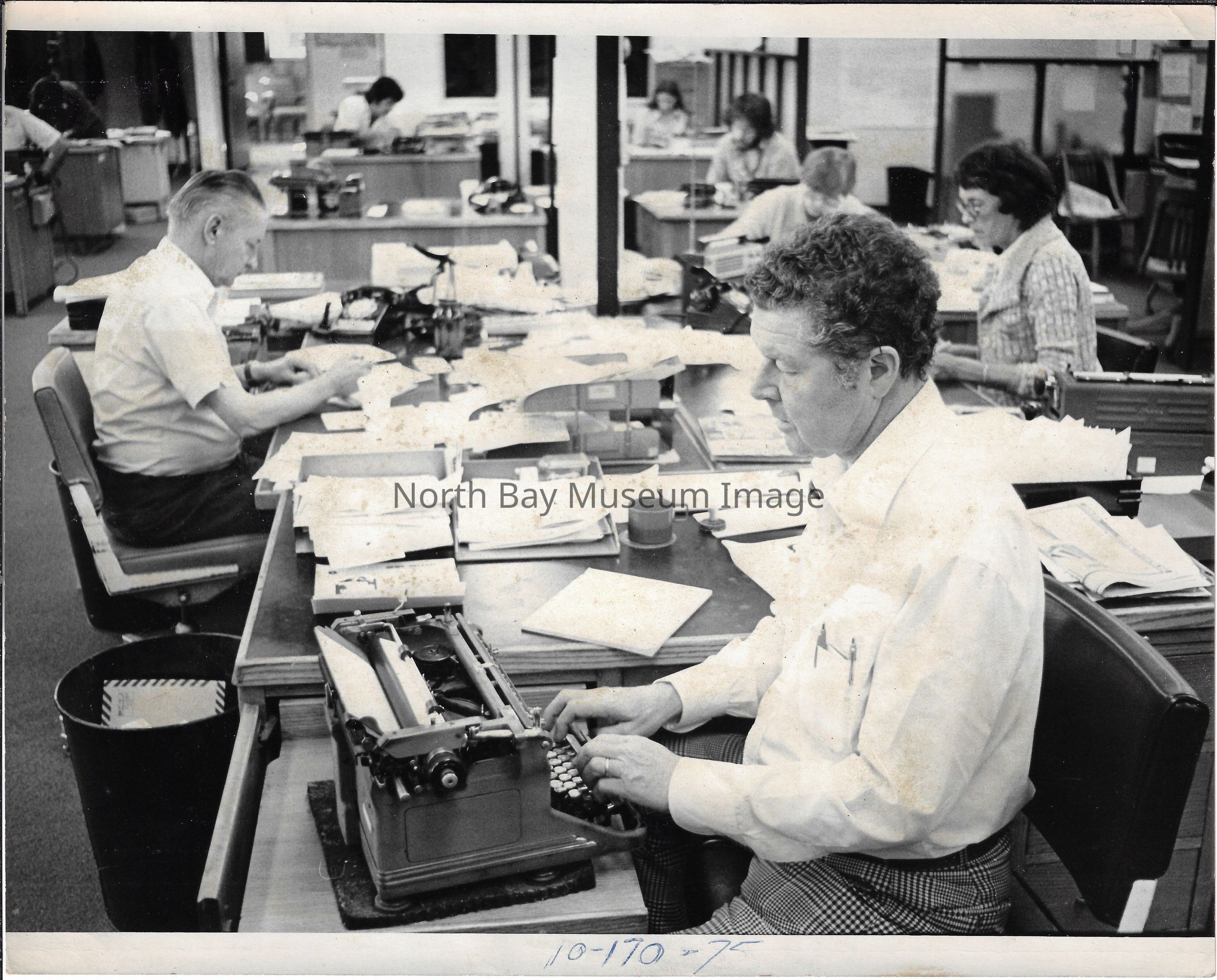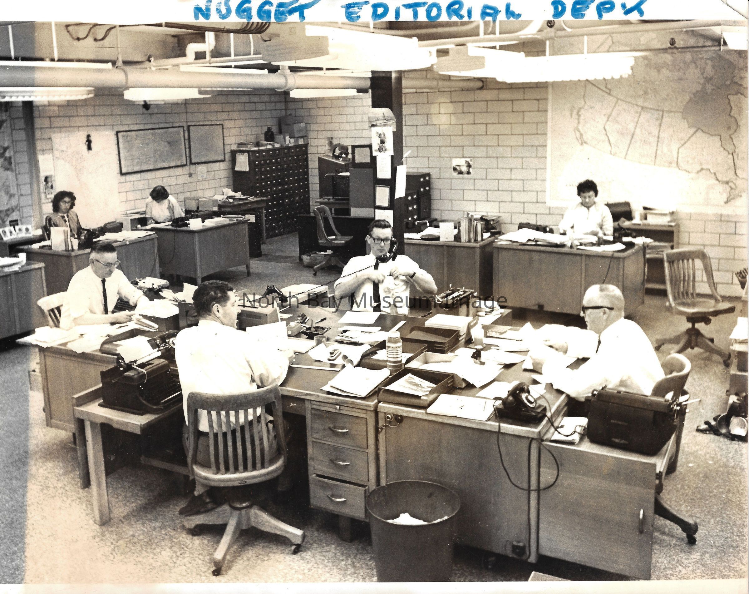 022.01.70r: Editorial department. Brett, Don Buckley, Colin, & Mort. Betty Alcorn in the news department on far left. Middle desk was called “the rim”.