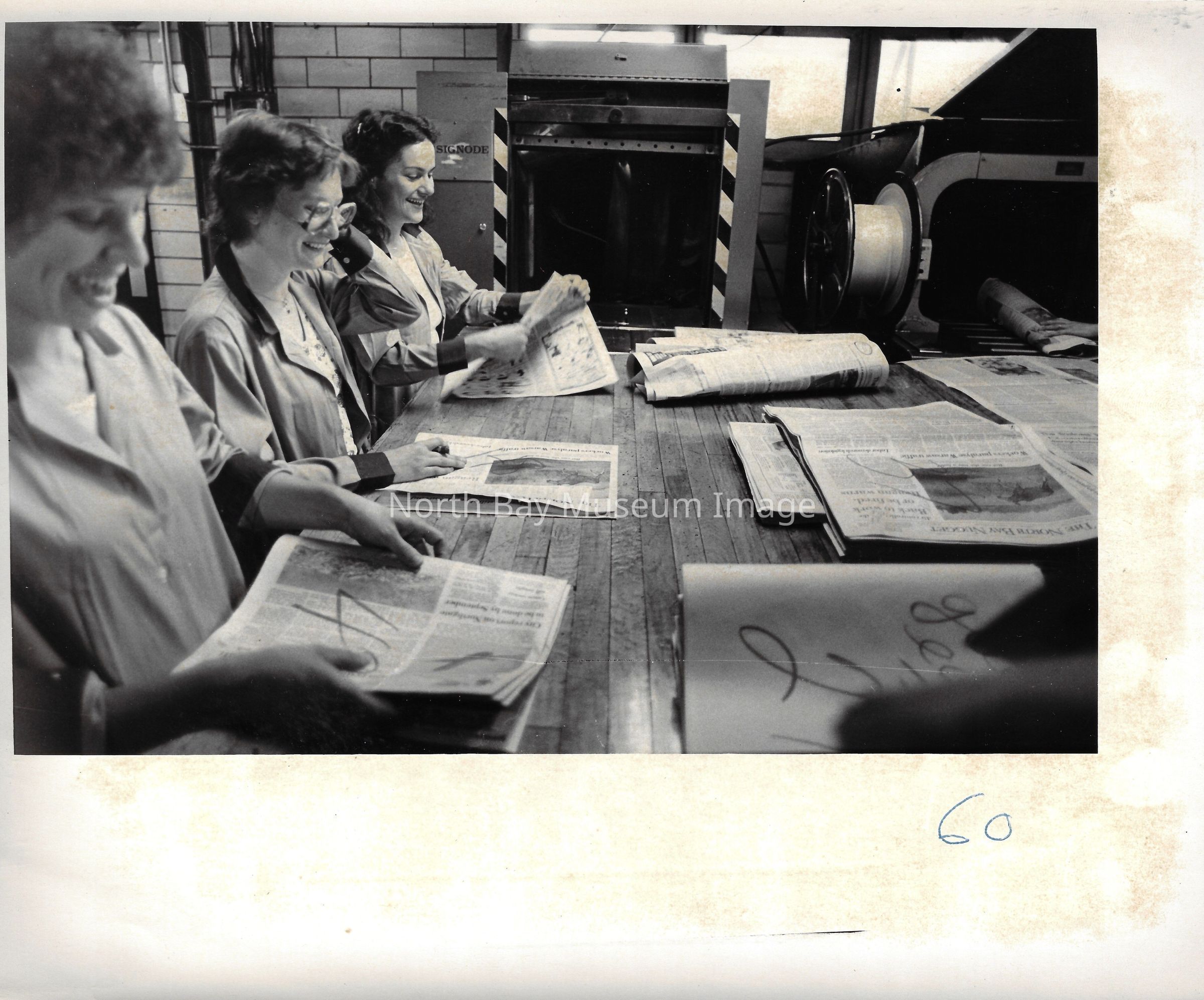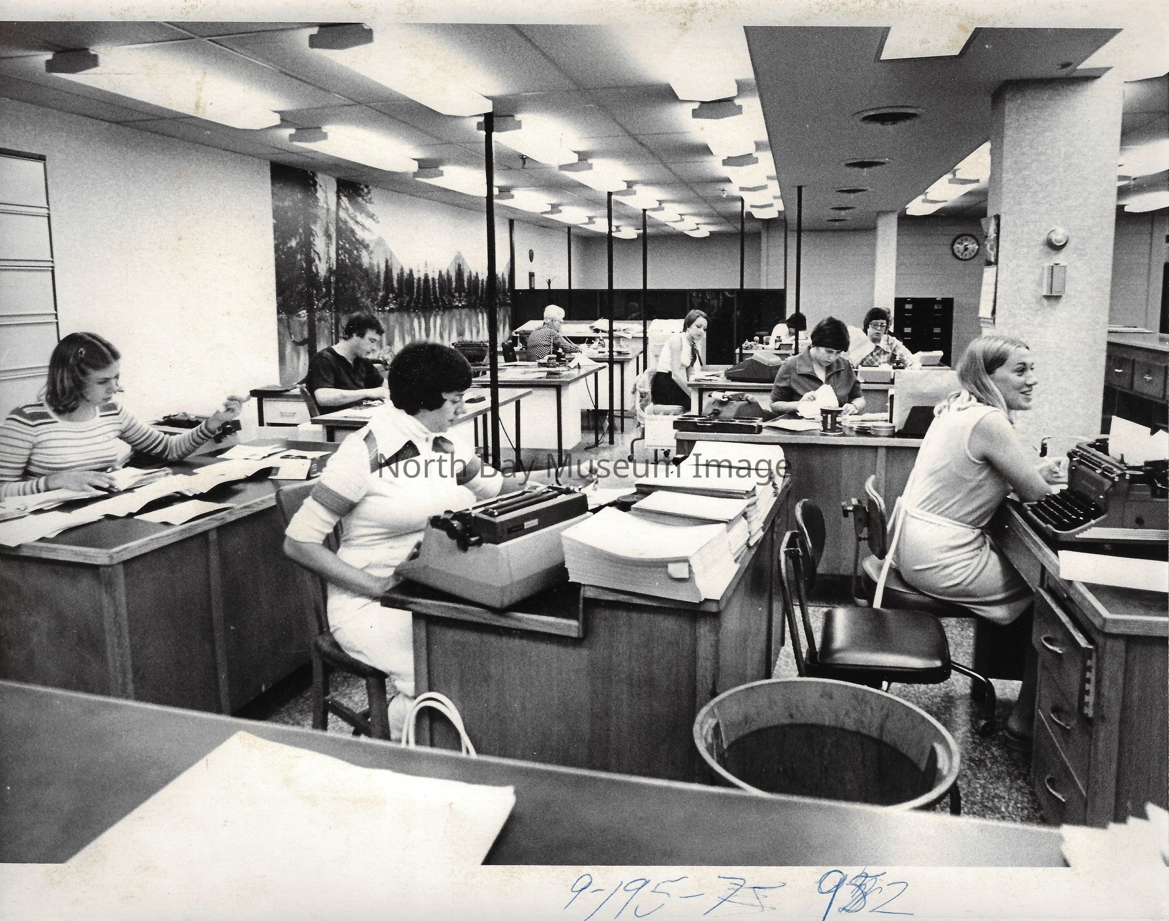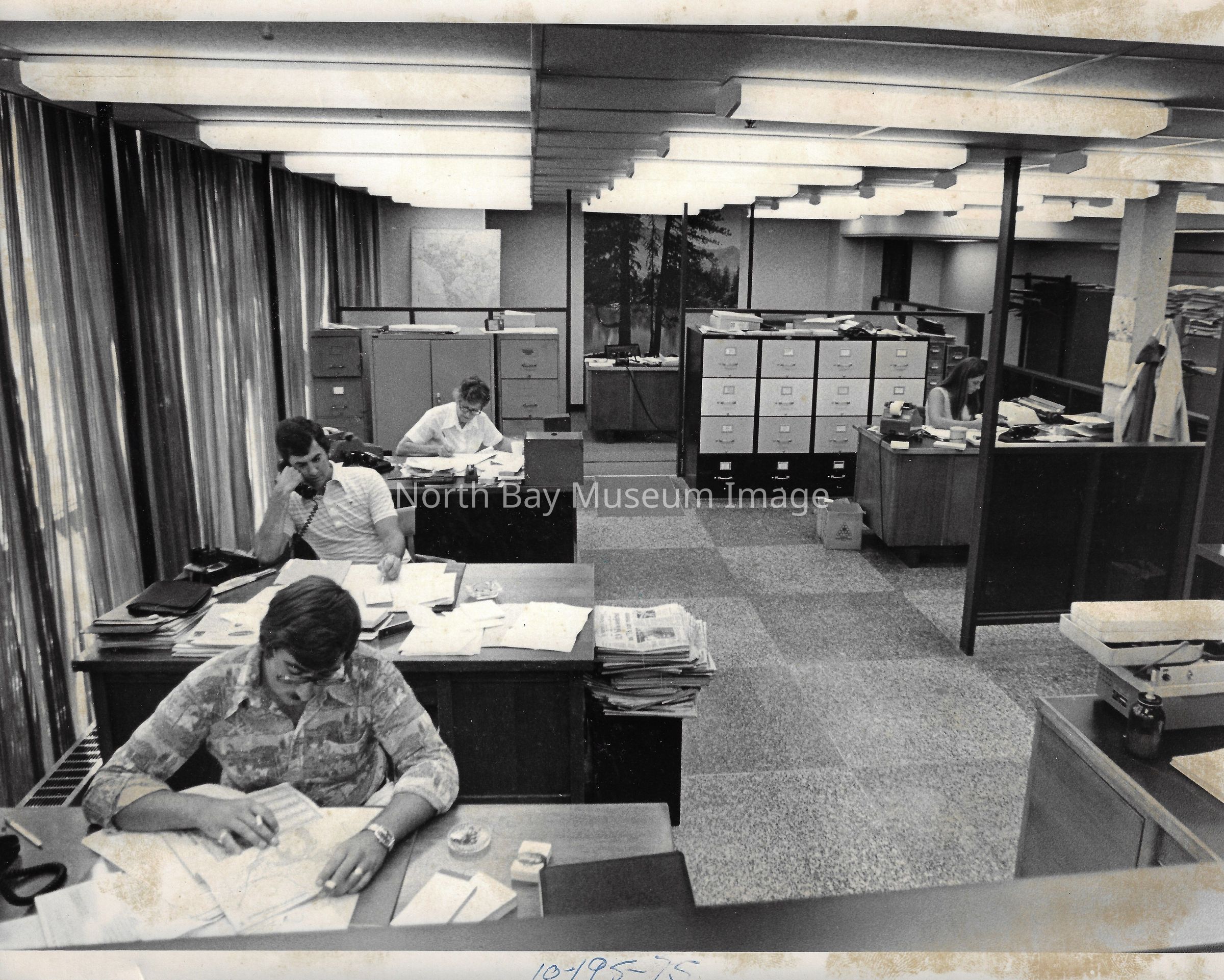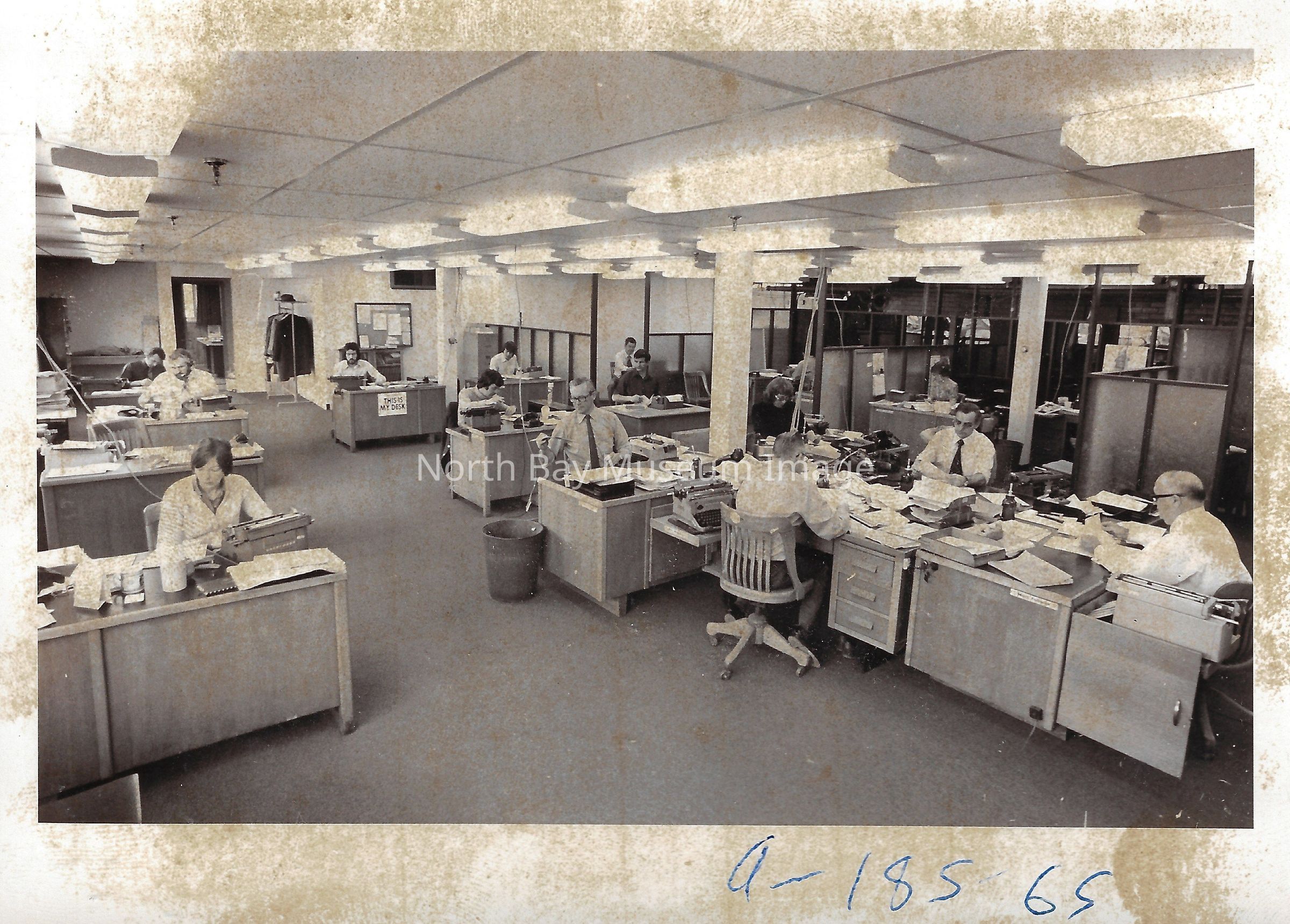 022.01.70r: Editorial department. Brett, Don Buckley, Colin, & Mort. Betty Alcorn in the news department on far left. Middle desk was called “the rim”.