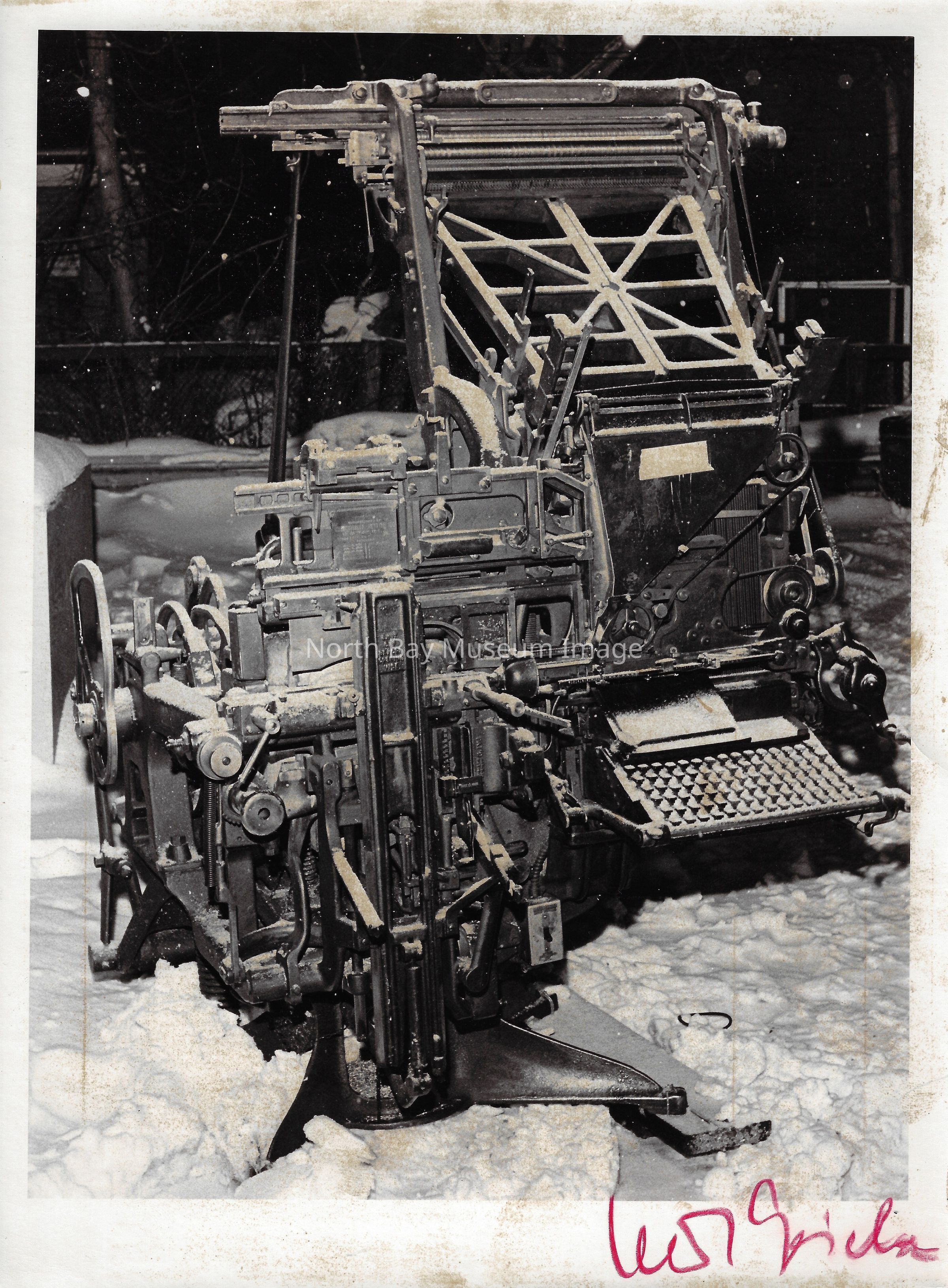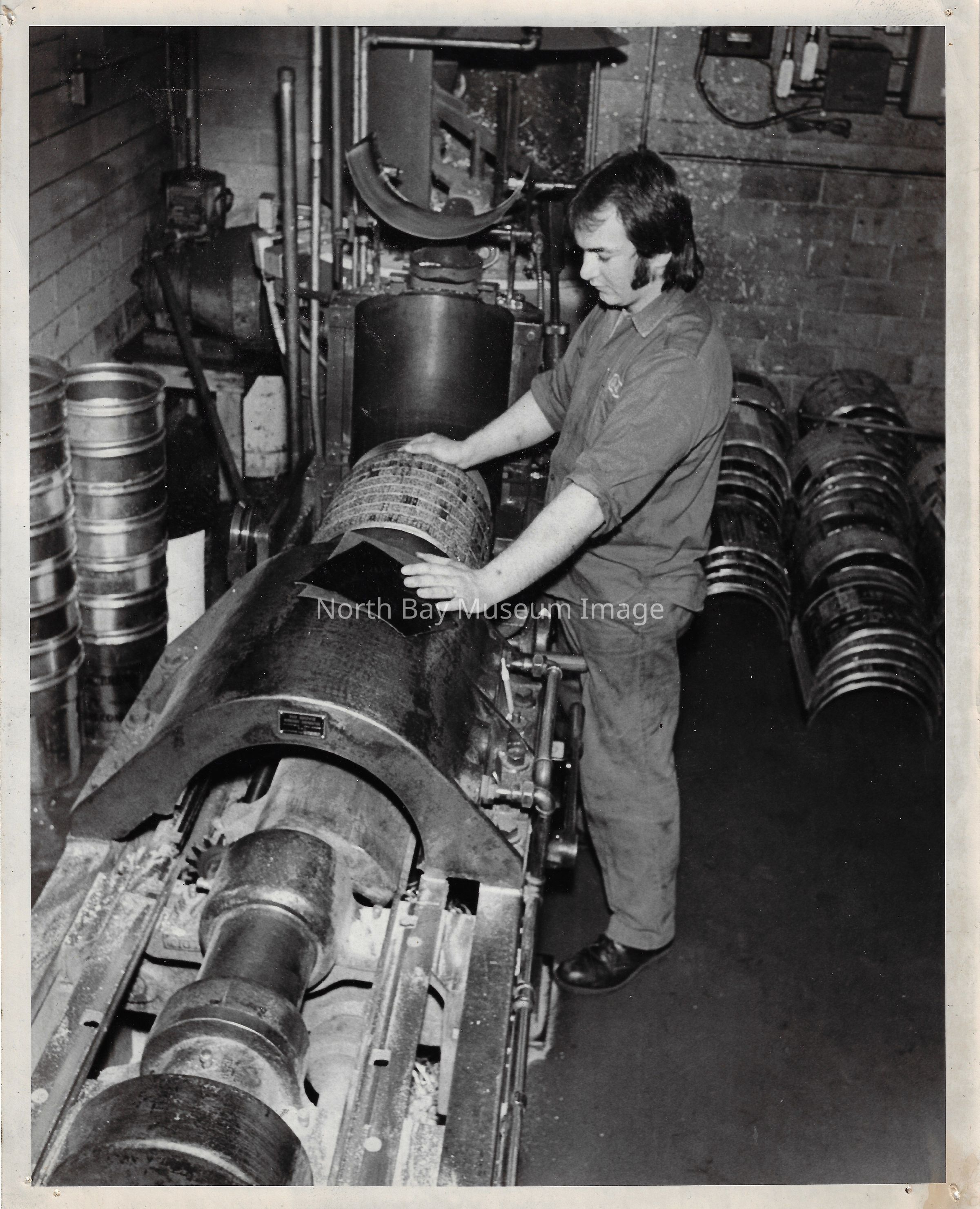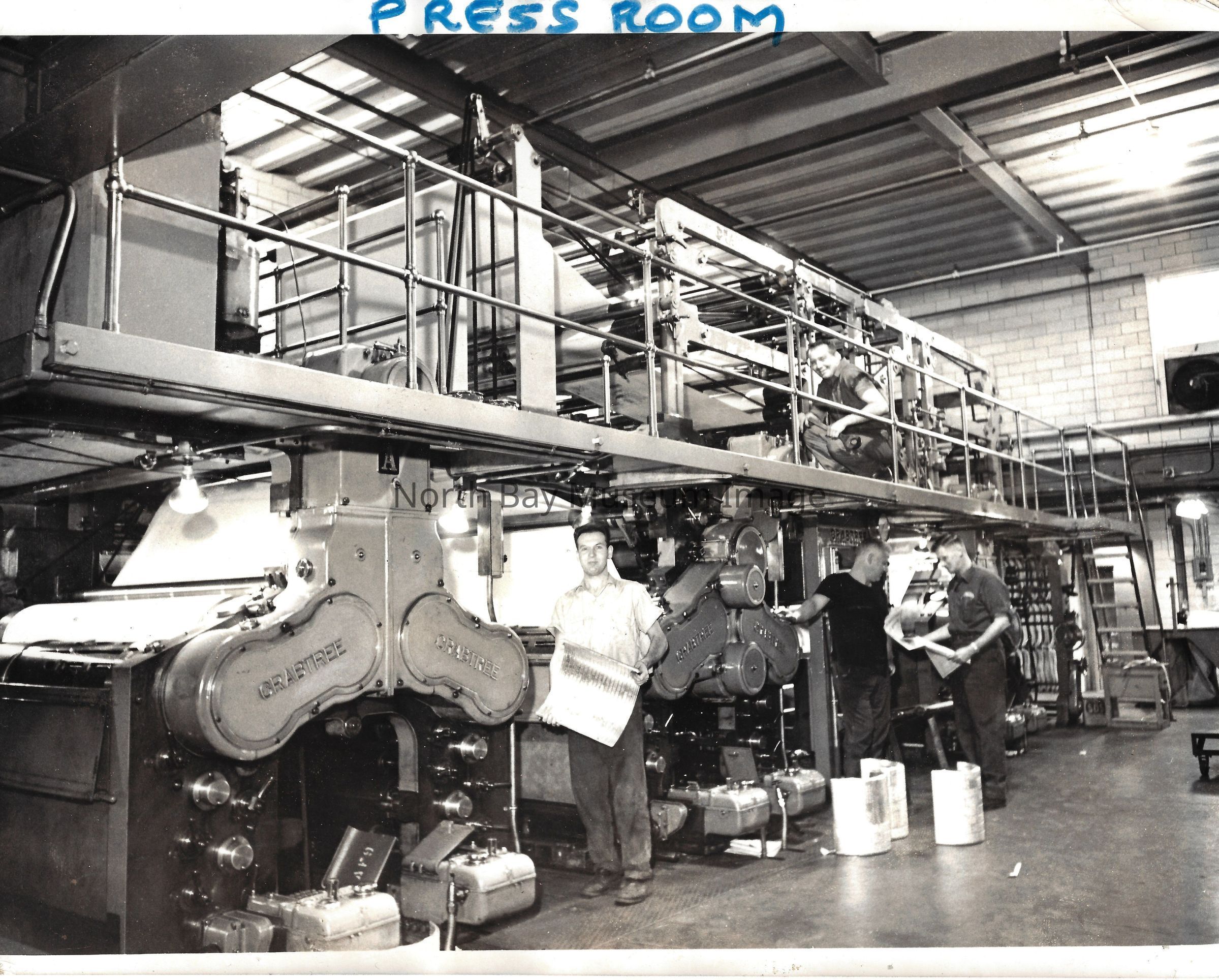 022.01.70aq: The old press. Press was brought to the Nugget building in 1956. Taken from the St. Regis Hotel. The rolls of paper were supplied by Abbott-tibey? Mills up North.