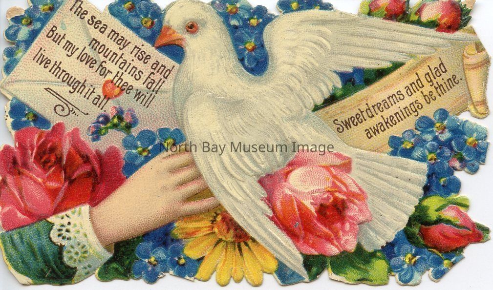 This is a 2 inch x 3 inch card. Part of a card, 2.75 inch x 4.25 inch, with serrated edges. The middle of the image is depicting an image of a white Dove perching on a woman's hand. The dove has an envelope in its mouth with the following inscriptions; "the sea may rise and mountains may fall but my love for thee will through it all". And "sweet dreams and glad awakening be thine". There are blue, yellow, green, pink and red flowers surrounding the image of the dove.