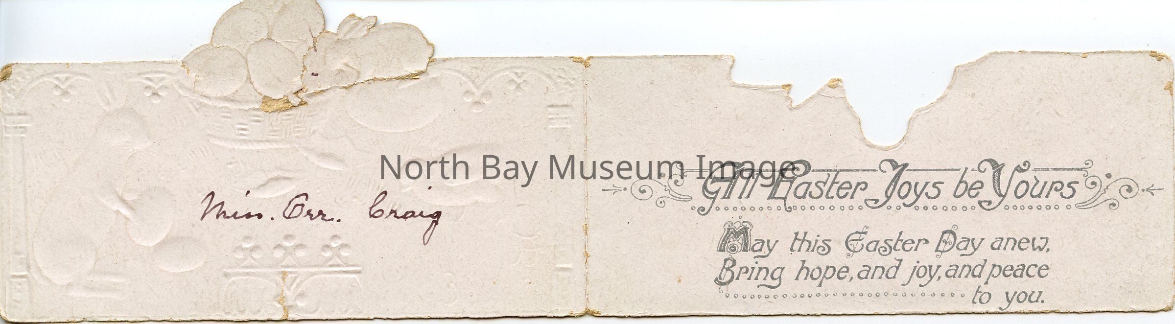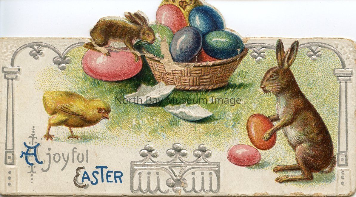 This is a coloured Easter Card entitled " A Joyful Easter." The background of the card is white. There is an illustration of a baby yellow chick on the front left hand side. On the right hand side there is a small grey rabbit, standing on its hind legs, holding a red easter egg. In the background there is a small brown wicker basket full of coloured Easter eggs. There is another brown rabbit sitting on a easter egg looking at the basket. The animals appear to be in a grassy knoll. There is coloured eggs on the ground.