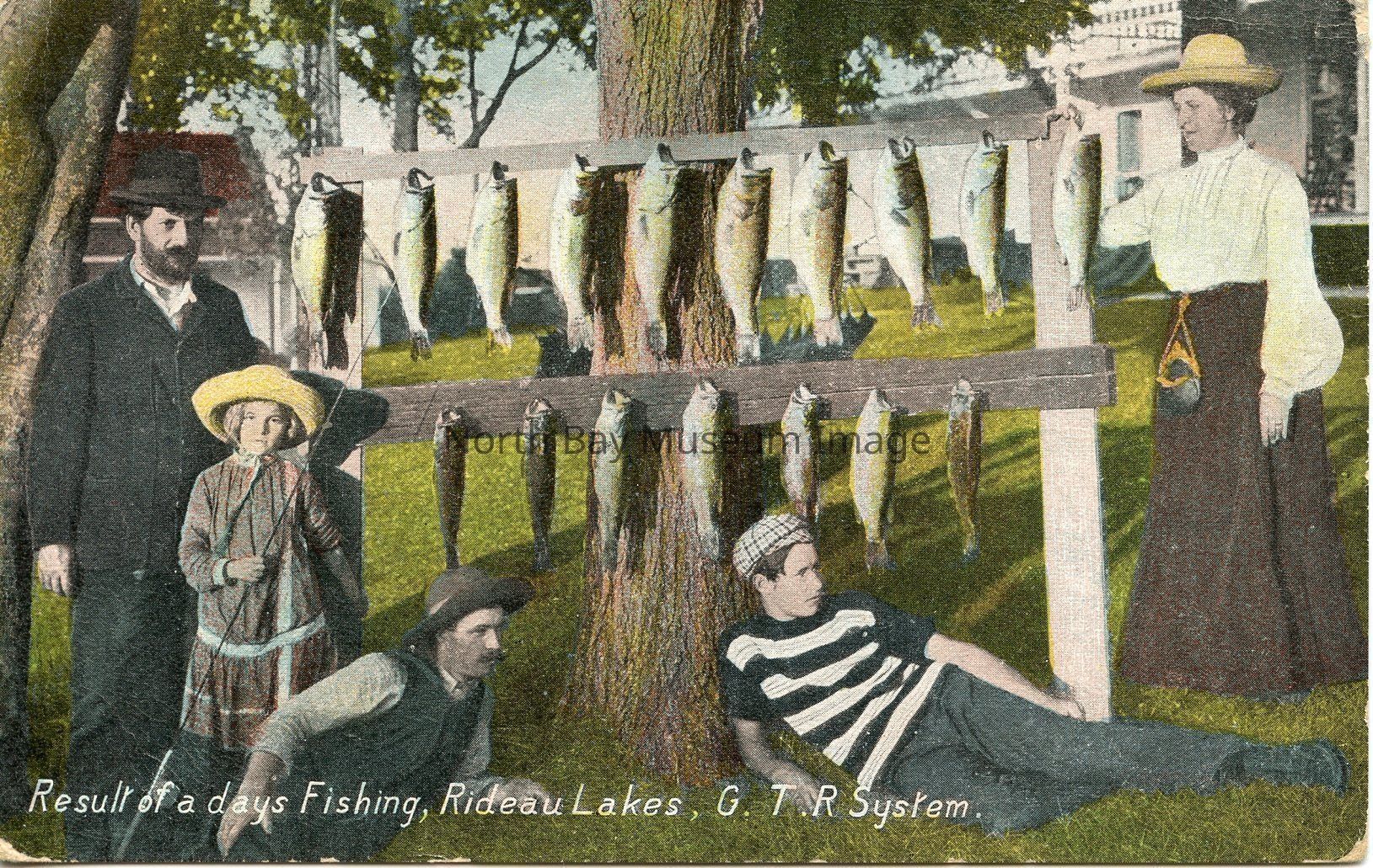 This is a coloured postcard with "result of a days Fishing, Rideau Lakes. G.T.R System," written in white text at the bottom of the postcard. The image shows a group of men, a woman, and a child posing with fishing rods on front of their fishing catch of the day surrounded by a number of big shaddy trees. The fish appear to be hung up on wooden beams attached to a tree. There appears to be a large white house in the background.