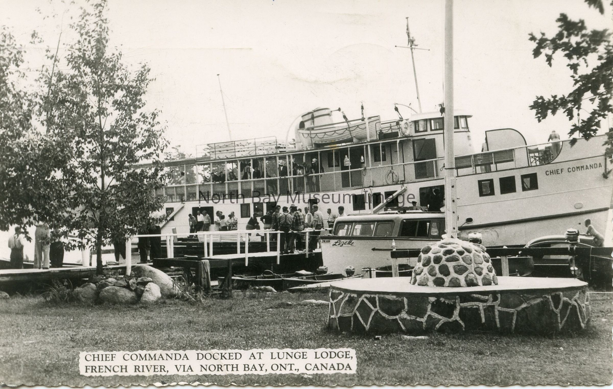 Postcard B&W photo of Chief Commanda boat at dock of fishing camp, Lunge Lodge on Upper French River. Many people standing at railing on the boat looking down at group of 8-10 men standing on a white walkway that leads to the boat.