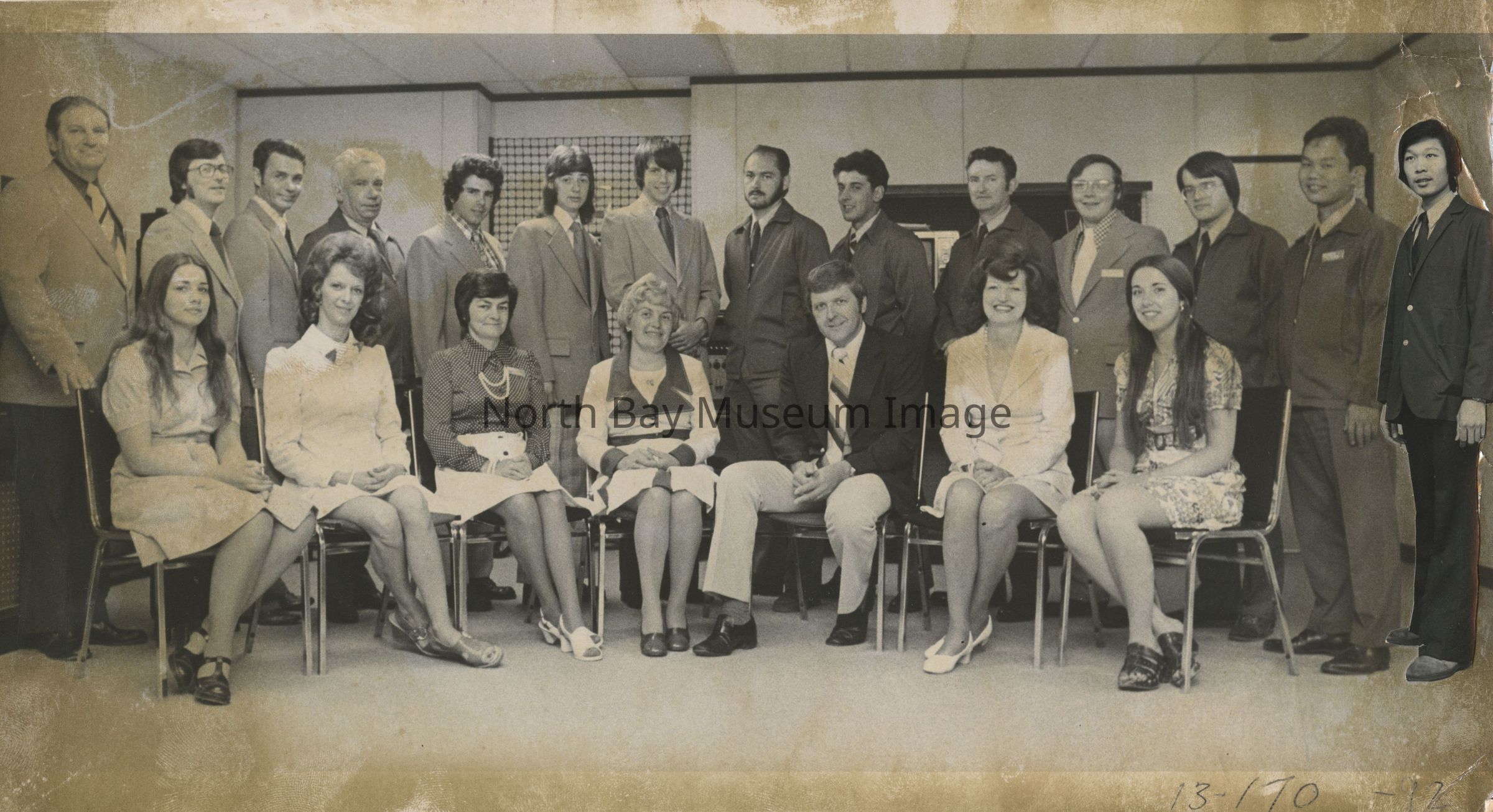 Group photo of North Bay TV & Electronics. There is a cut out photo of a man on the far right who has been glued to the photo.