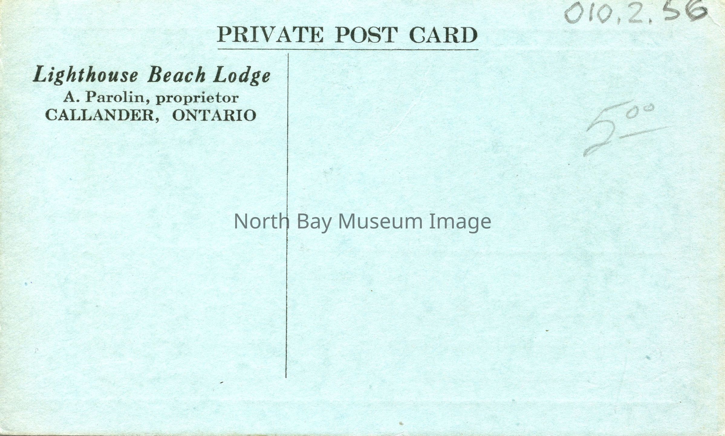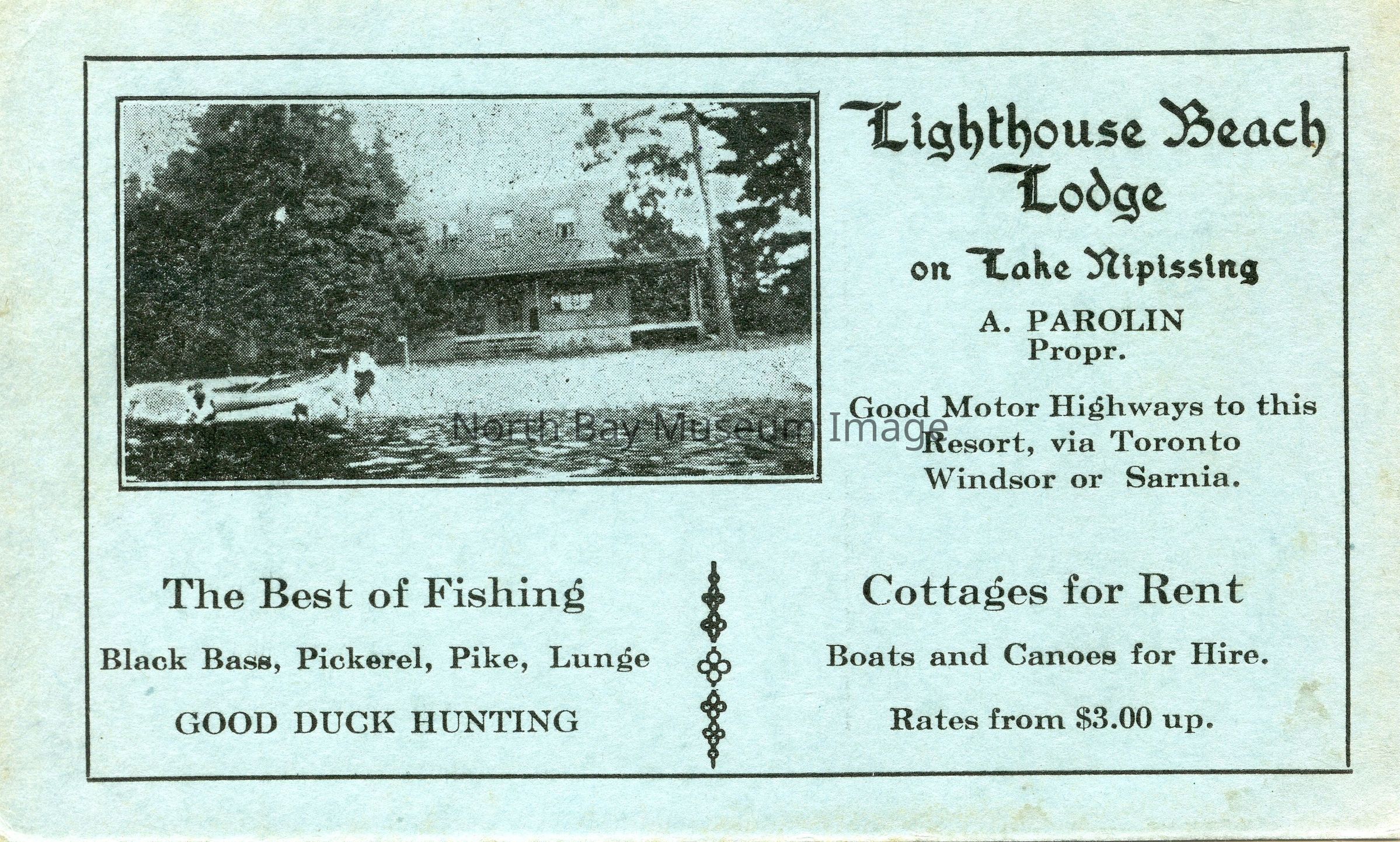 Postcard (light blue card stock) with B&W photo of the Lighthouse Beach Lodge on Lake Nipissing, A. Parolin Propr