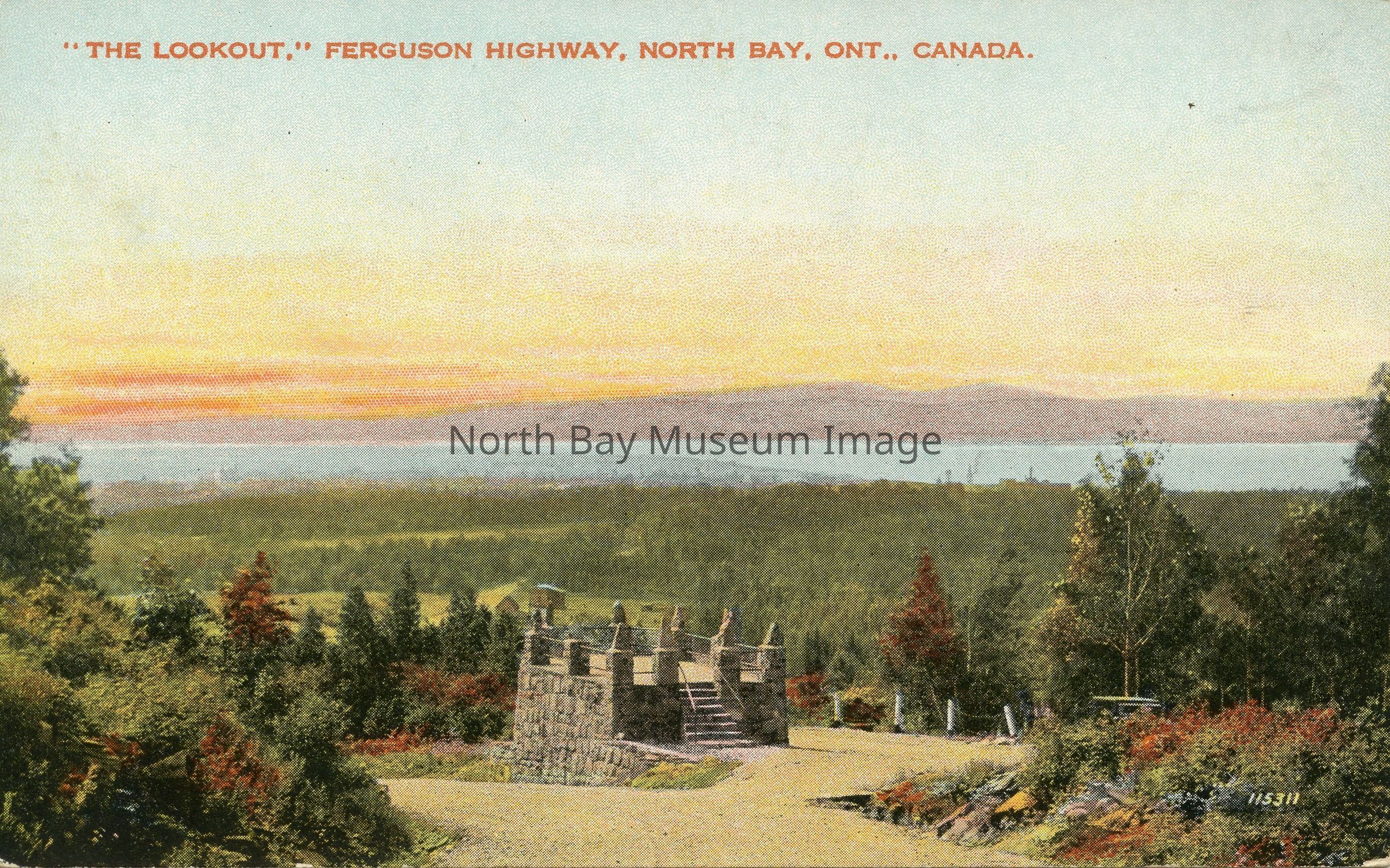 Postcard with colored photo looking west toward Lake Nipissing from Ferguson Highway, officially opened in 1927.
