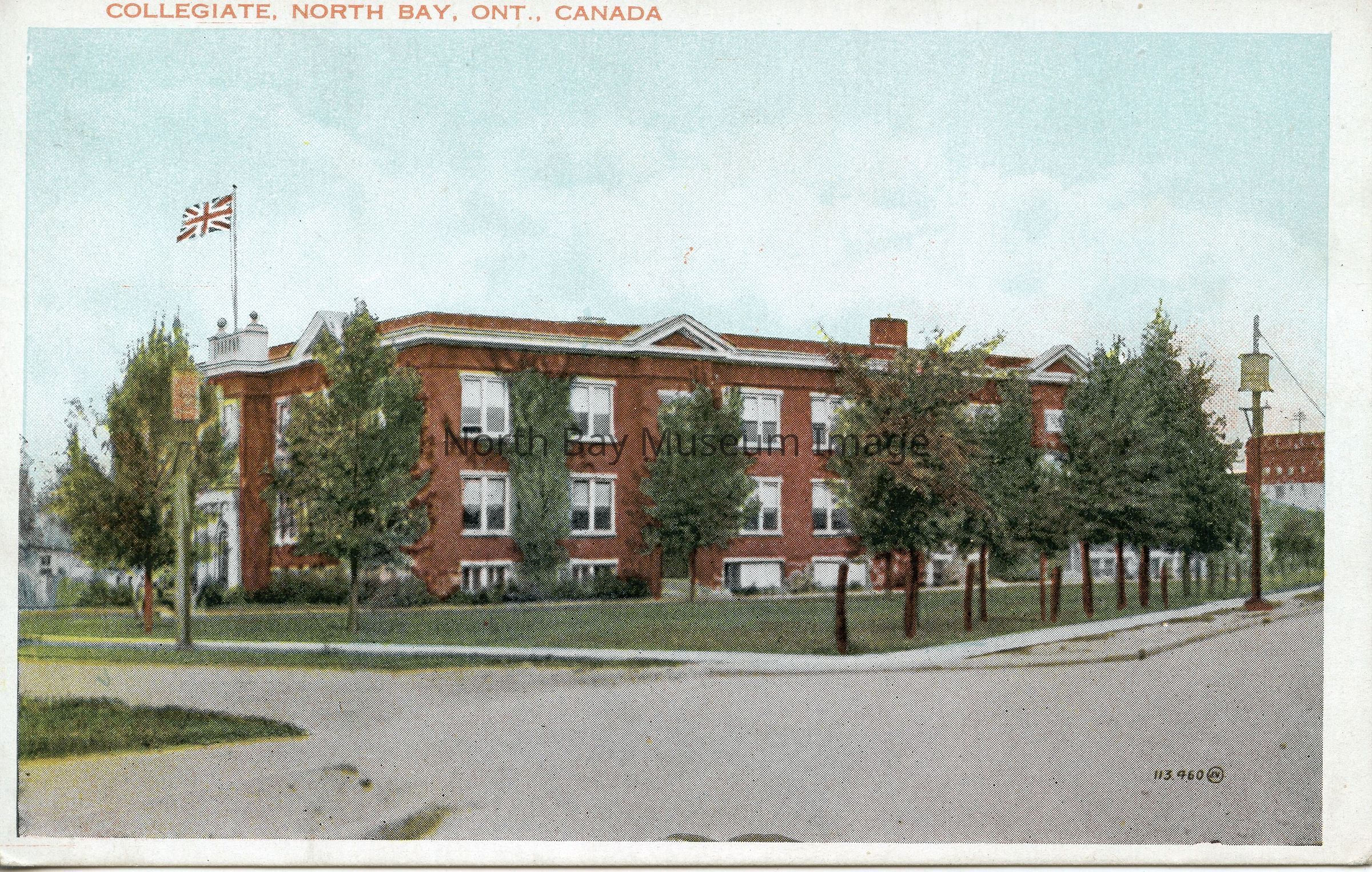 Postcard with color photo of large 2-story brick building, The Collegiate Institute and Vocational School (name changed to Algonquin Highschool in 1958), North Bay, Ontario.