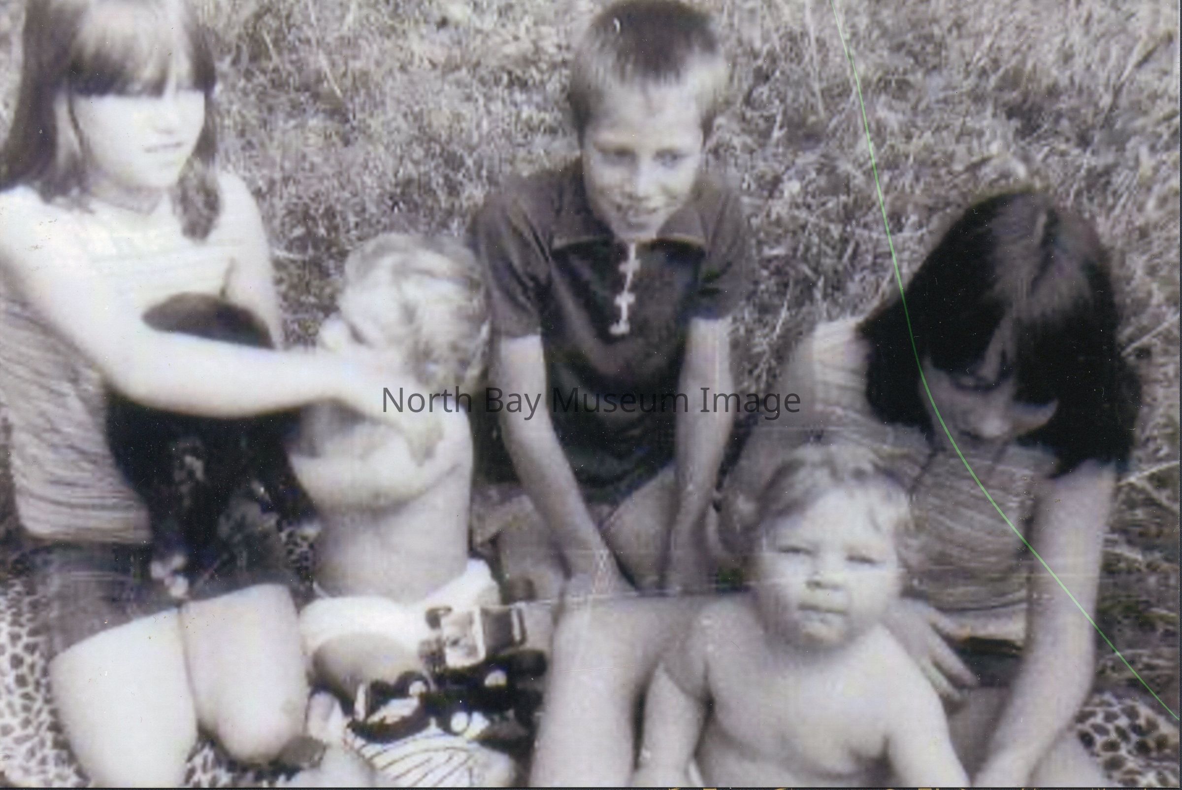 Several children arrayed on a blanket and surrounded by grass lounge and play. The tots seem to be, from left, Geraldine and Corrine. Gerry seems to be handing a girl her cat (either Fluffy or, more likley, smokey) while David and Jane handle Corrine.
