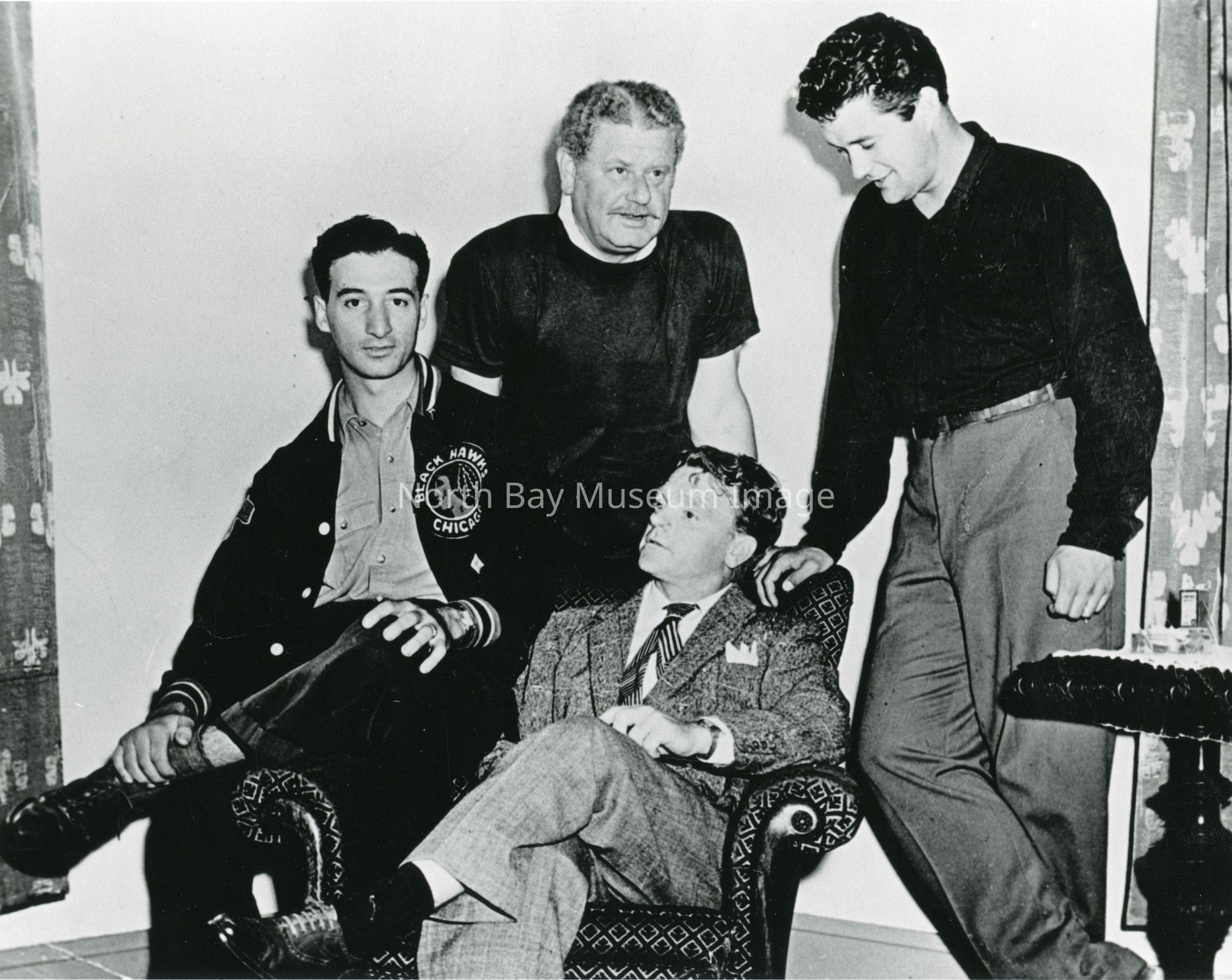 On chair arm, Ab DeMarco (North Bay), player for N.H.L's Chicago Blackhawks.