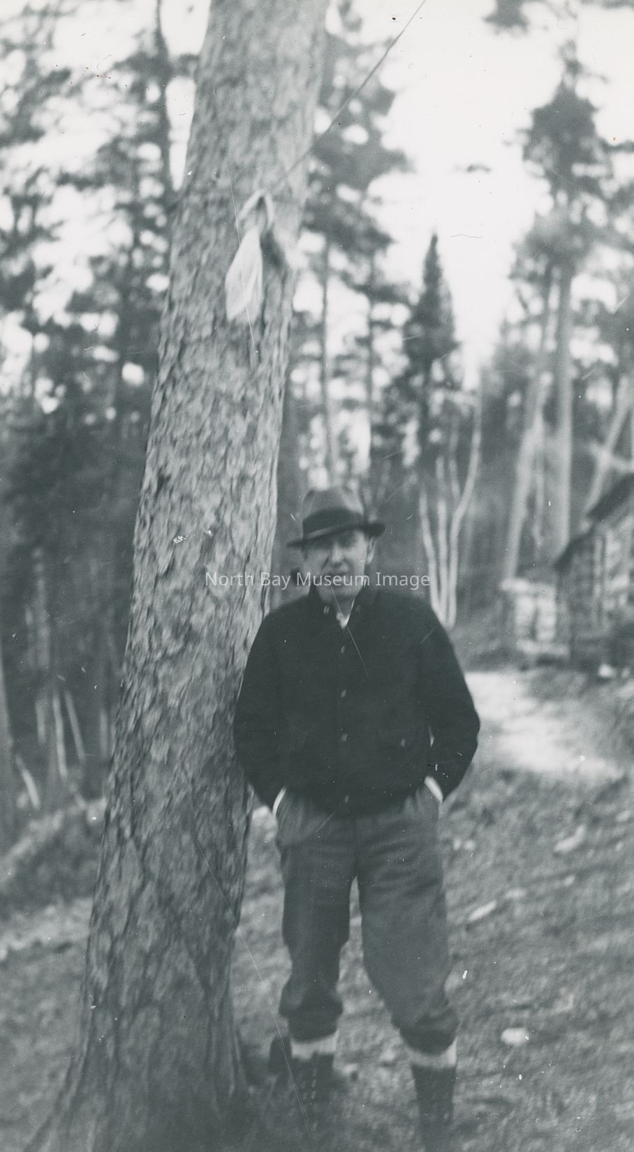 Print, Photographic - black and white photograph - picture of man posing in front of a tree - dressed in outdoor work clothes, smoking a pipe