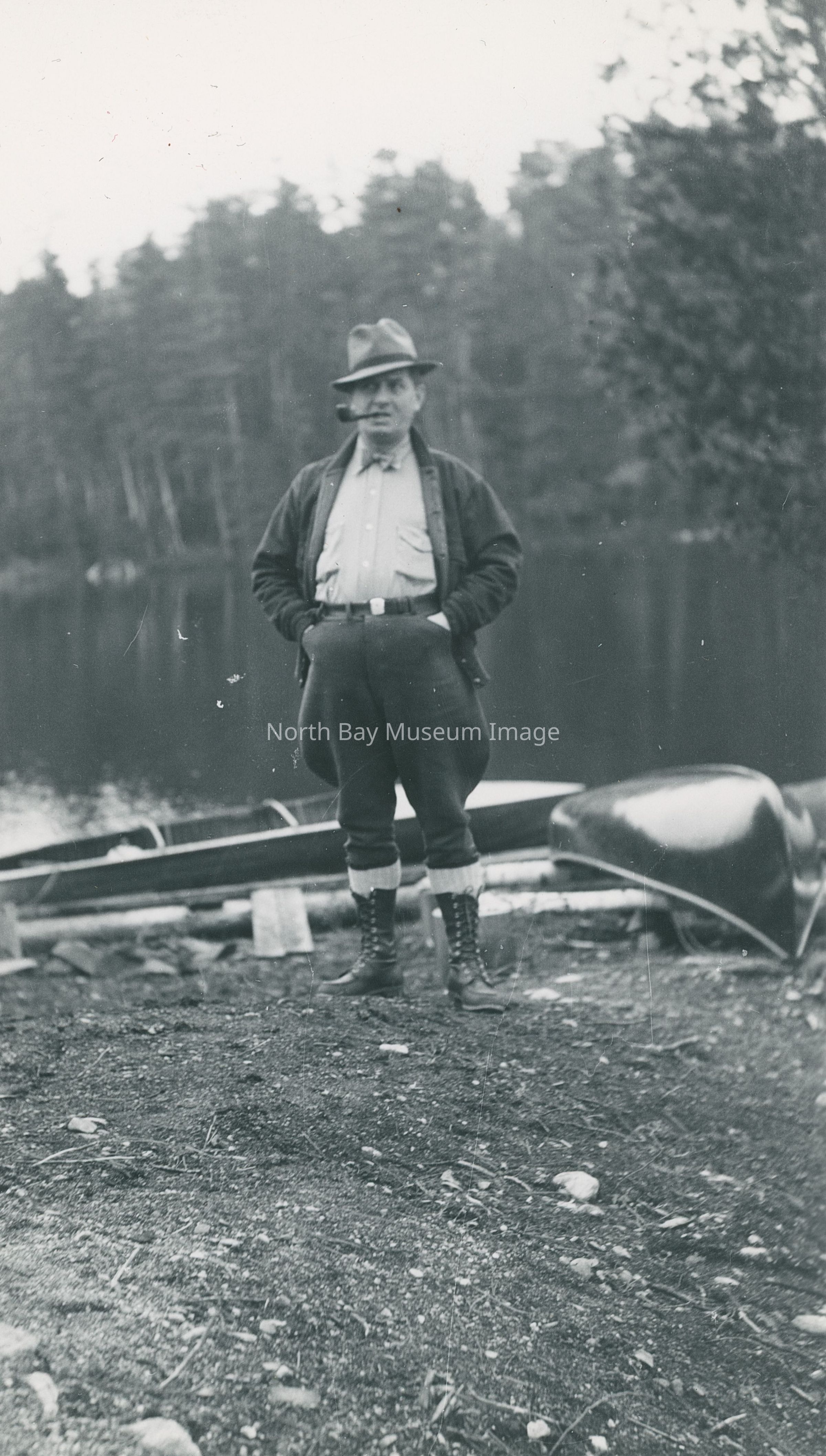 Print, Photographic - black and white photograph - picture of man standing by lake - he is dressed in casual clothing and boots, smoking a pipe - two canoes in the background