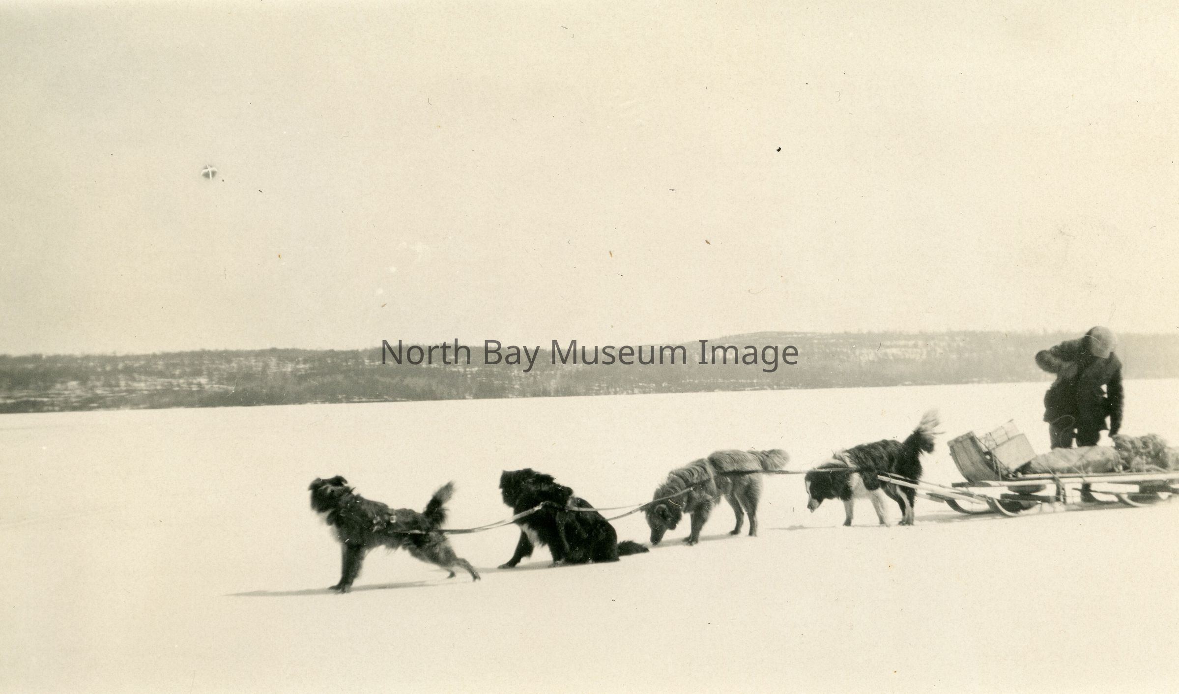 Print, Photographic - black and white photograph - picture of man and dogsled team on frozen lake - treed hills in the distance