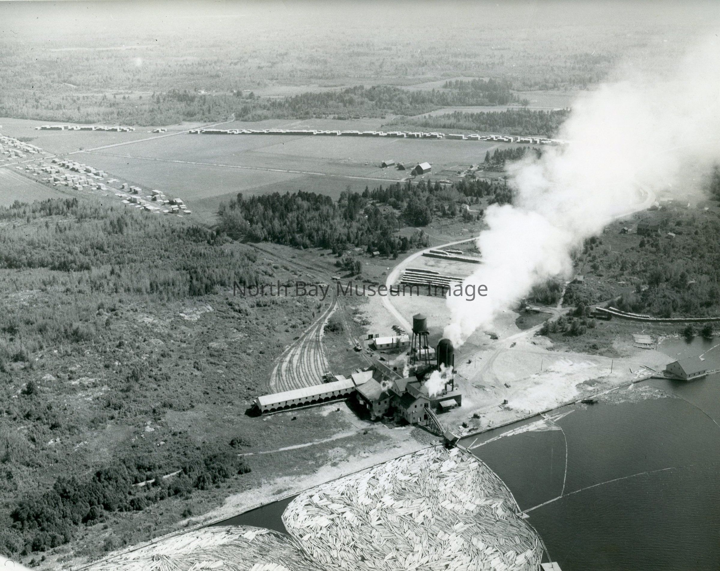 aImage is an erial view of Callander property including the Smiths' Mill and lumber yards