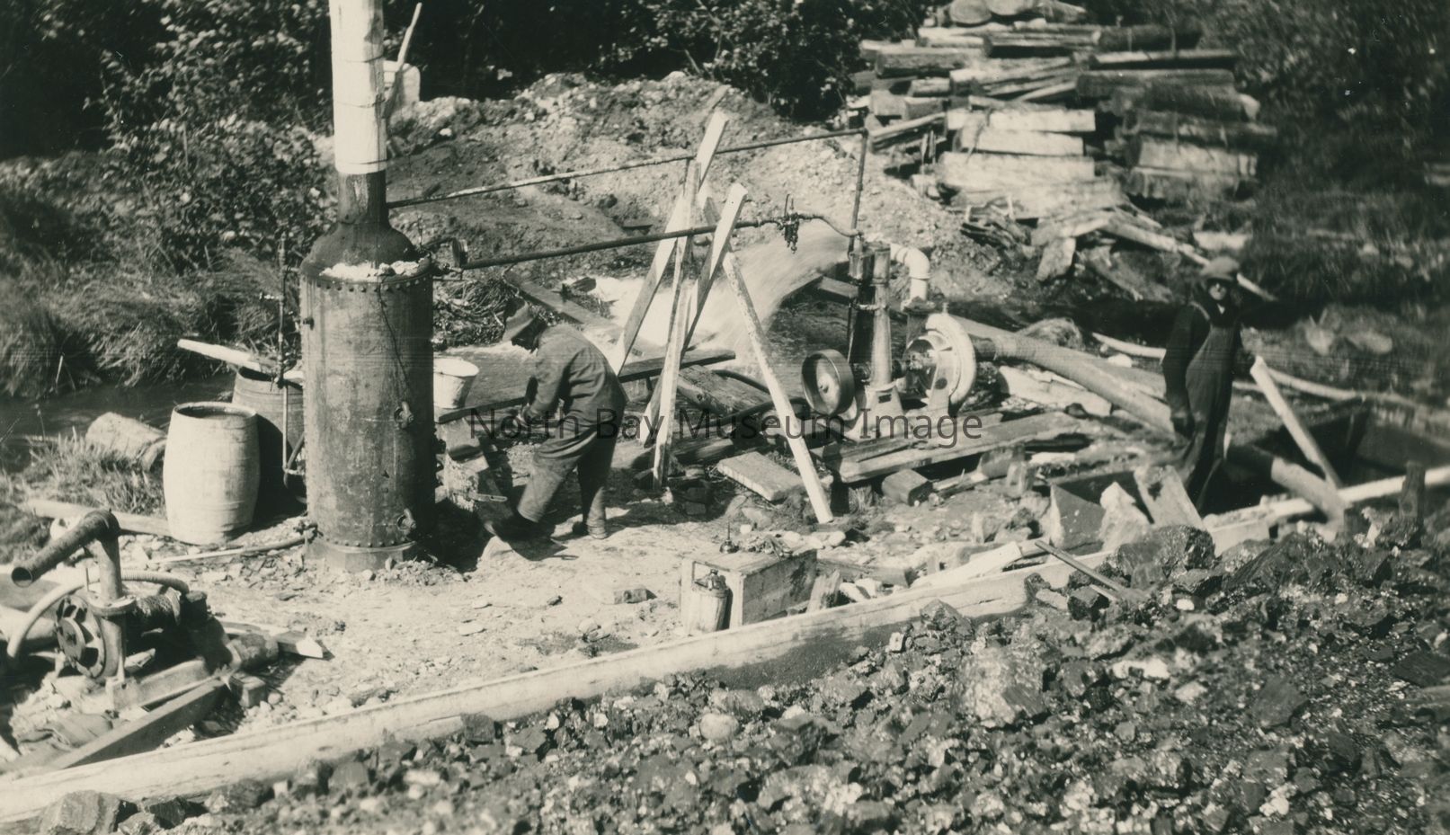 Print, Photographic - black and white photograph - shows two men manning a water pump