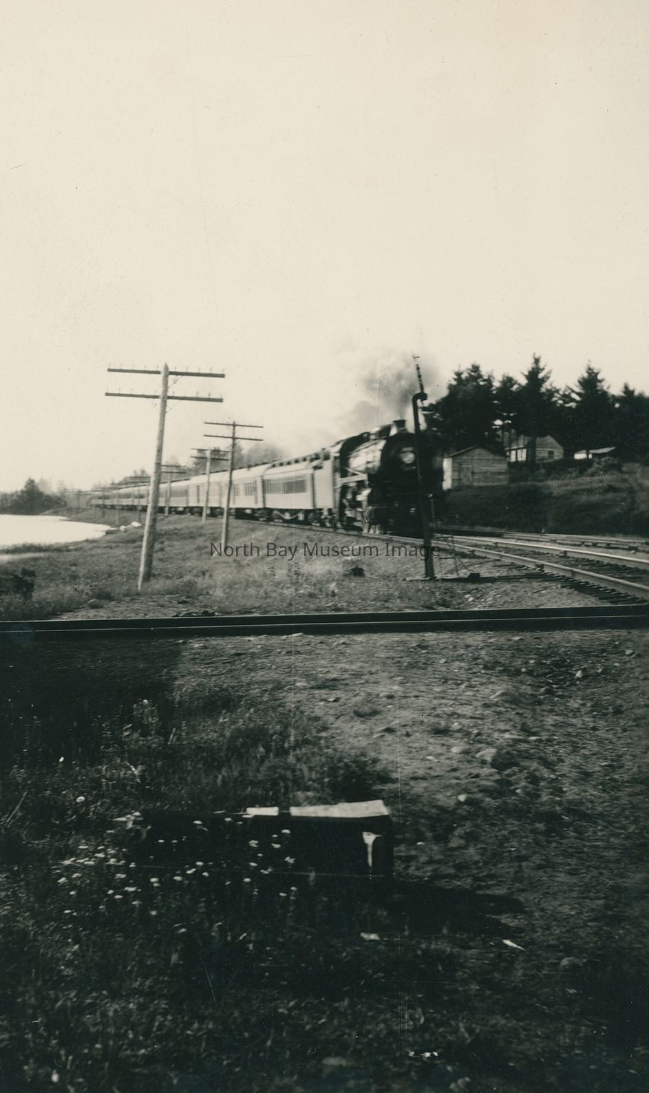 Print, Photographic - black and white photograph - shows a train coming down the track - power lines, lake and houses in the background