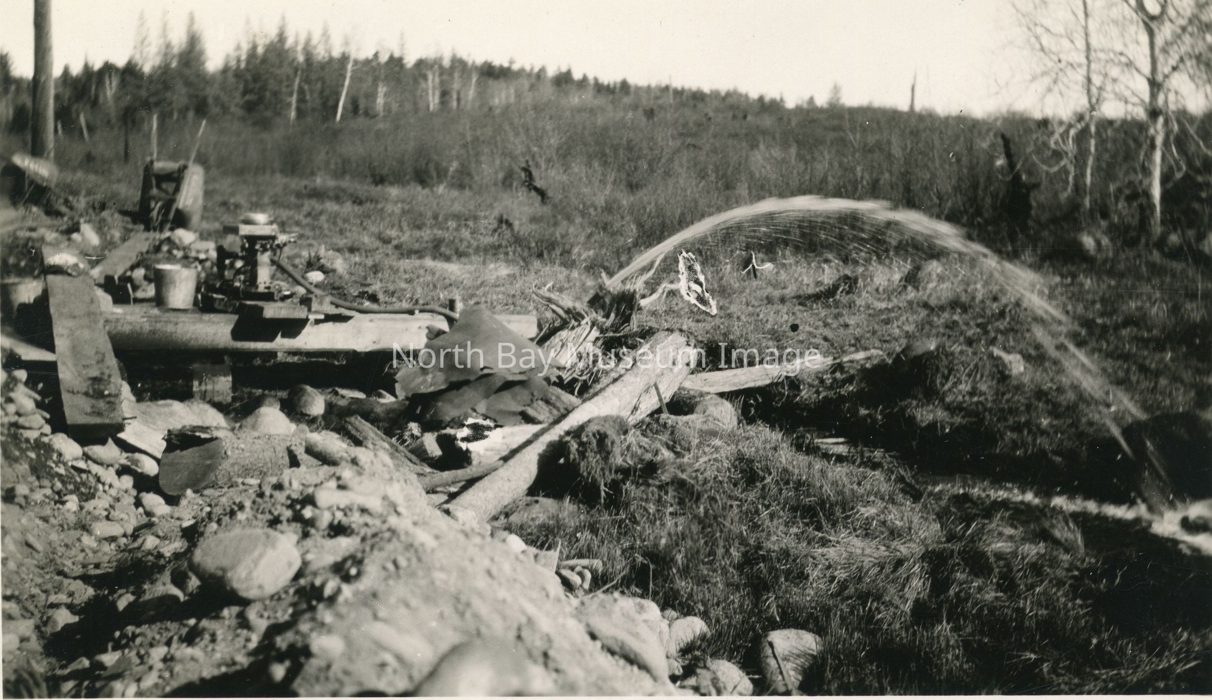 Print, Photographic - black and white photograph - shows water pump jetting water out of creek bed - wheelbarrow in background