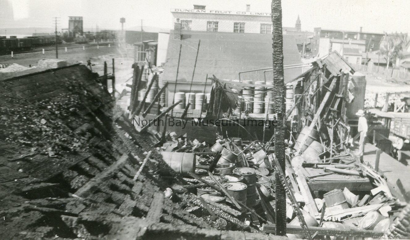 Photographic print - black and white photo of wreckage of fire -reads "101" on back -Duncan Fruit Co. Ltd. In distance St. John's spire?