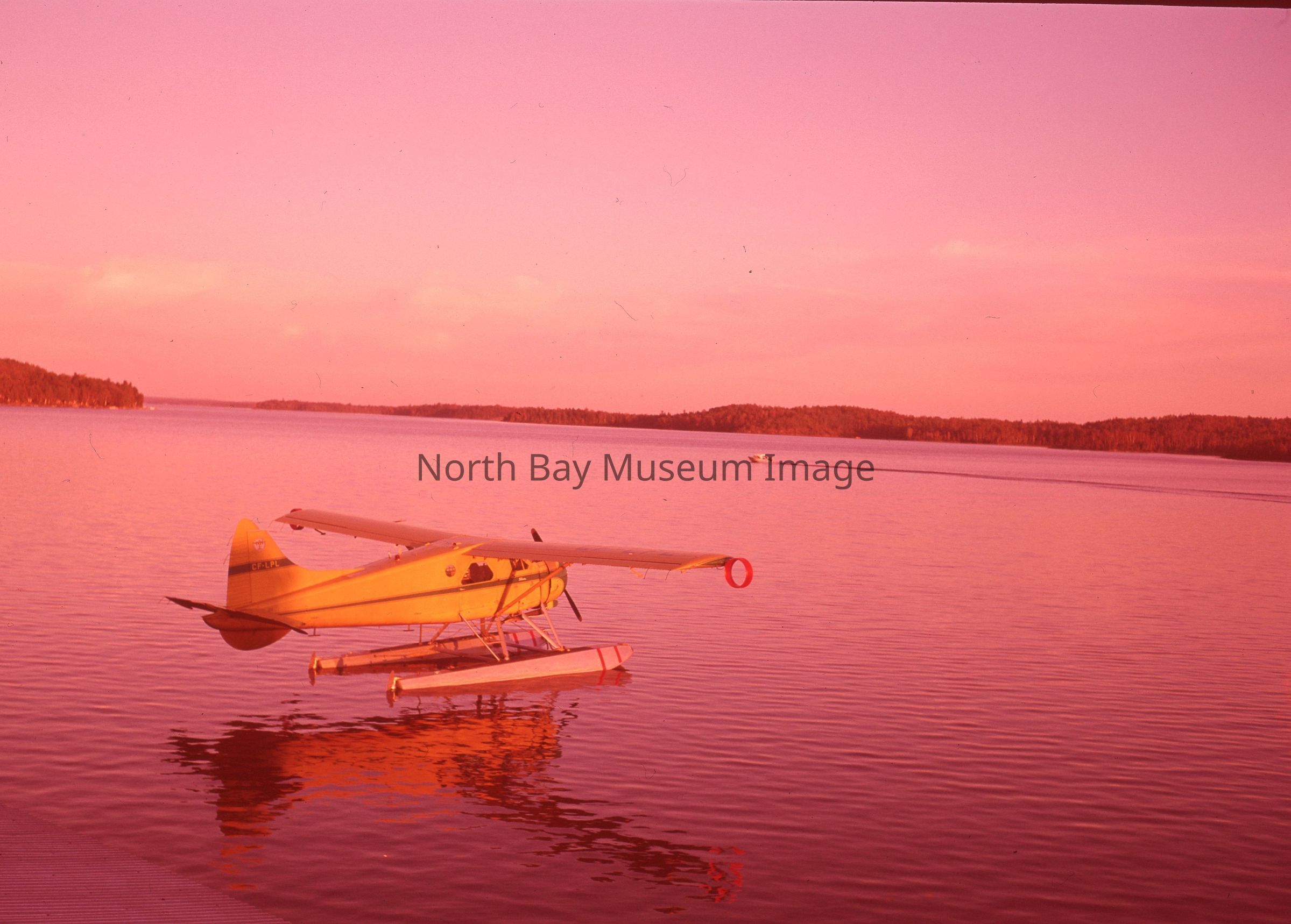 The Envelope (a) contains the slides (b-c) of an airplane at sunset on Trout Lake Road at the Marine Room. The images show a yellow and black plane on the water getting ready for take off. In the far distance you can see a small boat off in the distance. The publications are listed on the envelope. A part of the Forder Collection.Creator