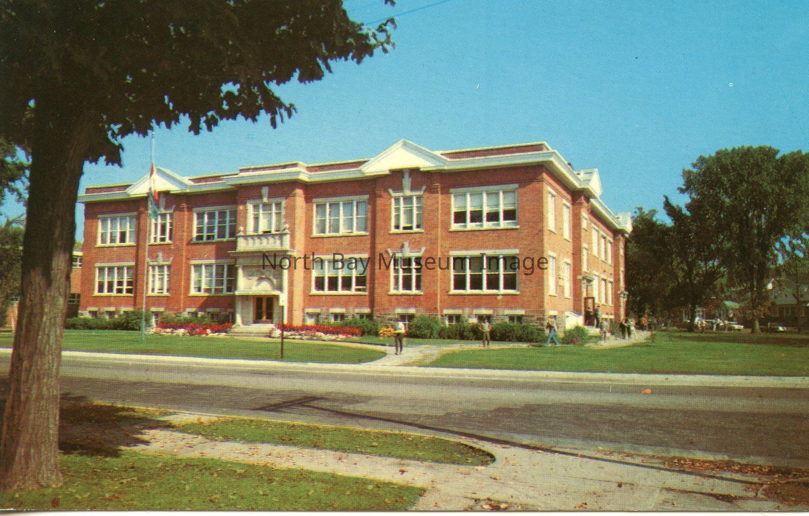 Coloured Image of Algonquin Campsite School. The photo was taken across the street. The school is a three story red/brown brick building. There are big windows on the front and side of the school. There is a Canadian flag flying in the right side of the postcard. The landscaping in front of the building is well manicured: the trees in the front of the school are grand, and the garden outfront of the school shows red flowers blooming. People appear to be standing around the school building.