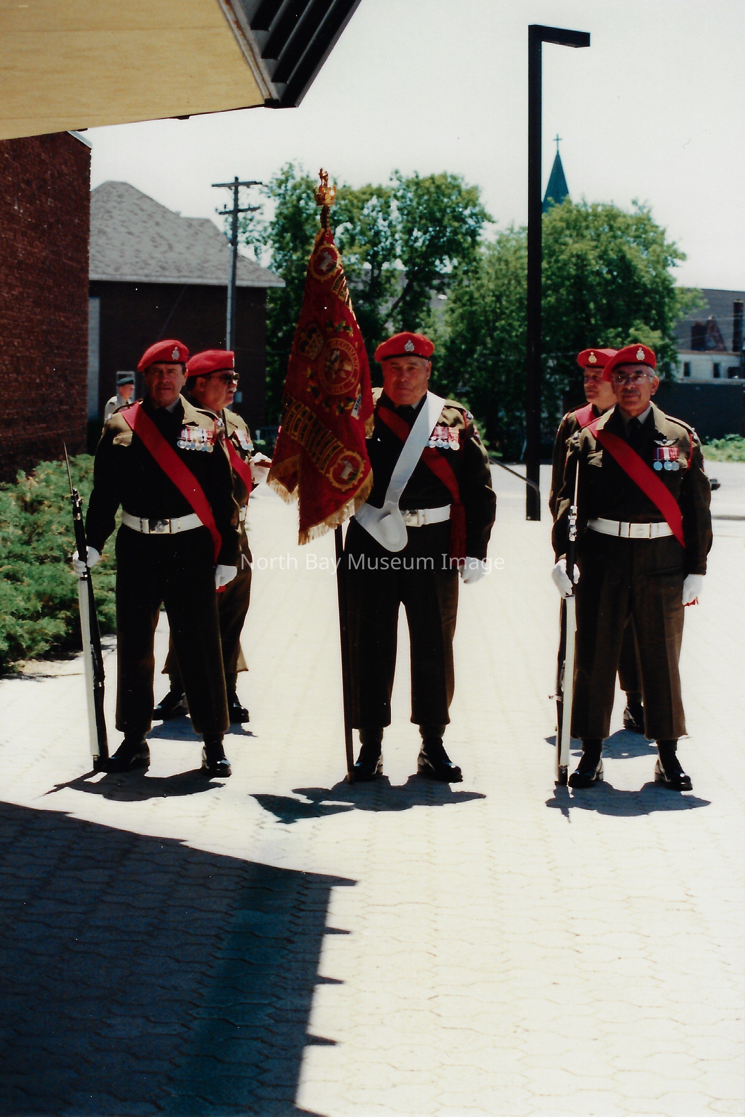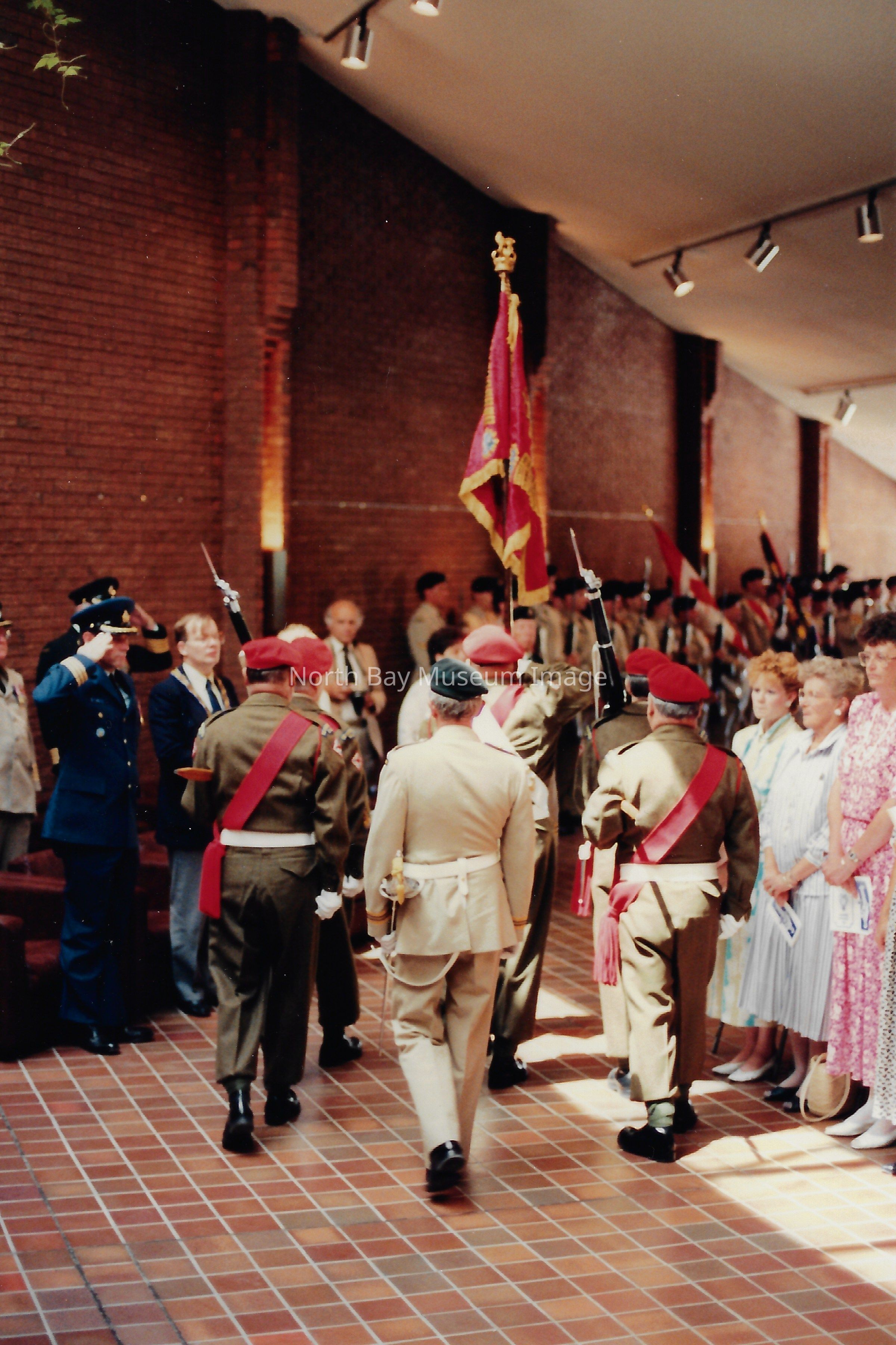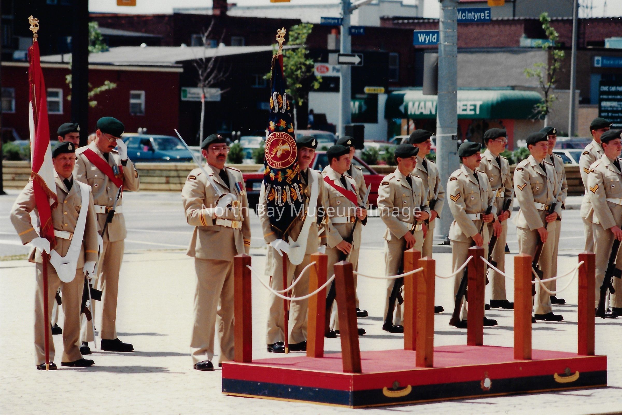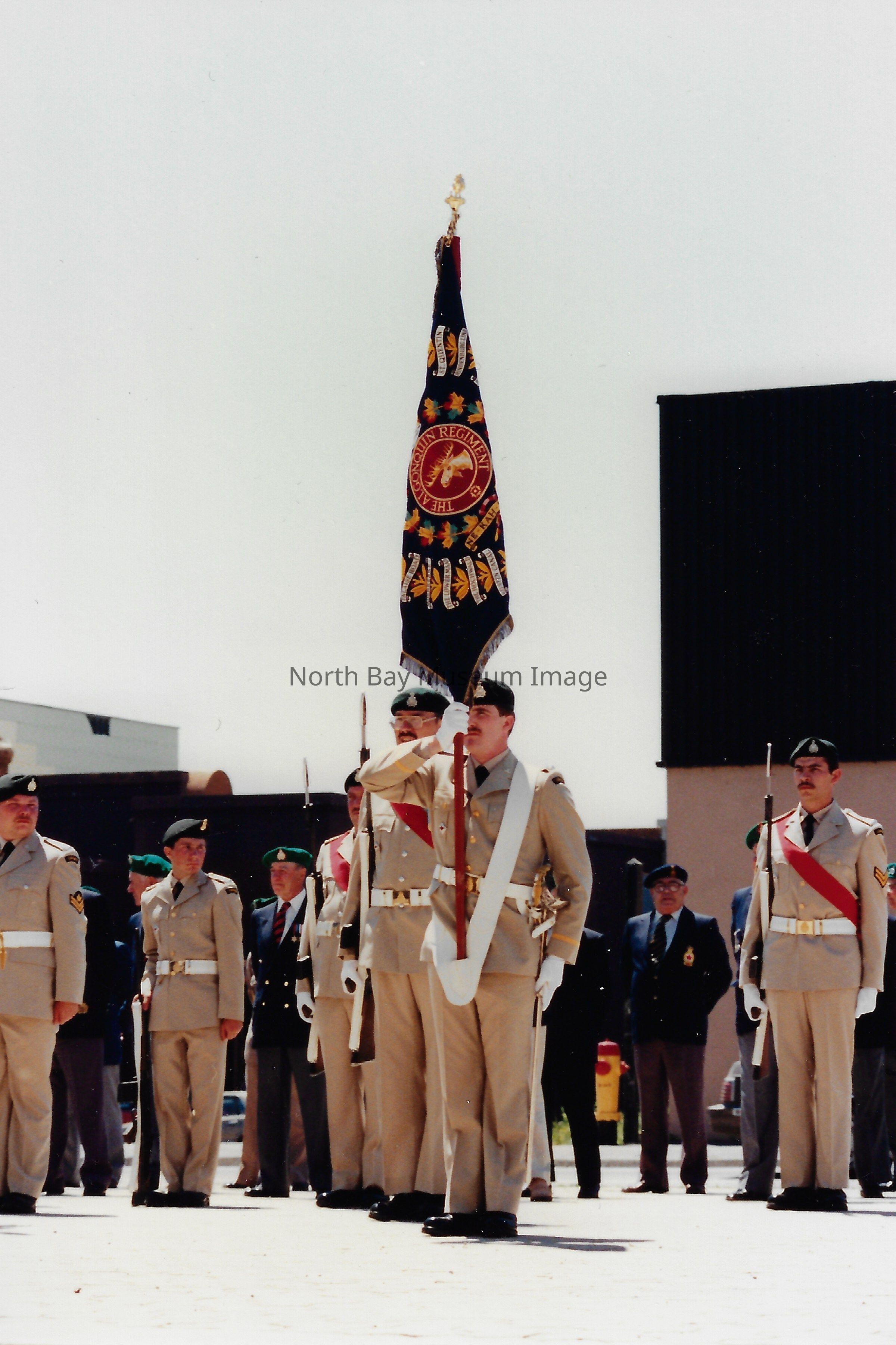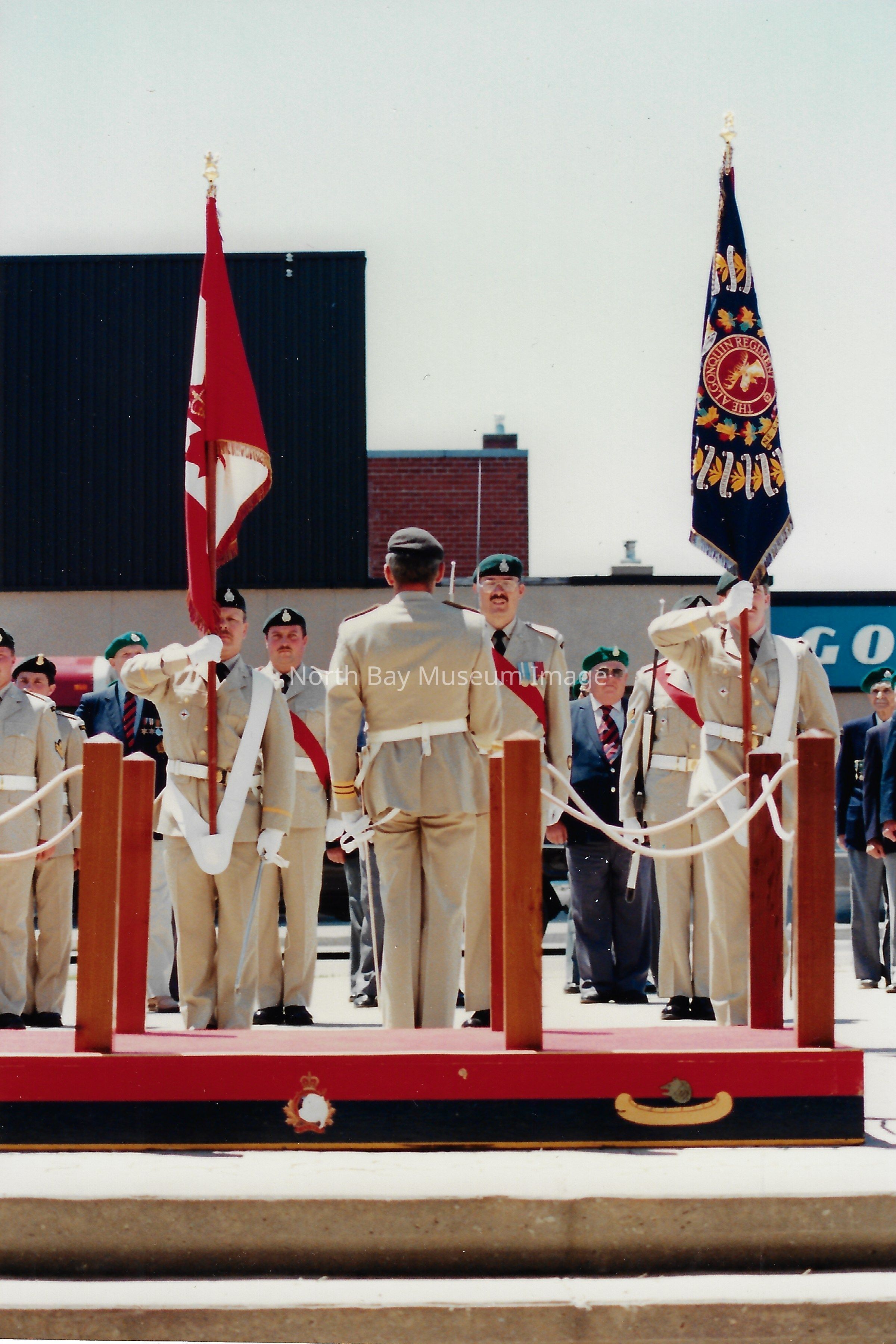 Series of photos originally in a photo envelope from S. Guindon sent to Bill Alexander from the "Presentation of Colours" ceremony which involved the formal presentation of two flags to the Algonquin Regiment in 1984.