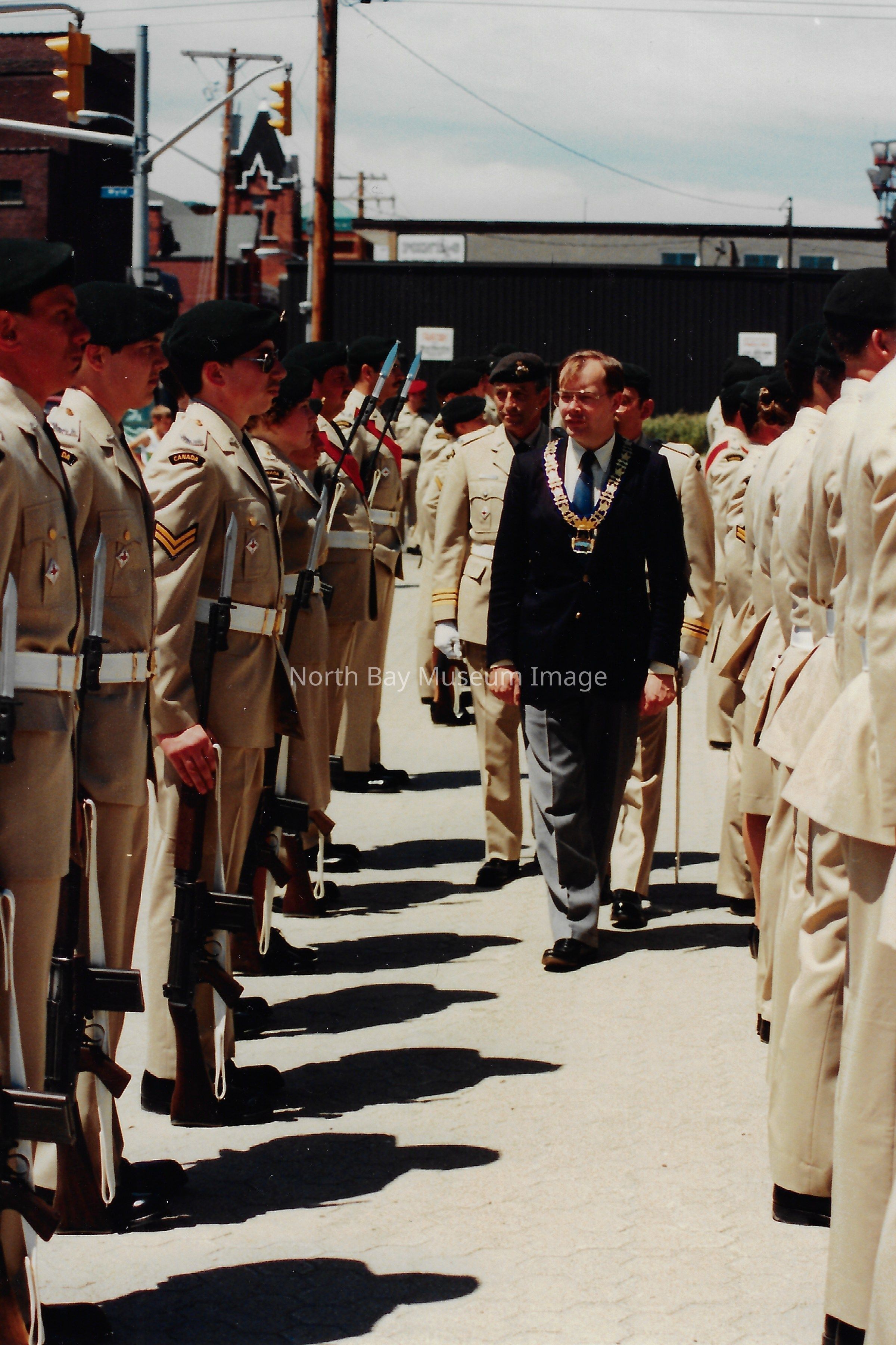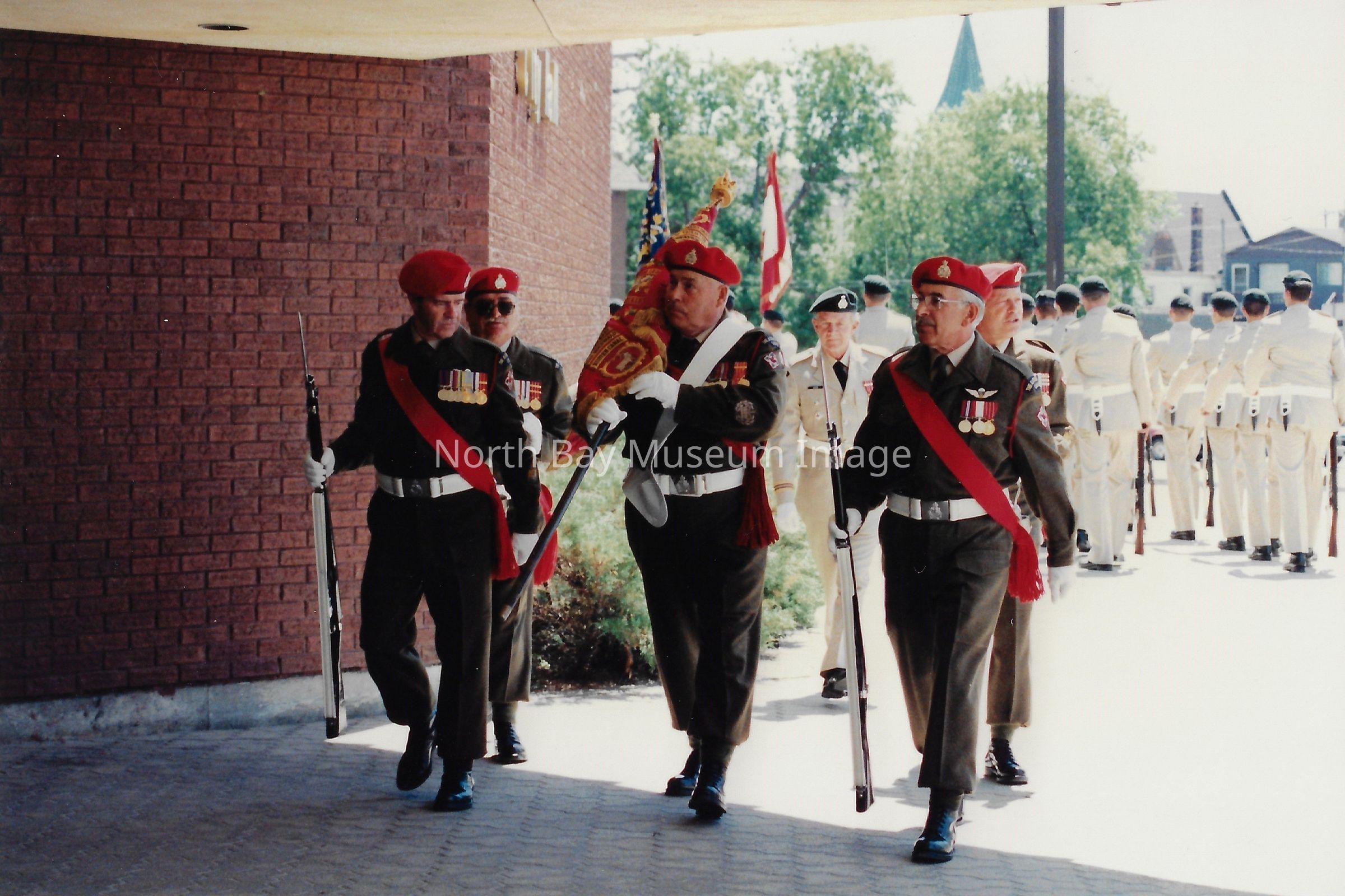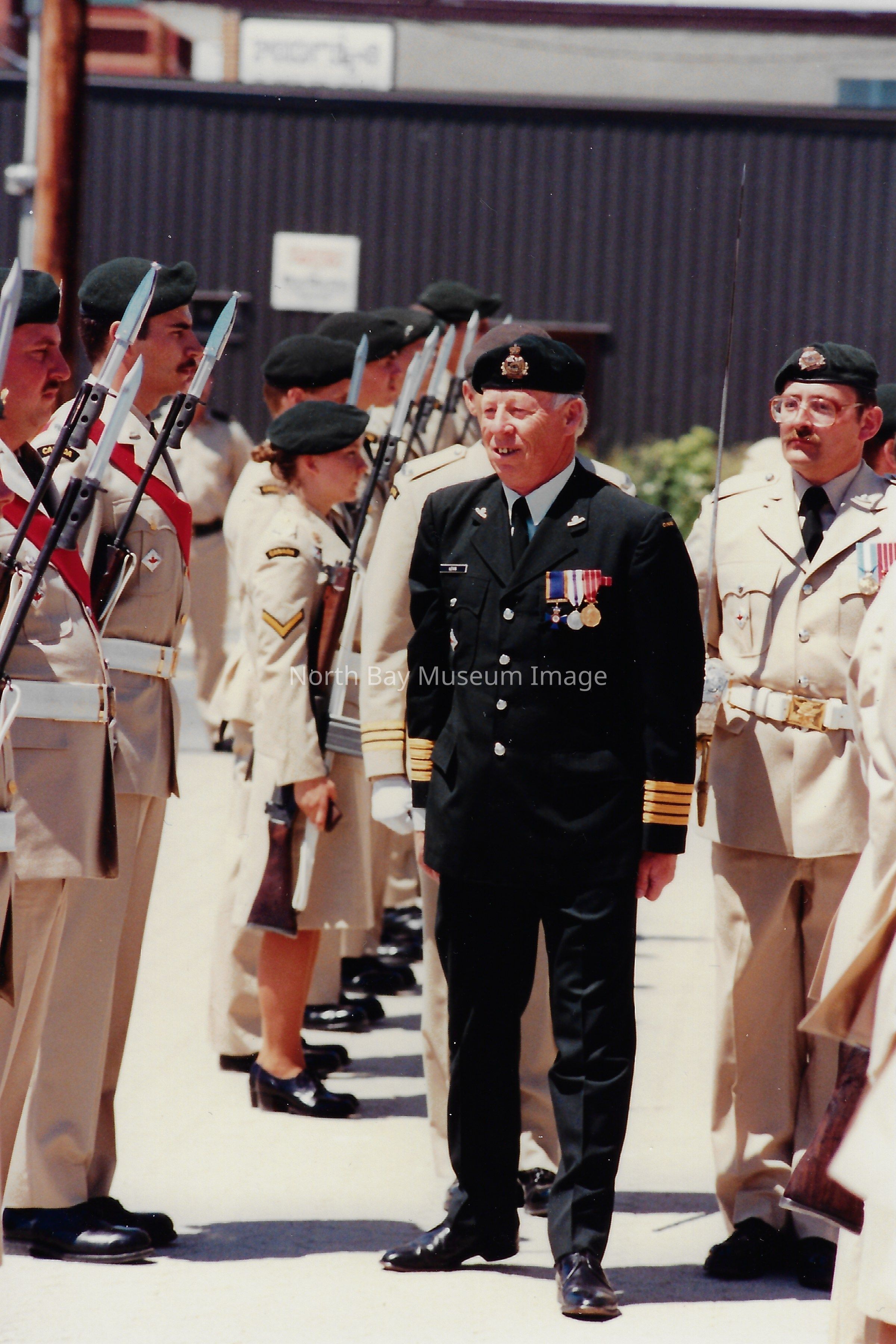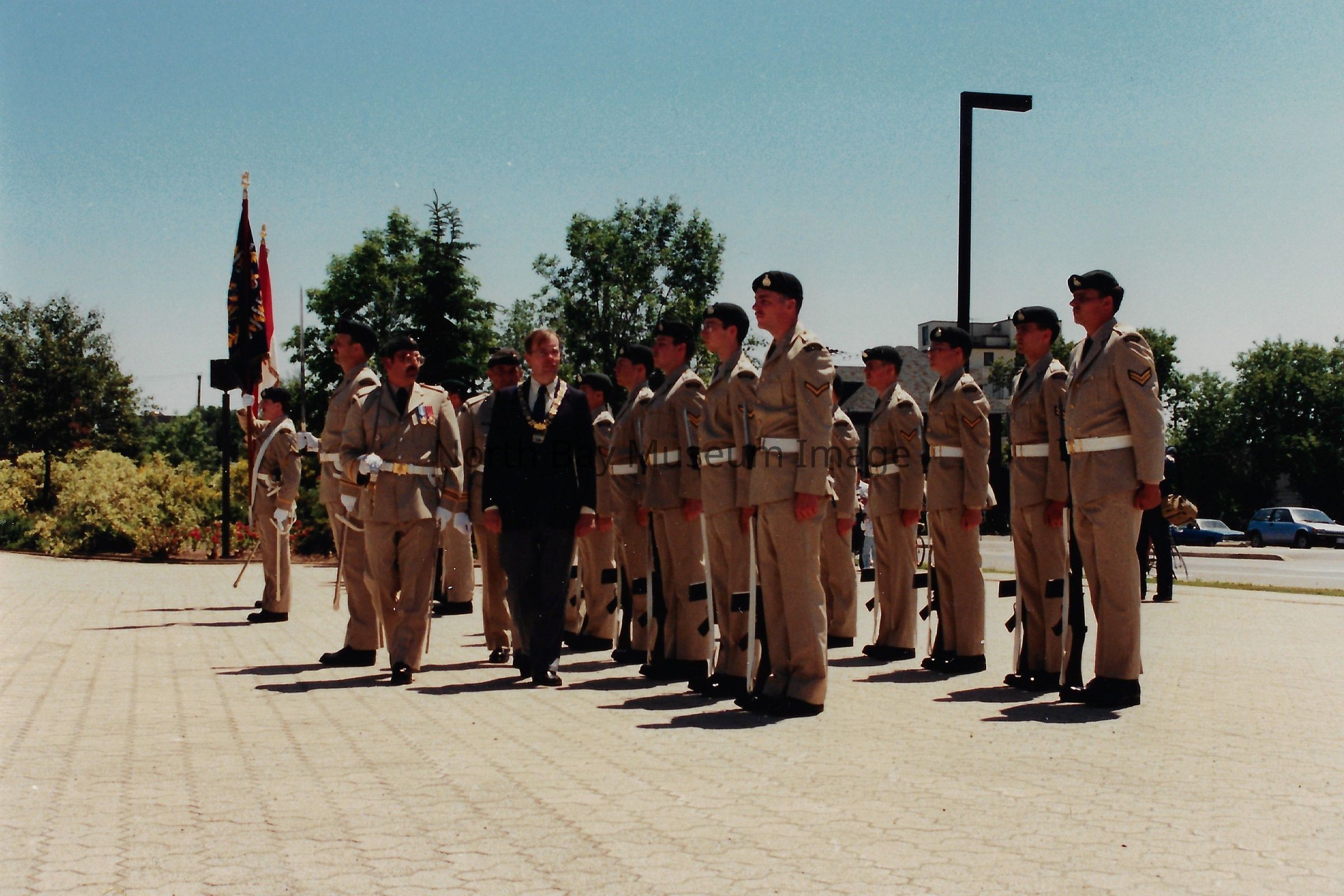 Series of photos originally in a photo envelope from S. Guindon sent to Bill Alexander from the "Presentation of Colours" ceremony which involved the formal presentation of two flags to the Algonquin Regiment in 1984.