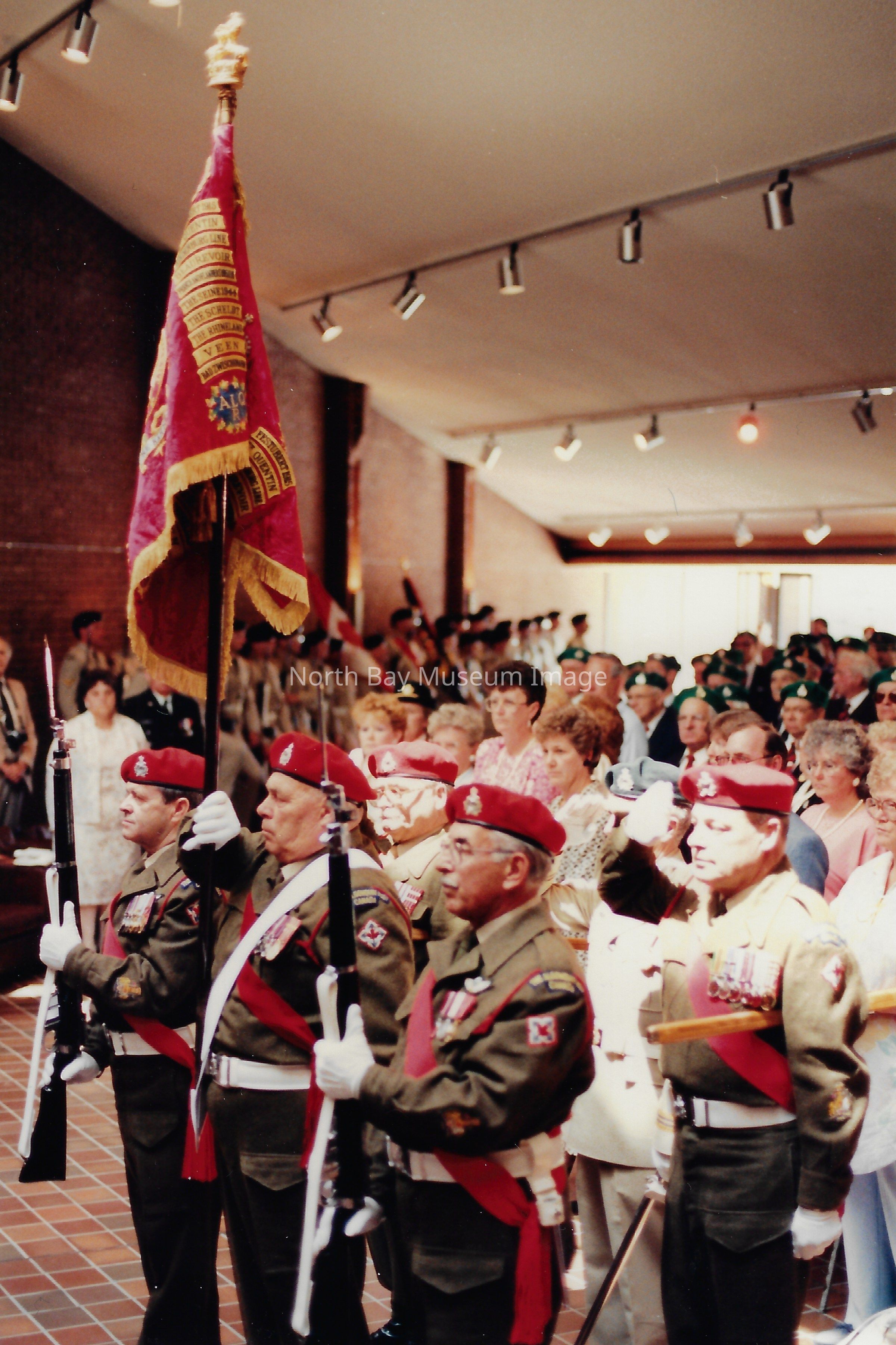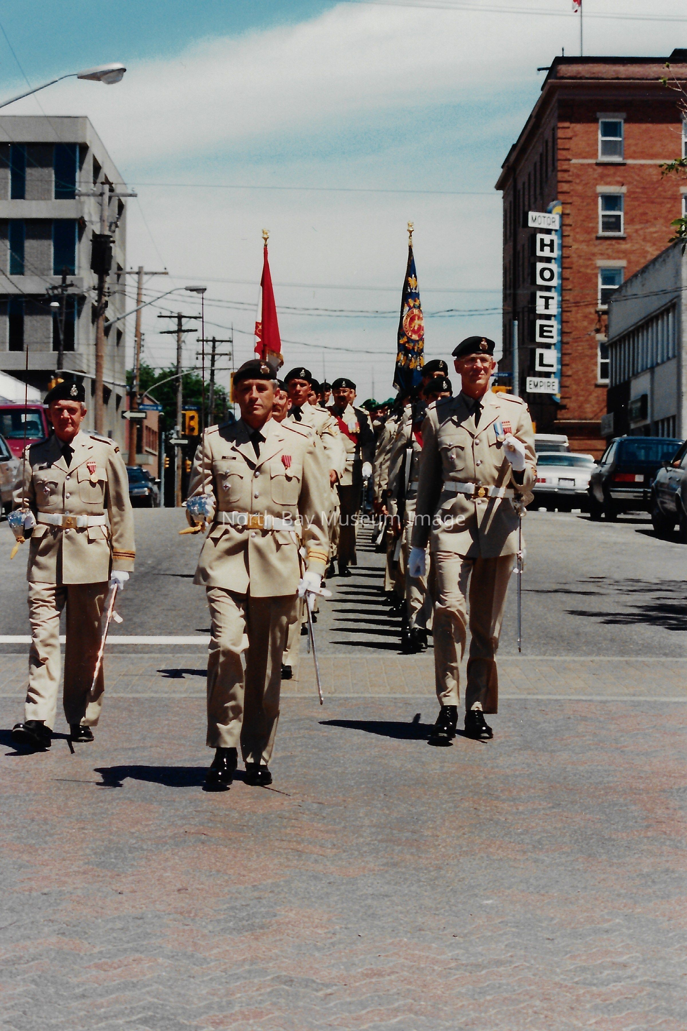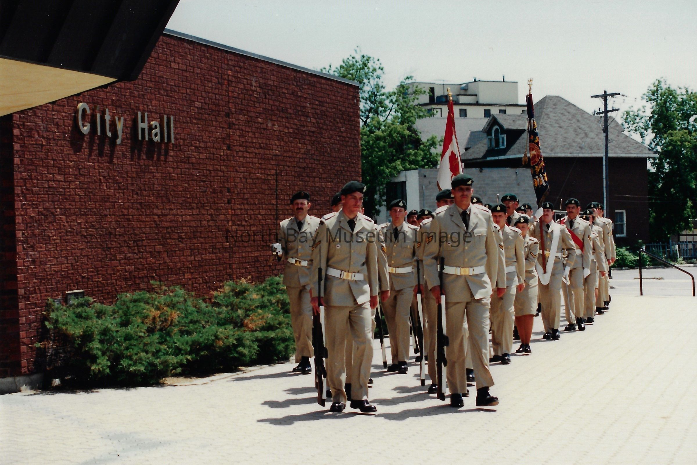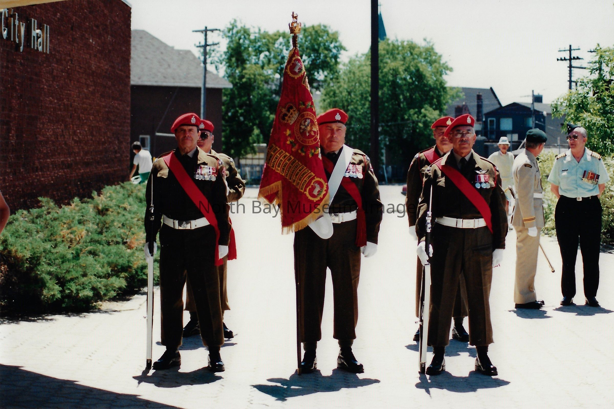 These flags are known as the "Colours" and are symbolically very important. There is a Queen's colour, which represents the regiment's loyalty to the crown. There is also a Regimental Colour, which represents the battle honours of the regiment. The presentation of their colours is a significant event in a Regiment's life. Photos are in front of City hall, in downtown, and inside City Hall.