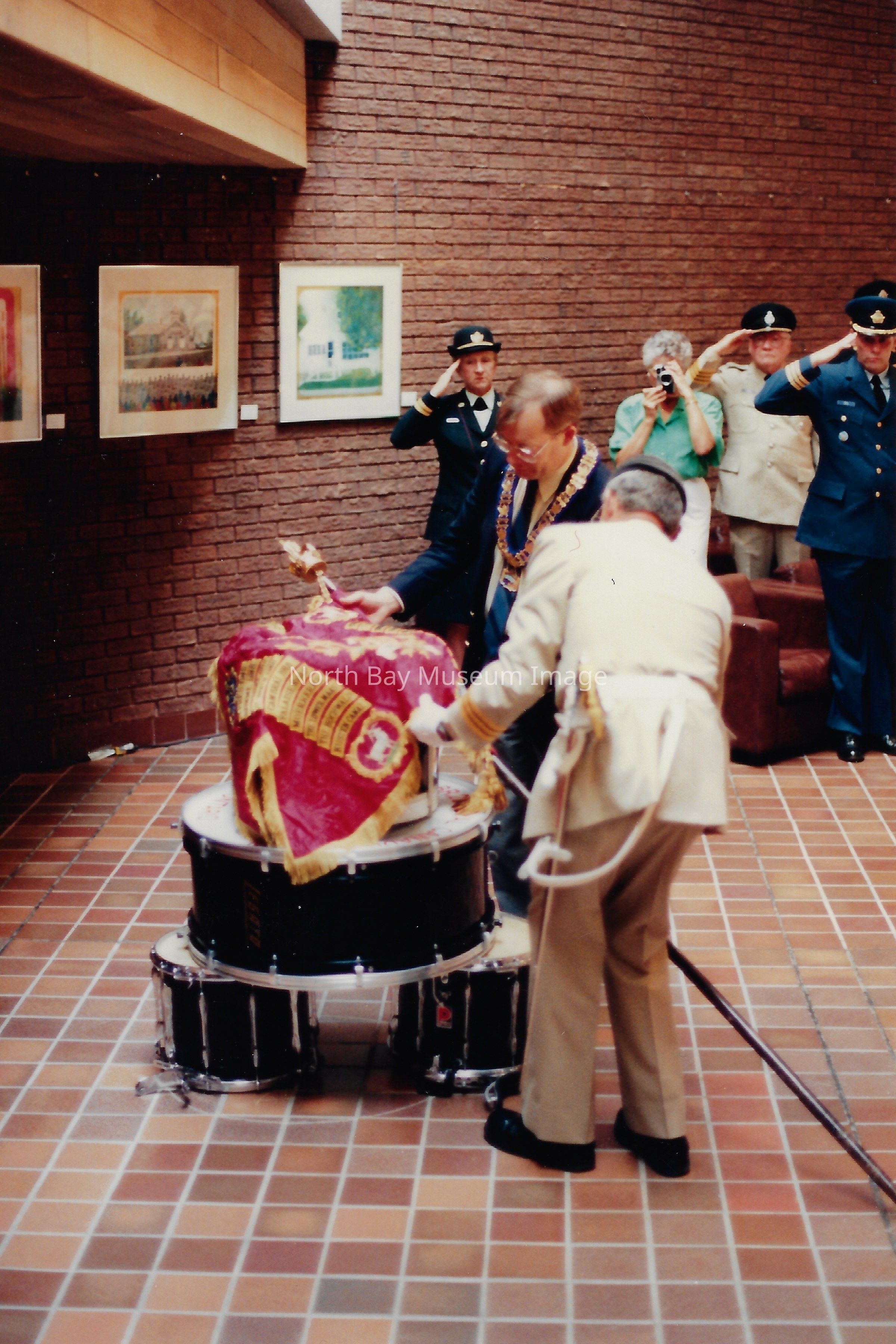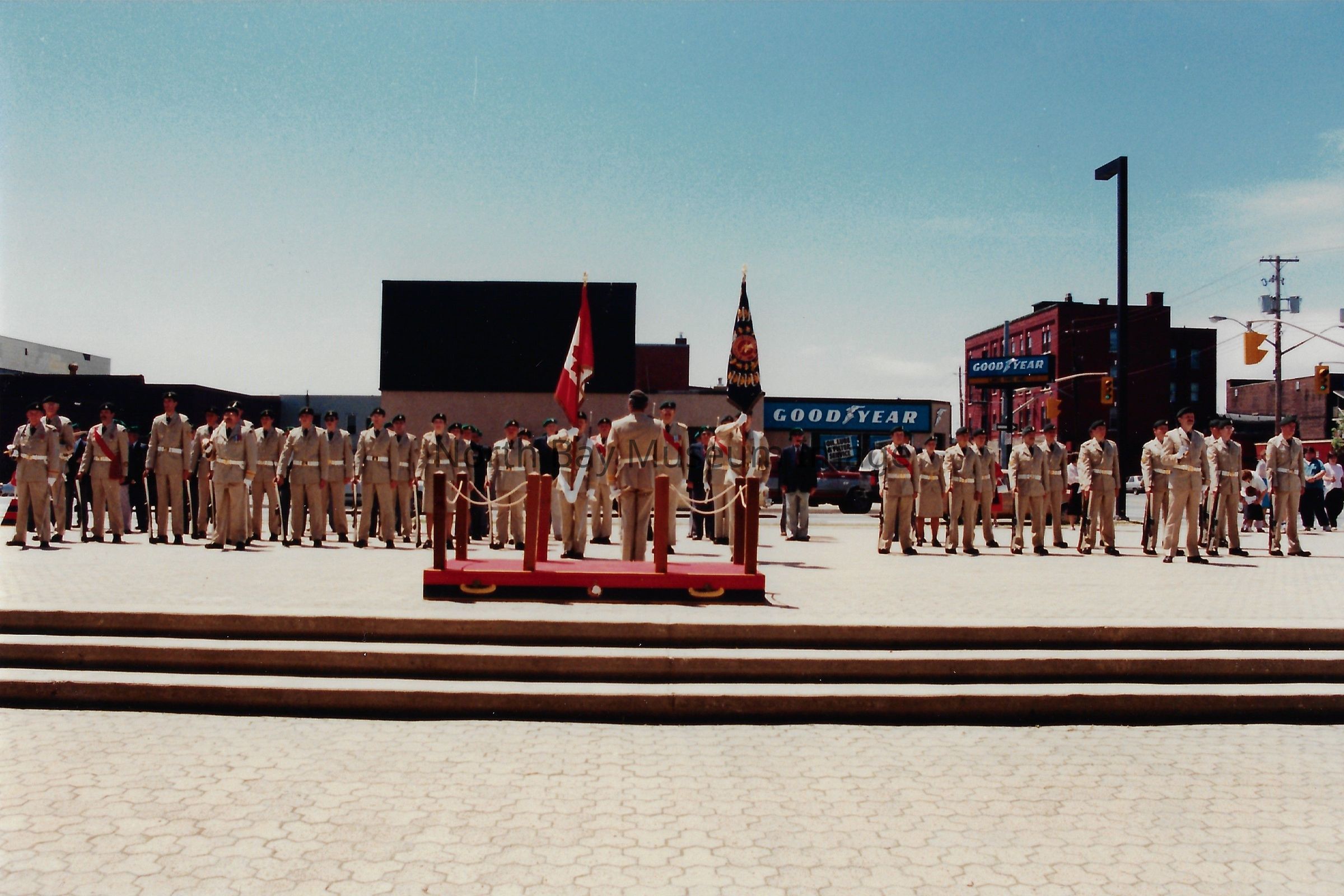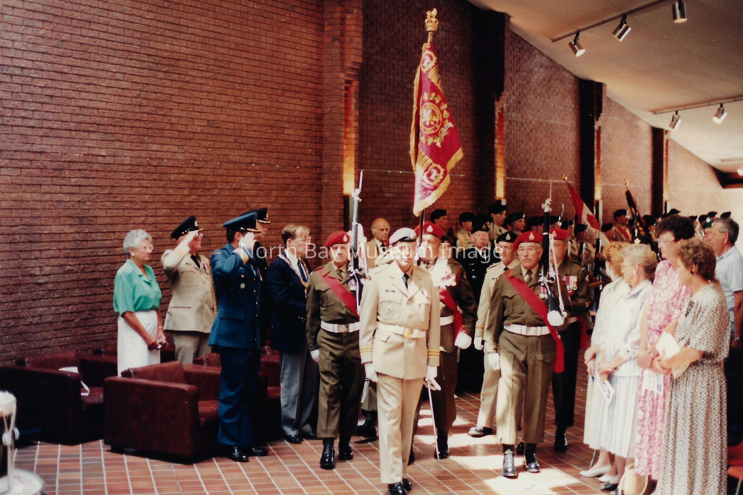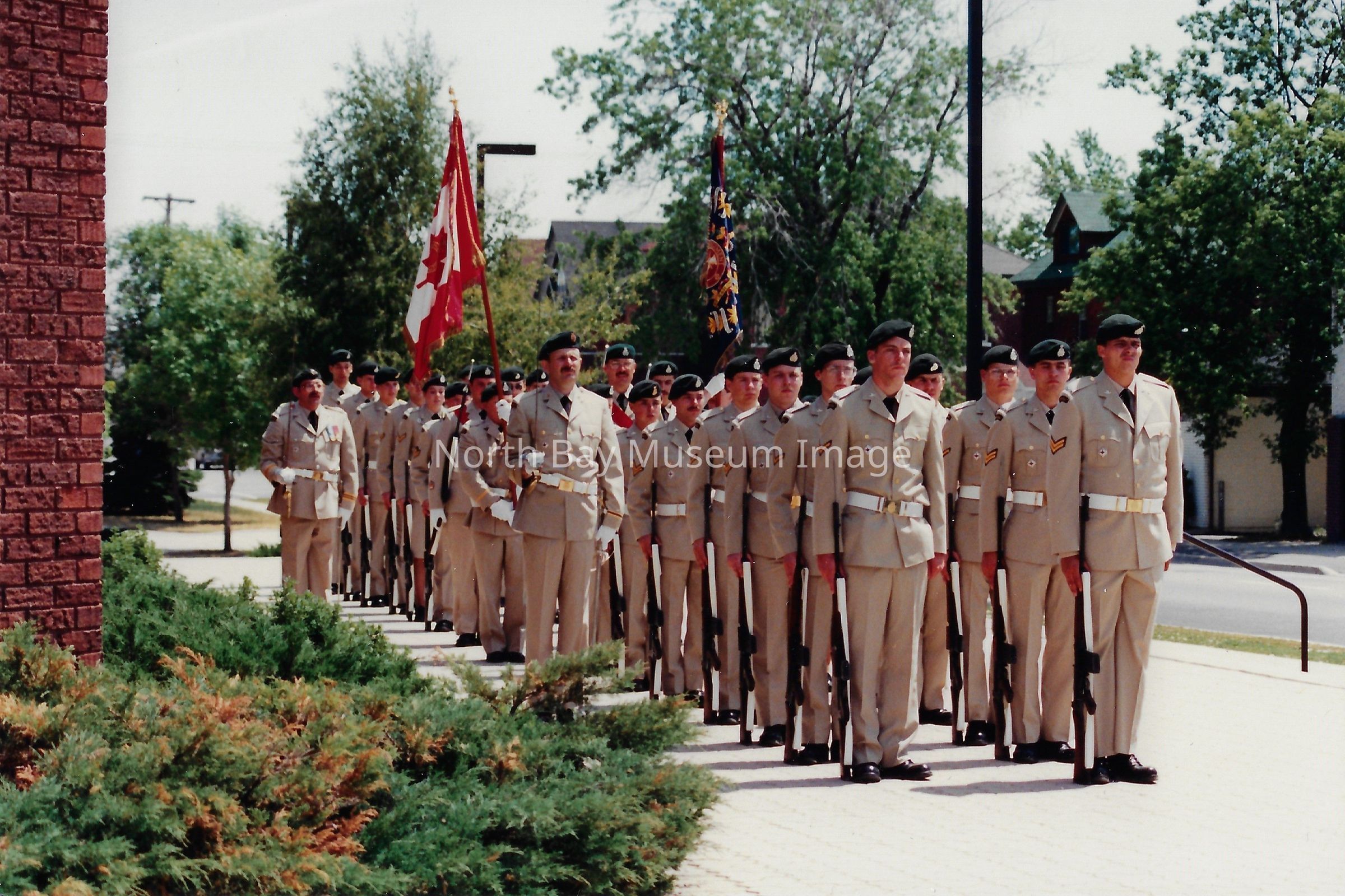 These flags are known as the "Colours" and are symbolically very important. There is a Queen's colour, which represents the regiment's loyalty to the crown. There is also a Regimental Colour, which represents the battle honours of the regiment. The presentation of their colours is a significant event in a Regiment's life. Photos are in front of City hall, in downtown, and inside City Hall.