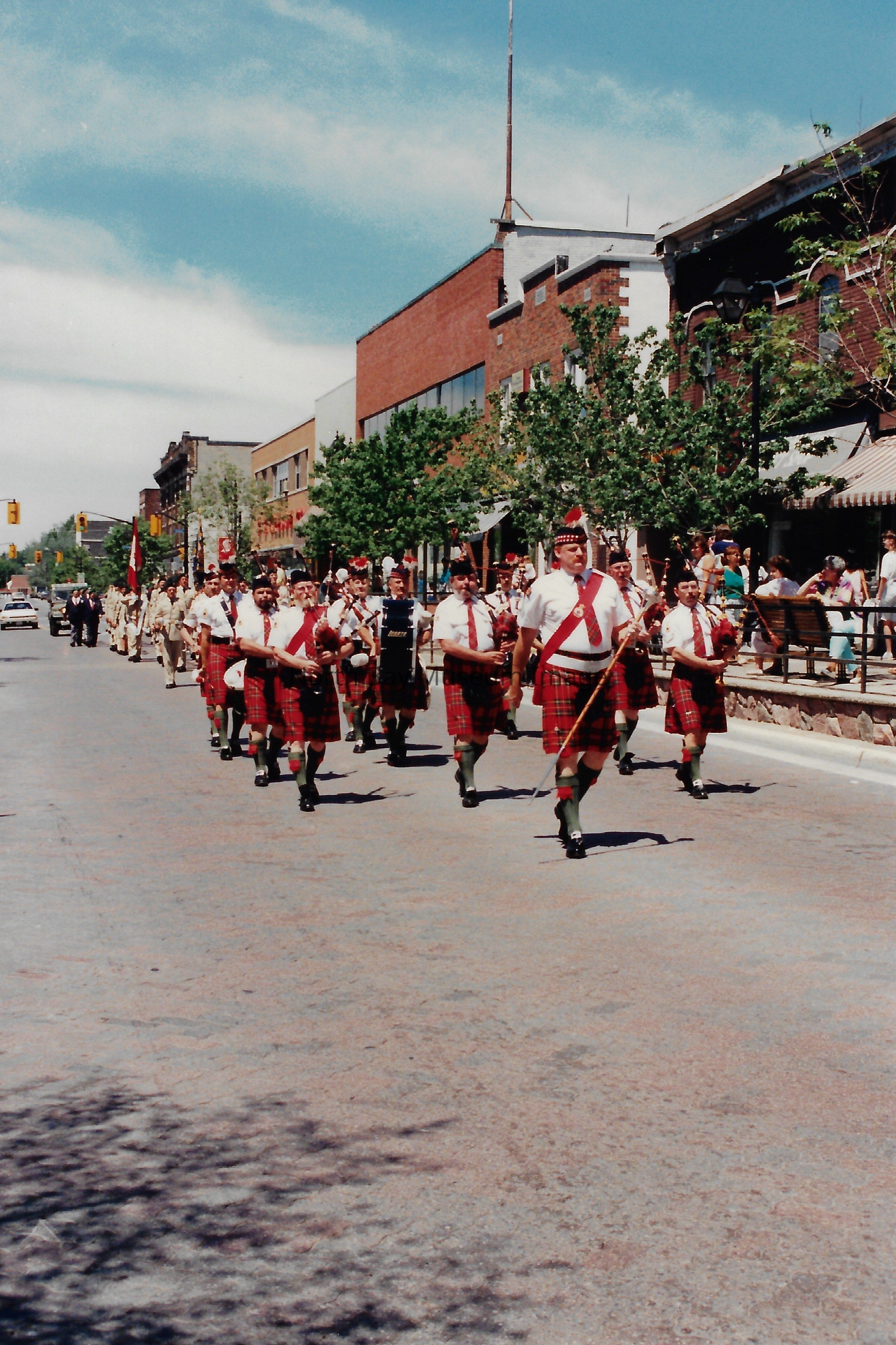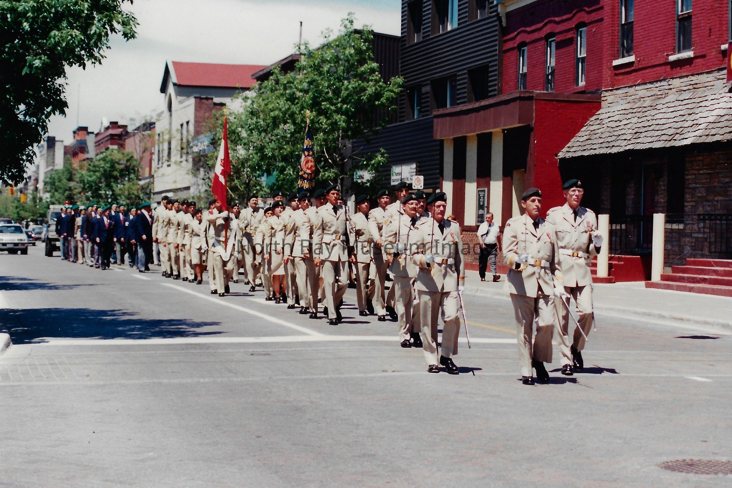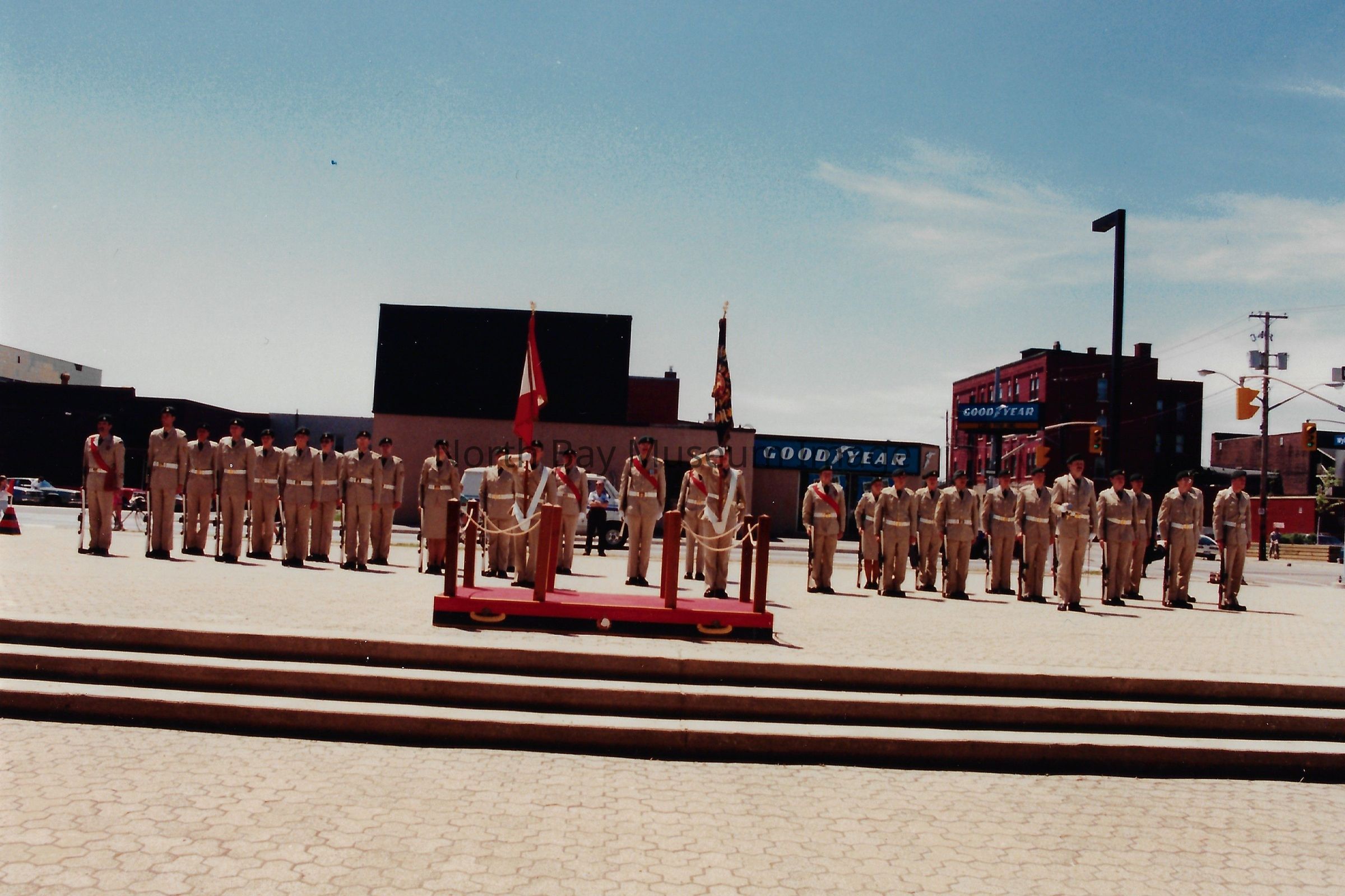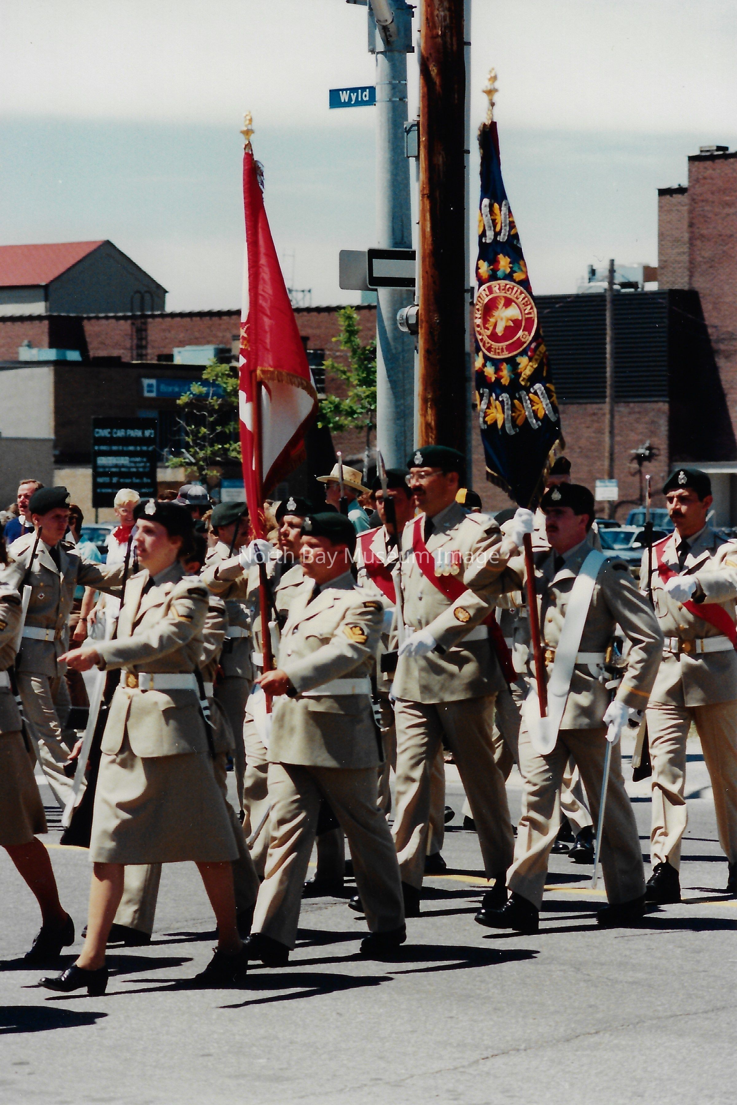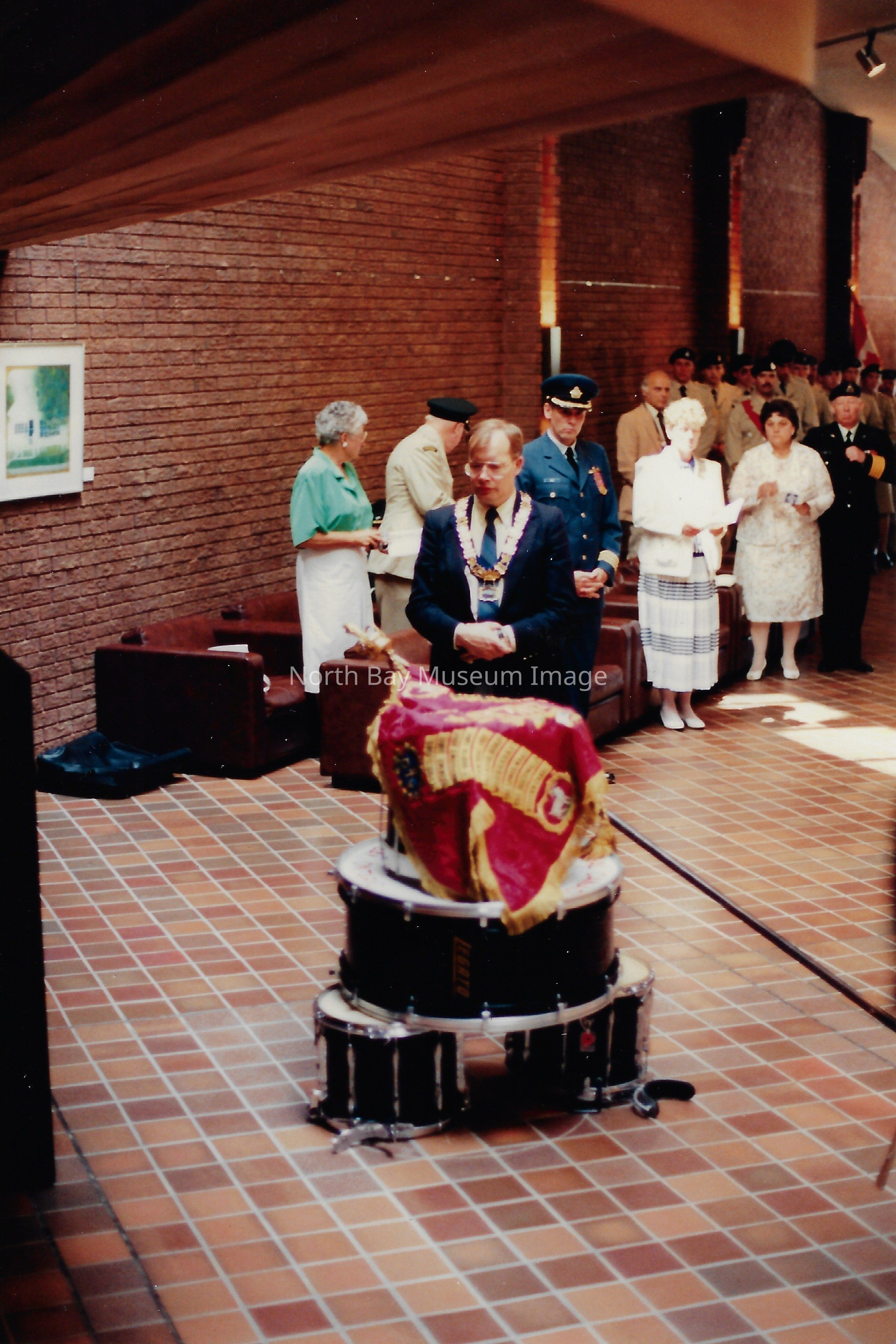 These flags are known as the "Colours" and are symbolically very important. There is a Queen's colour, which represents the regiment's loyalty to the crown. There is also a Regimental Colour, which represents the battle honours of the regiment. The presentation of their colours is a significant event in a Regiment's life. Photos are in front of City hall, in downtown, and inside City Hall.