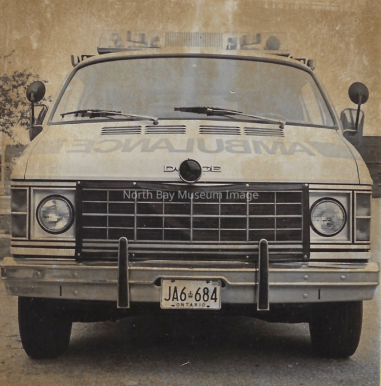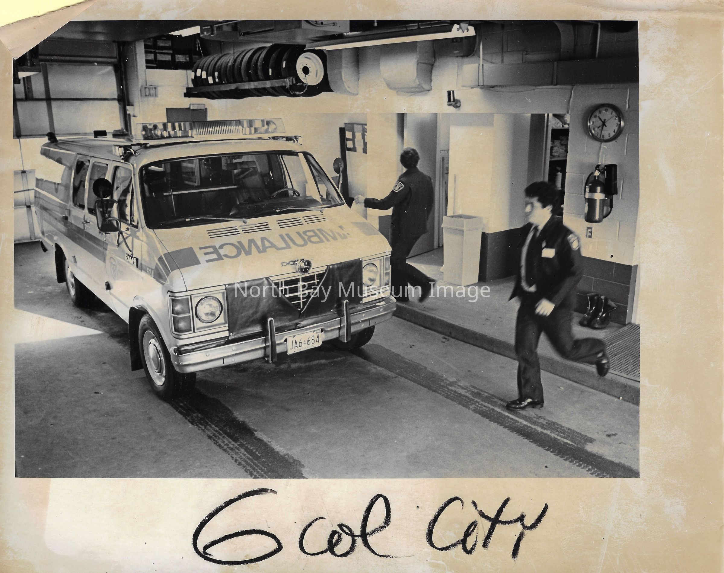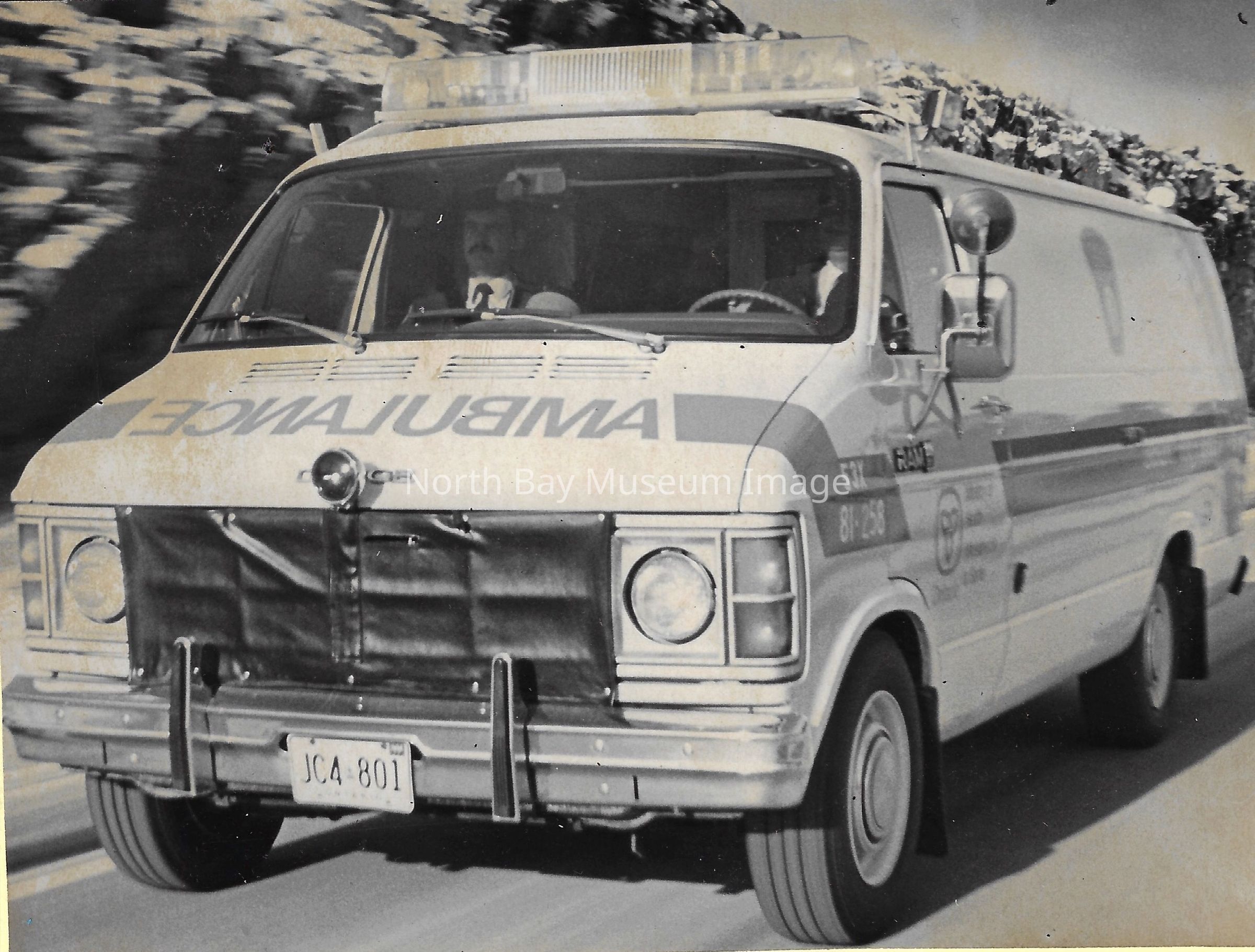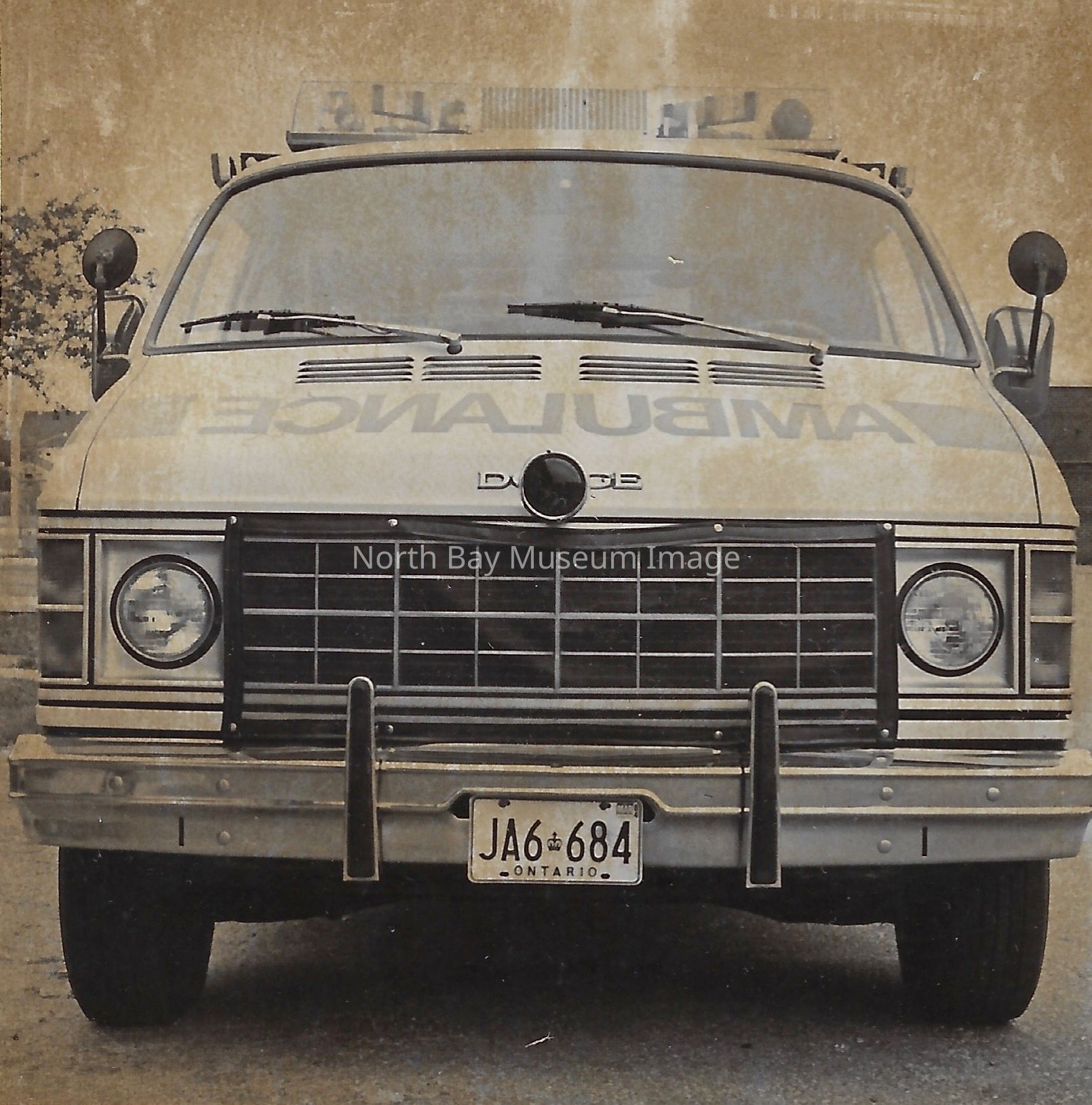 022.01.02 a-d: December 15th, 1974. Black and white photos of Dodge Ram ambulance on the road and in the garage.