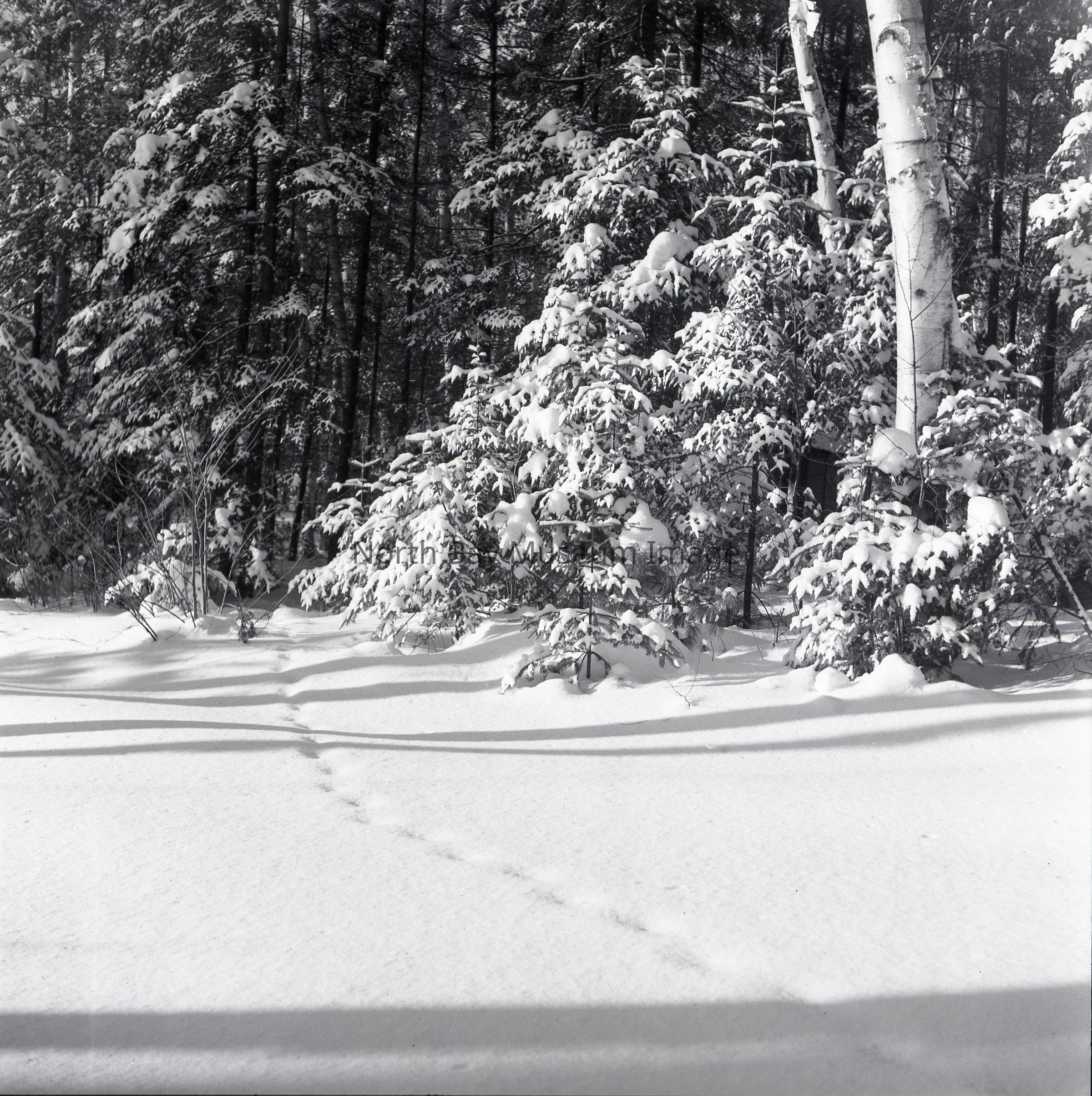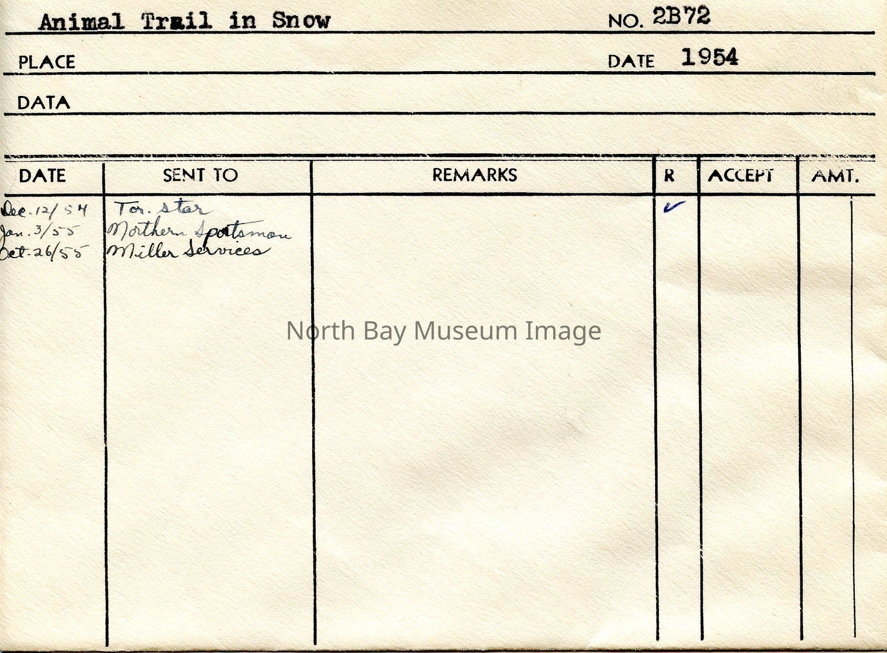 Envelope (a) containing negative (b) of an animal trail in the snow, in wintertime. The negative depicts a clearing with small animal prints leading towards a forest of some type. A part of the Forder Collection. The photographers original number is 2B72. All of the photographs publications are listed on the the envelope.Creator