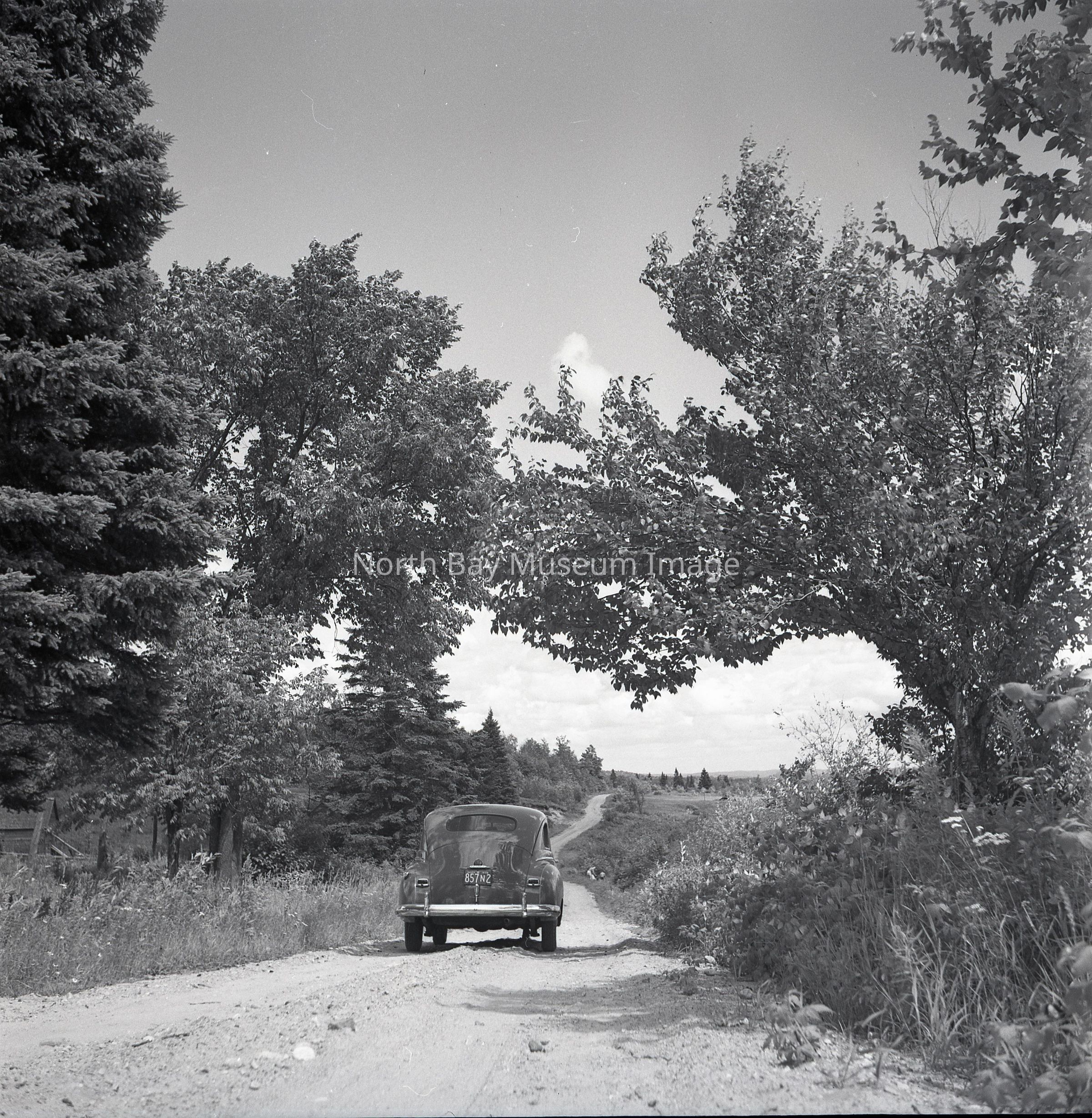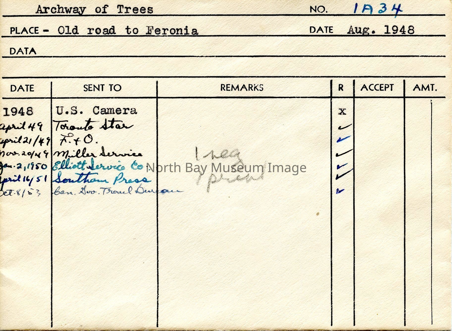 Photographer's envelope (a) contains the photograph and negative (b-c) of an archway of trees on a road towards Feronia. The image shows a car driving on a old road under an archway of trees. The road looks as if it gets winding in the distance. A part of the Forder Collection. The photographers original accession number is 1a34. All the publications of the images are written on the envelope.Creator