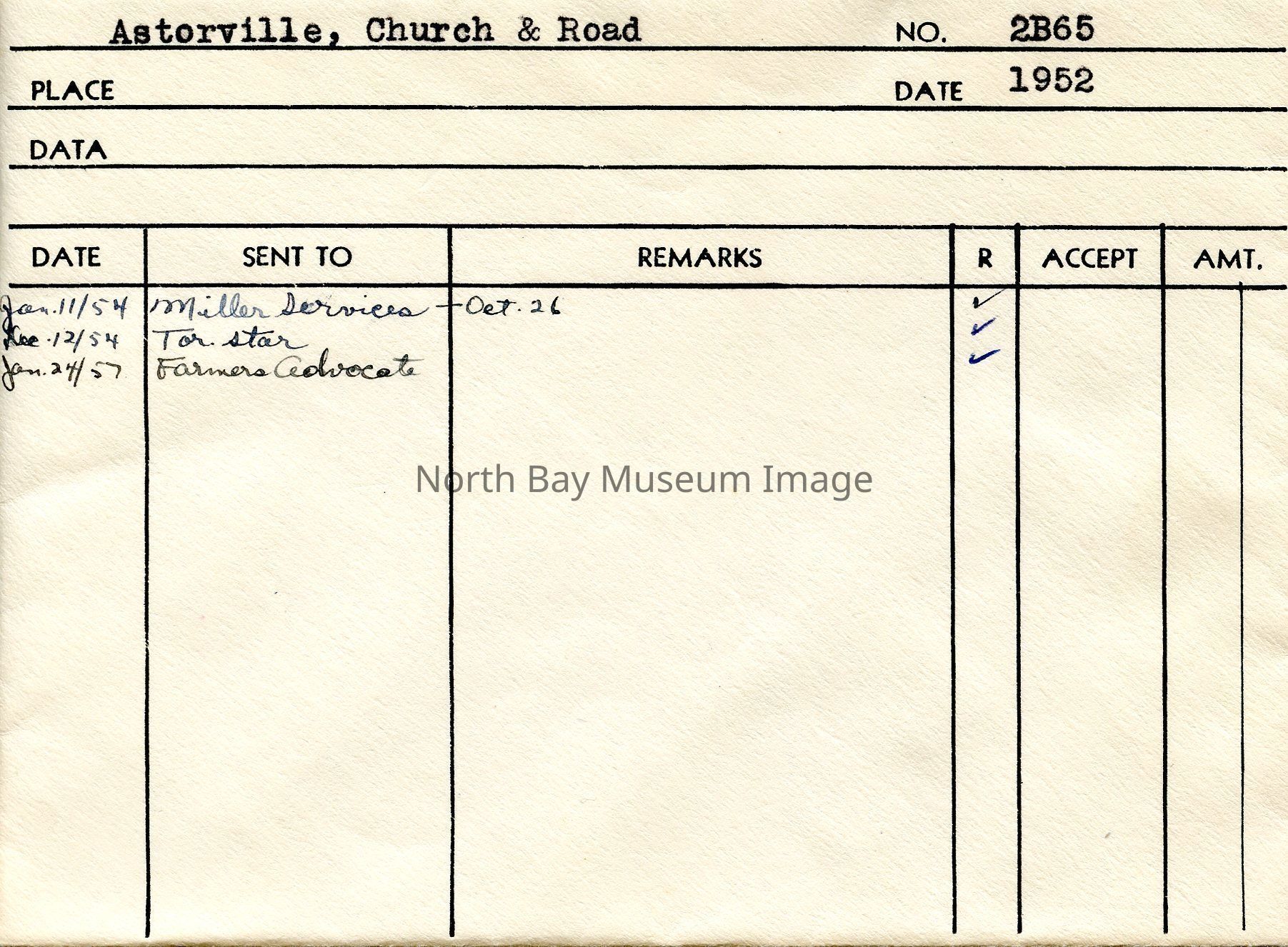 Envelope (a) containing negative (b) of a church in Astorville. The negative shows a church from a side view in the wintertime, there are two individuals walking towards/away from the photographer A part of the Forder Collection. The photographers original number is 2B65. All of the photographs publications are listed on the the envelope.Creator