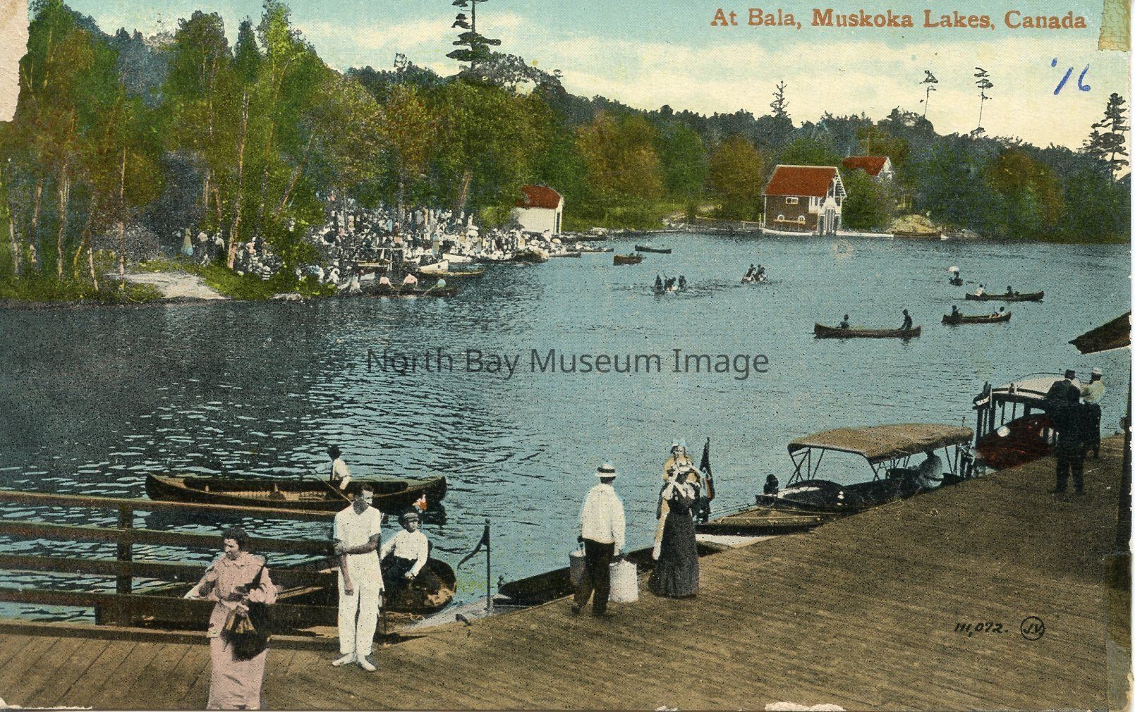 This is a coloured postcard of Bala Lake in Muskoka Lakes, Canada. It appears to be a calm day with many people nulling about. There are several boats in the water. A hill across the lake seems to be a picnic area among the many trees, with lots of people enjoying themselves. At the far end of the lake is a two-story boat house, and home. There is a wooden walking path with a bridge to cross to the other side is in the foreground, with canapied boats docked along side.