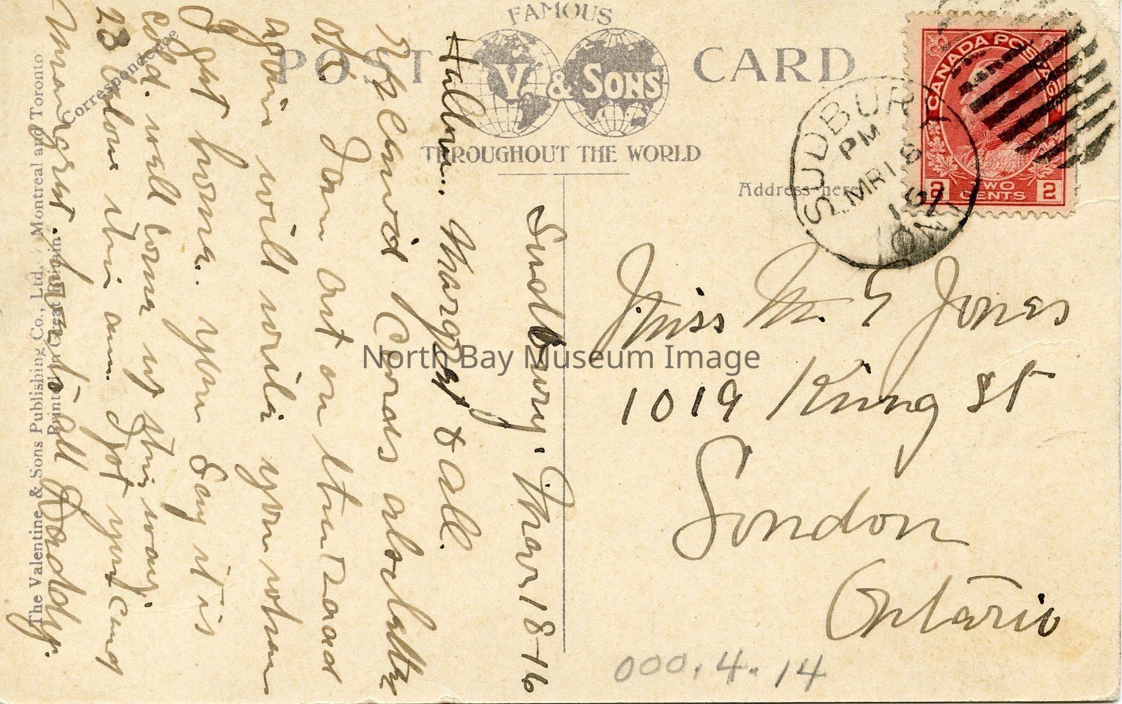 The back of the postcard has a few words written to Margret from Daddy. The postmark is from Sudbury, Ont, with a black cancelled mark across the red 2cent stamp. On the lower right corner are the #'s 111,027 followed by the letter J.Y. inside a small circle.Creator