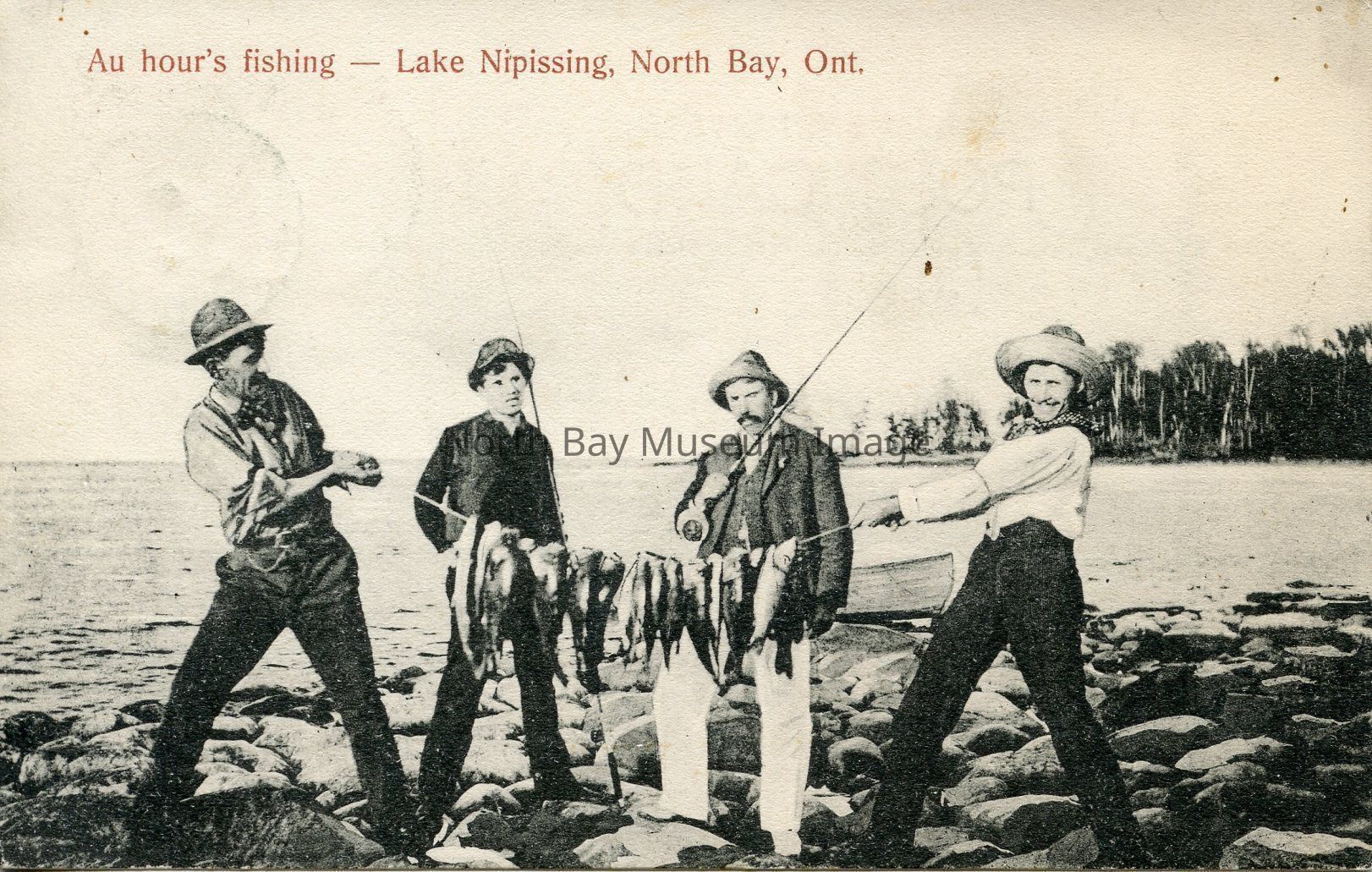 This is a Posed black & white painted postcard of four men, holding a line with many fish on it. The lake is in the background along with fir trees. There are also men standing on rocky shore with the prow of a small boat behind them. Two men in centre are holding fishing rods.