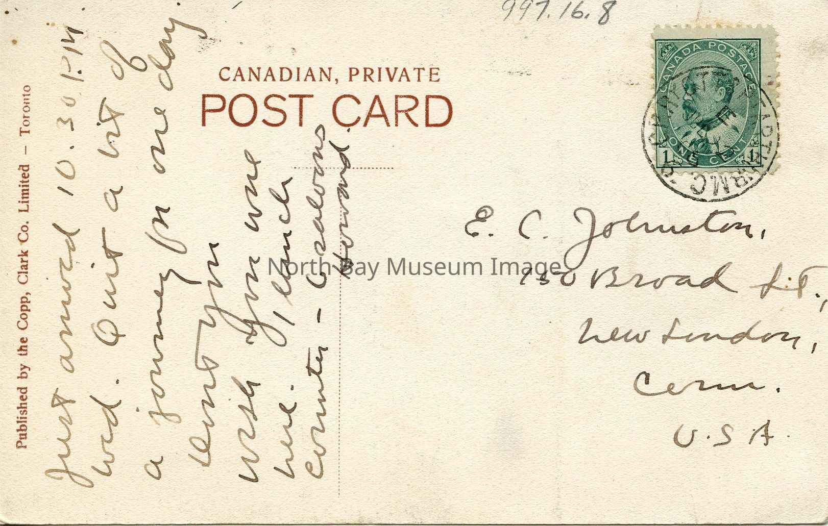 On the back of the post card there is a one cent stamp with picture of King George V on it. The Cancel stamp has "Cpry ct.. Pt. Arthur M.C." wirten on it. At the centre near top is the words Canadian Private Postcard.Creator