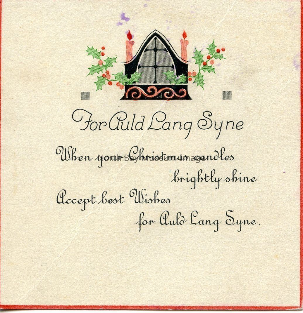 The card is a beige. There is a black church illustration with a window with green holly and red candles on each side in the middle of the card. there is a poem on the center of the card reading "For Auld Lang Syne, when your Christmas candles brightly shine, accept best wishes for Auld." Lang Syne. The card has a red boarder all around the card.