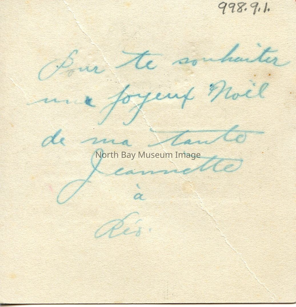 On back, written in French in blue ink is, "Pous te souhaiter une Joyeux Noel de ma toute, Jeannette a' Re'o."