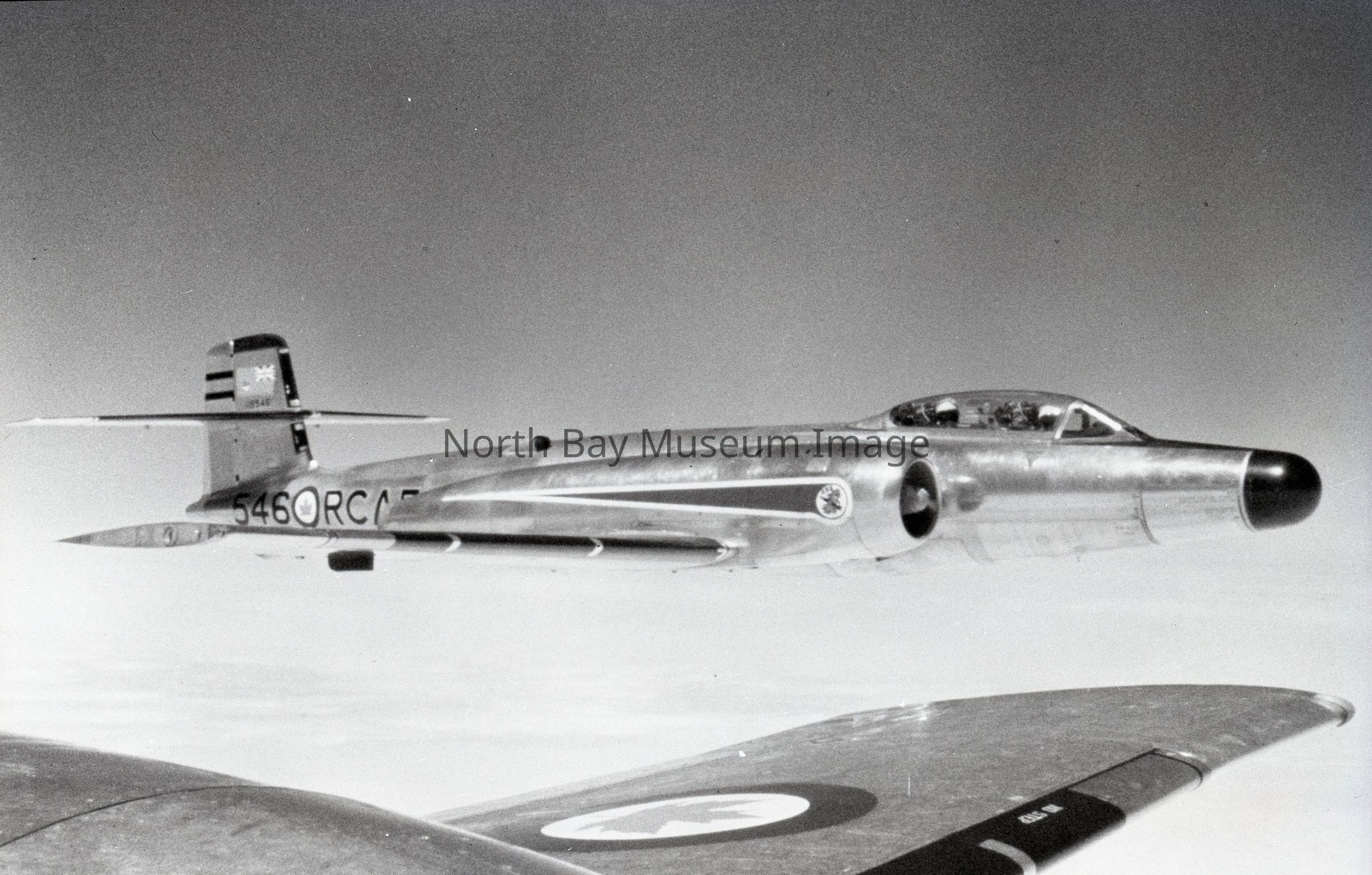 Image of Avro Canada CF-100 Canuck in flight. This photo appears to be taken in the sky by another airplane. This is a part of the William Forder collection.Creator