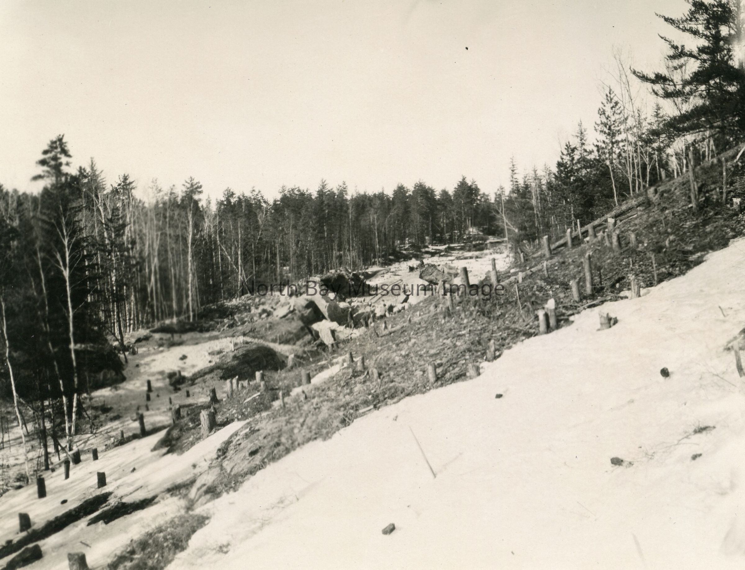 Print, Photographic - black and white photograph - shows a snow-covered hillside - tree stumps (of trees obviously sawed down) litter the hillside
