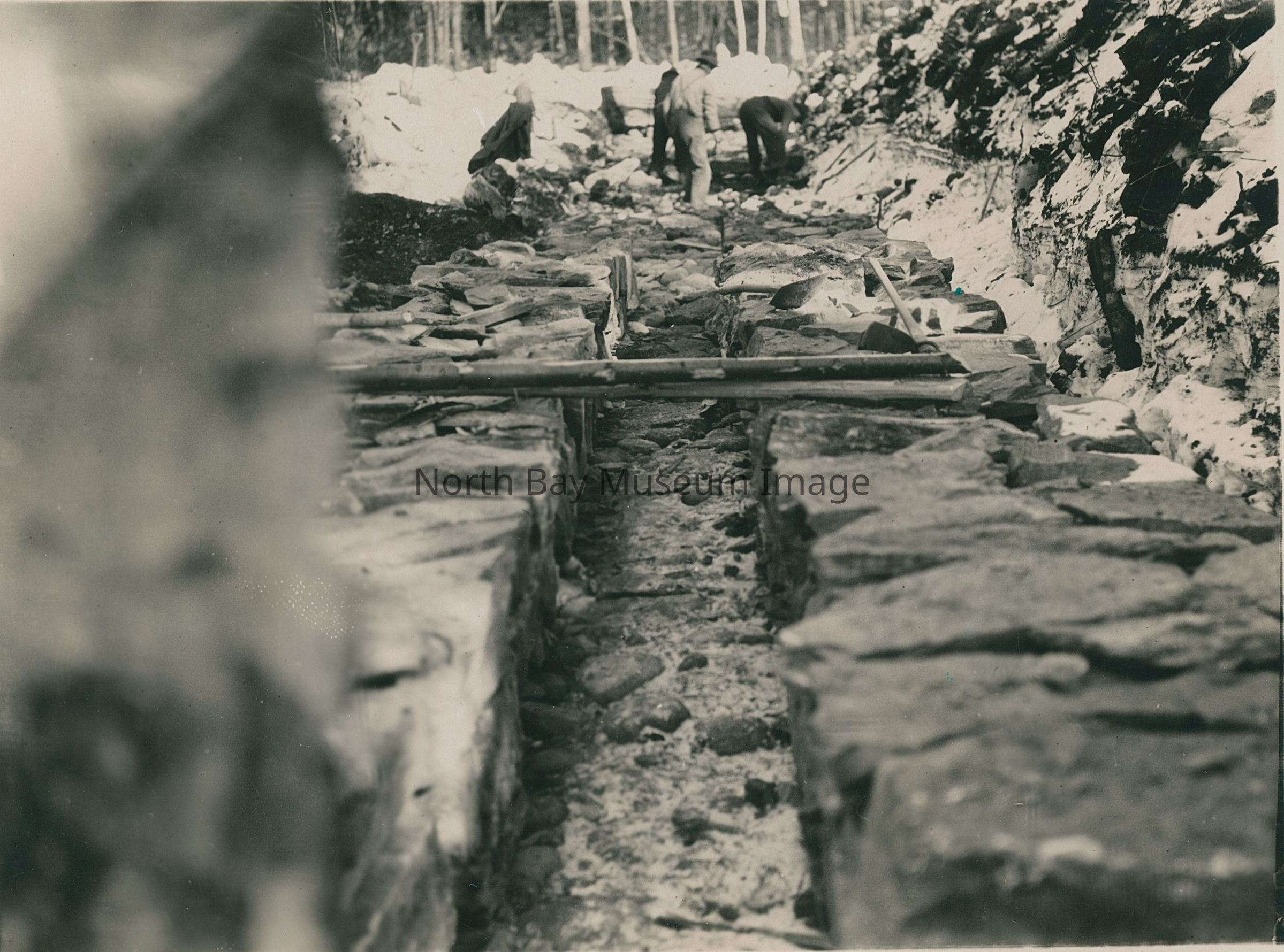 Print, Photographic - black and white photograph - shows rock bed being laid - men working in the background